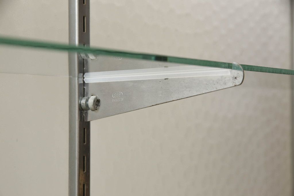 棚板は取り外しできます。棚板は2枚あります。棚受けは2ヶ所、25mmピッチで調整できます。棚幅サイズのものが1枚の作りです。