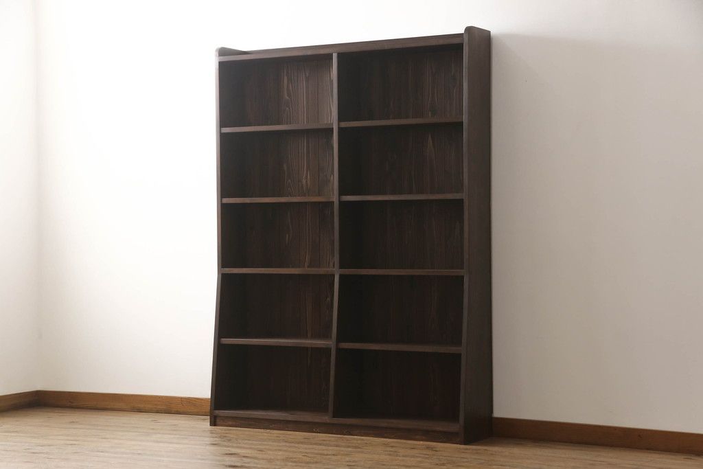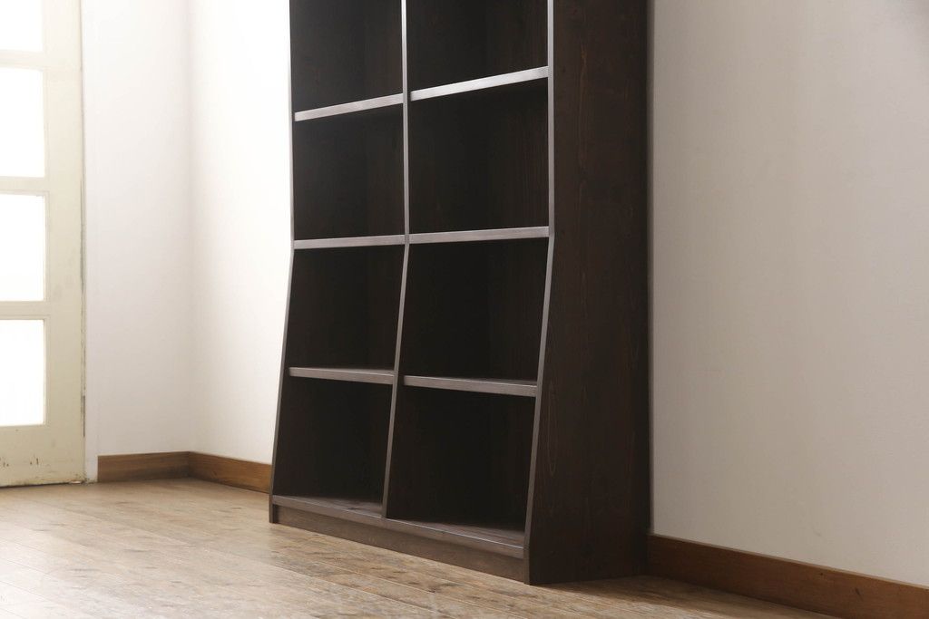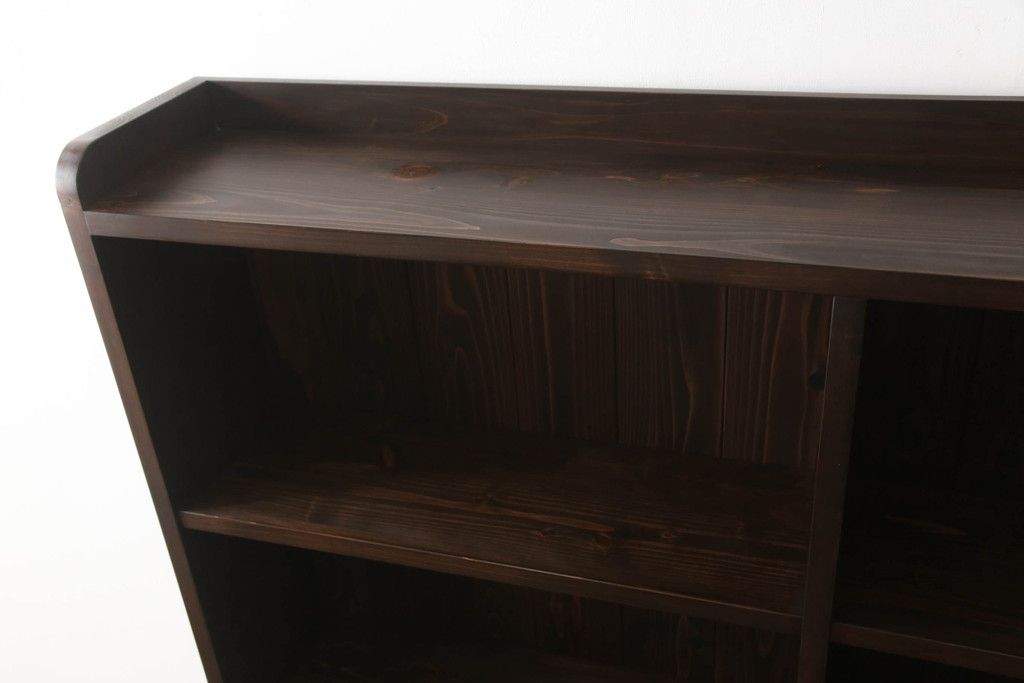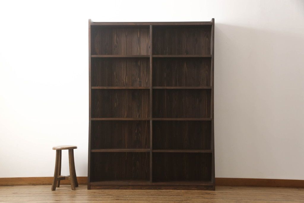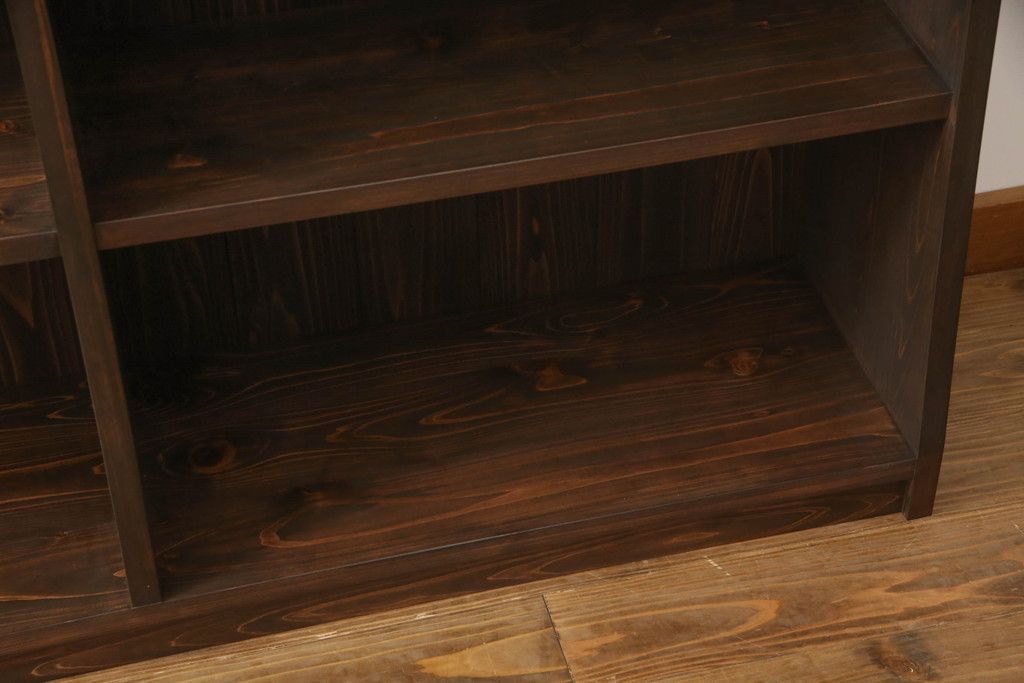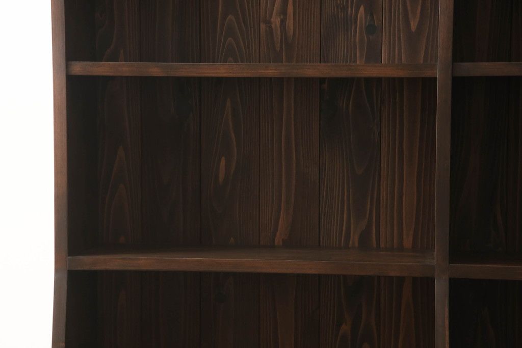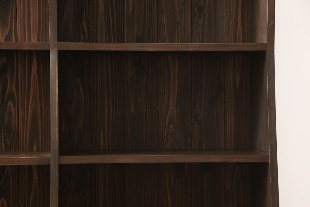 オープンラック・シェルフ> ディスプレイラック > 本棚を新規製作!希望のサイズ、棚5段のデザインで。背板側下方に巾木用の切り欠き加工を施し、当店商品を参考に着色。(ブックシェルフ、収納棚、ウッドシェルフ、オープンラック、飾り棚、陳列棚)