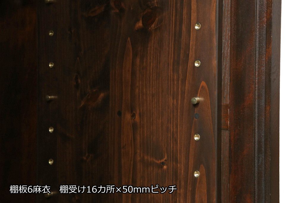 棚板は取り外しできます。棚板は6枚あります。棚受けは16ヶ所、50mmピッチで調整できます。棚幅サイズのものが1枚の作りです。