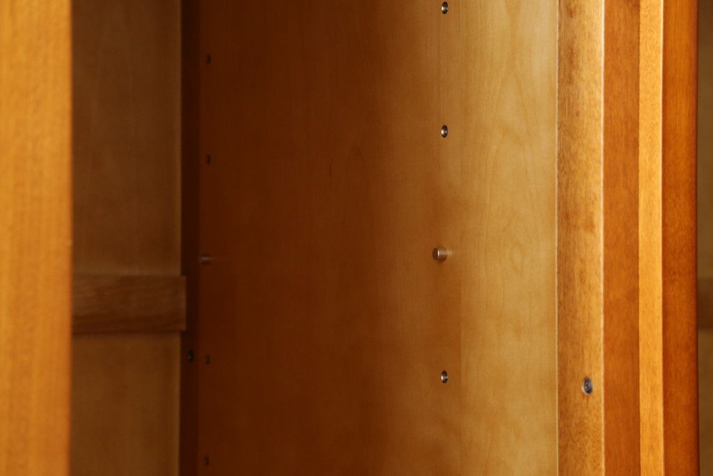 取り外せるのは棚板は左4枚、ポールは右1本です。棚受けは左15ヶ所、右3ヶ所、各80mmピッチで調整できます。棚幅サイズのものが1枚の作りです。