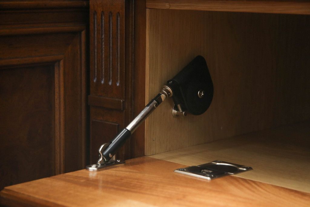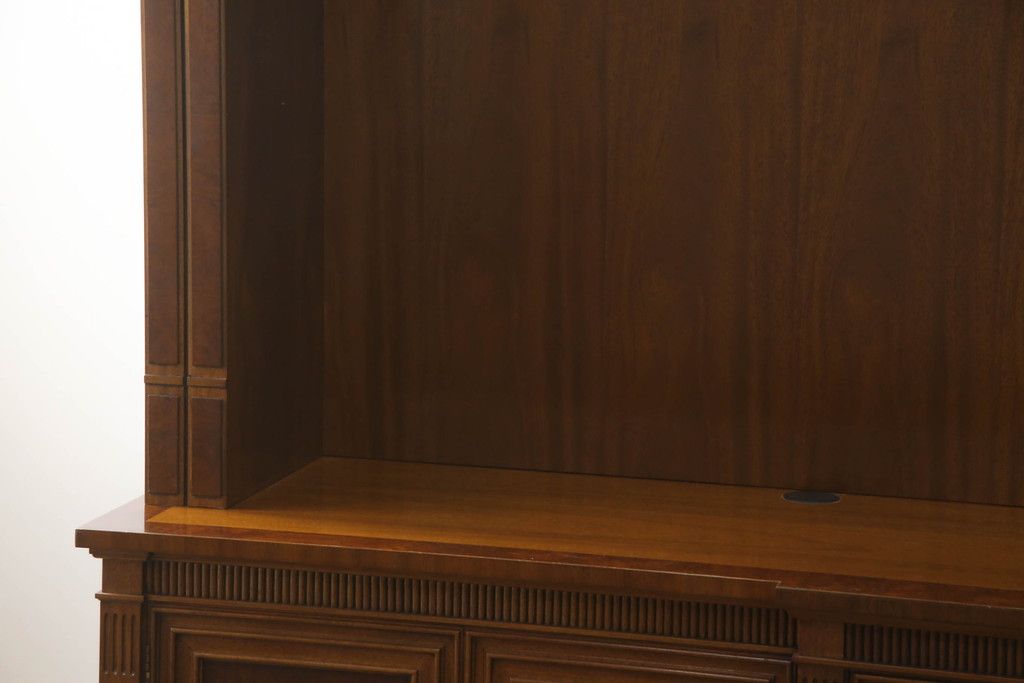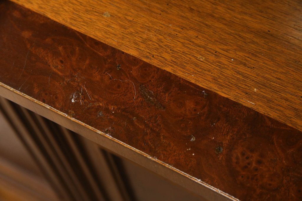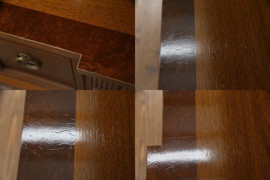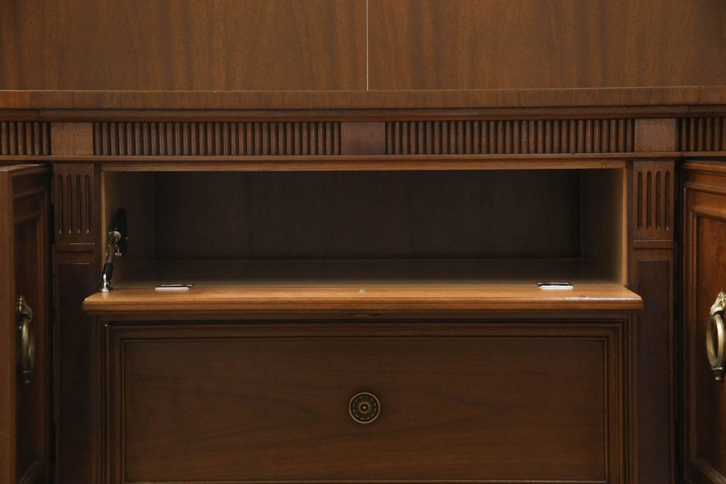 セミオーダー家具実績 > ドレクセルヘリテイジの大型キャビネットをリペア&カスタム!テレビを設置できるよう上段の棚を取り除き、装飾を移設。引き出しはフラップダウン式に加工。(テレビ台、AVボード、収納棚、戸棚)