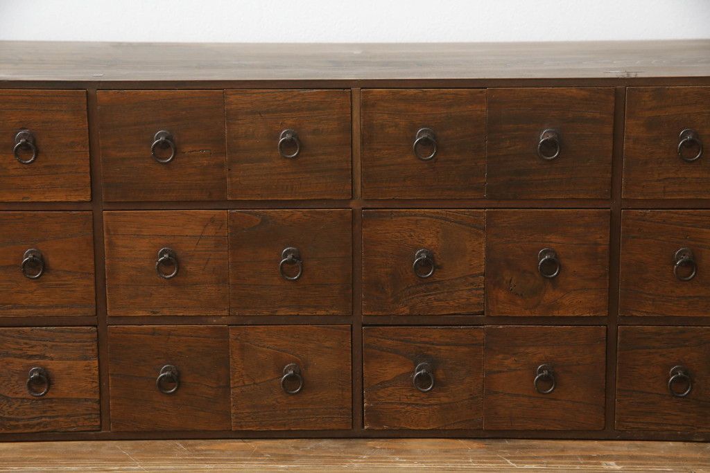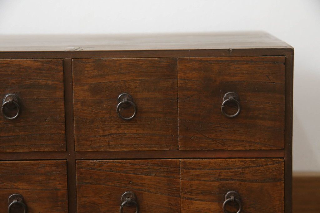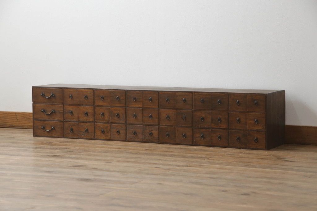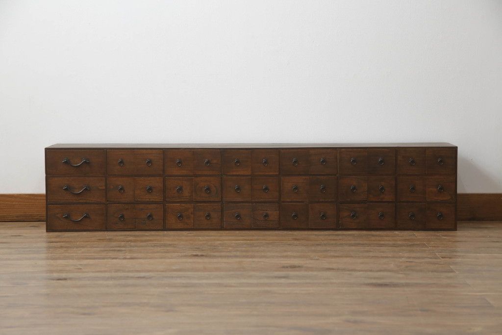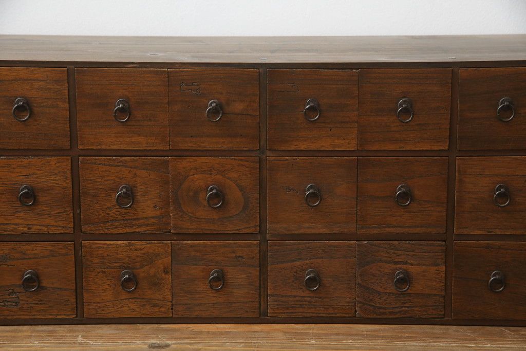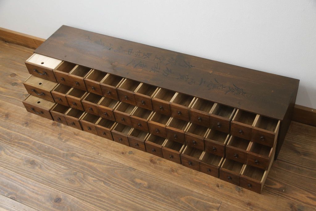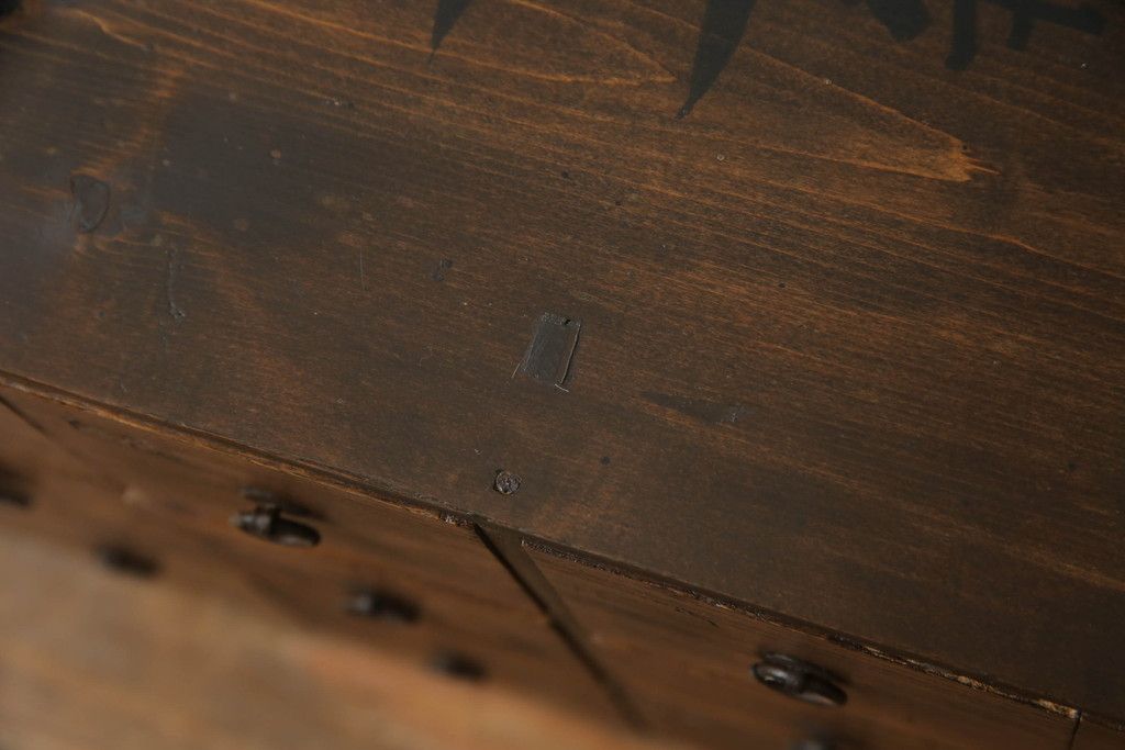 チェスト・引き出し> ローチェスト > 薬箪笥をリペア&カスタム!高品質リペアを施し、天板の墨書きは残したままに1トーン落ち着いた色味に着色仕上げ。(薬タンス、小間物箪笥、百目箪笥、引き出し、小物収納、店舗什器、ローチェスト、ドロワーチェスト)