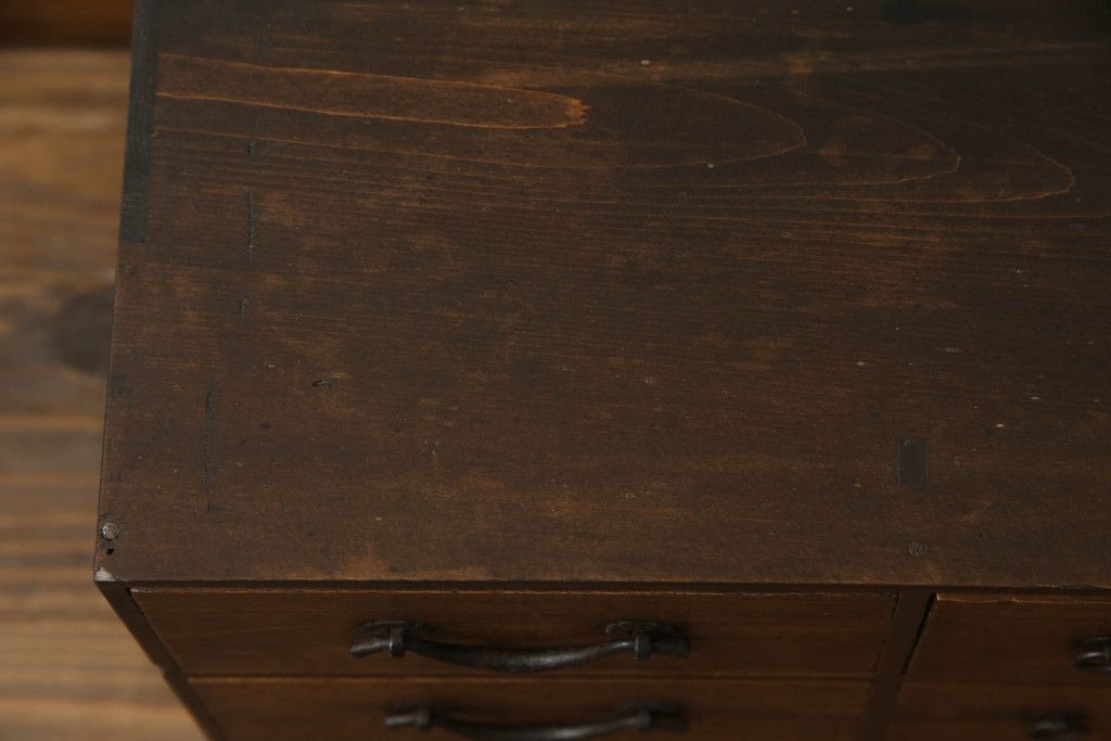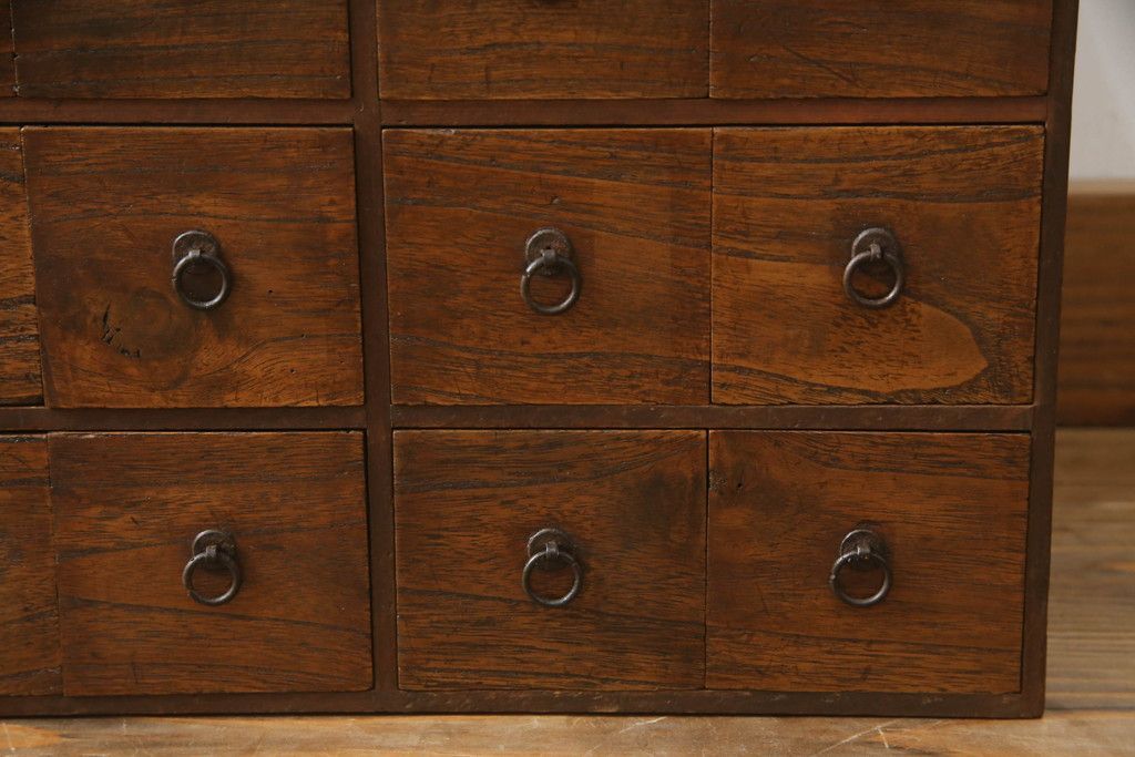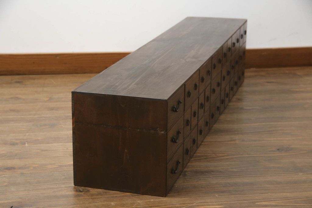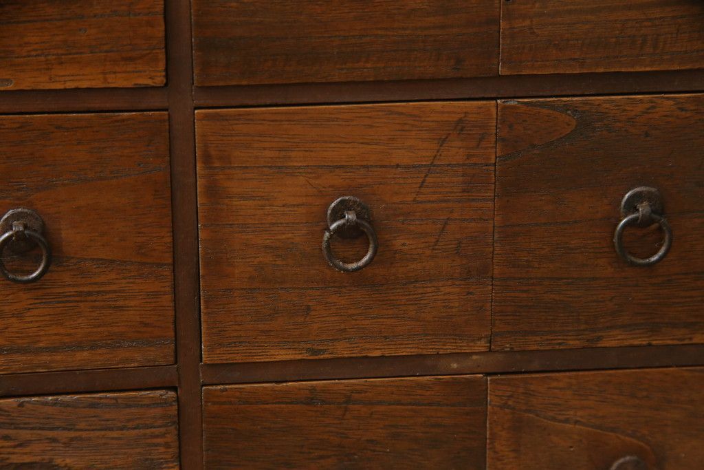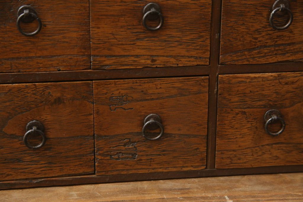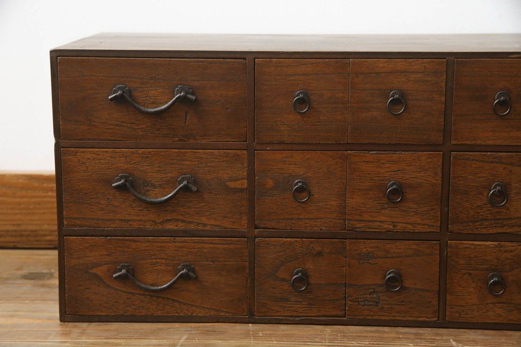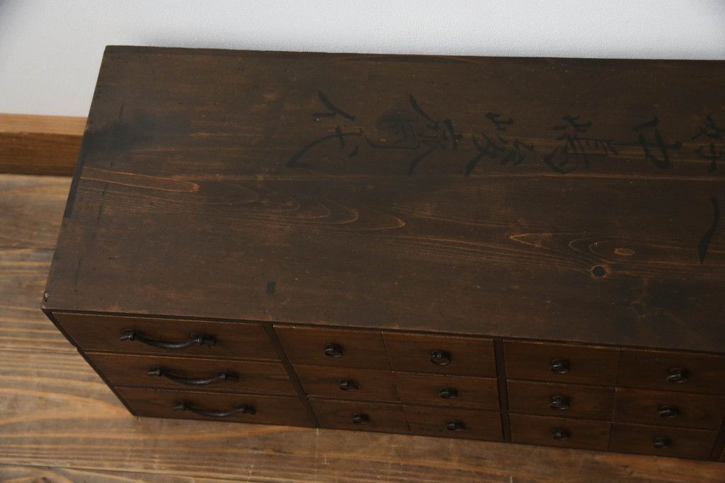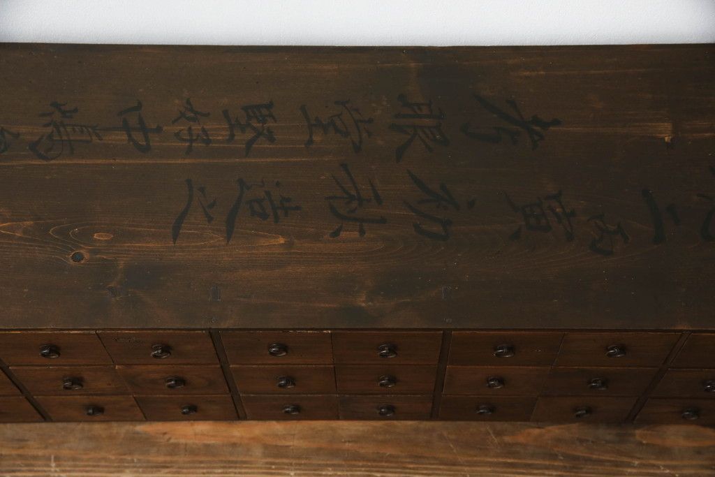 店舗什器 > 薬箪笥をリペア&カスタム!高品質リペアを施し、天板の墨書きは残したままに1トーン落ち着いた色味に着色仕上げ。(薬タンス、小間物箪笥、百目箪笥、引き出し、小物収納、店舗什器、ローチェスト、ドロワーチェスト)