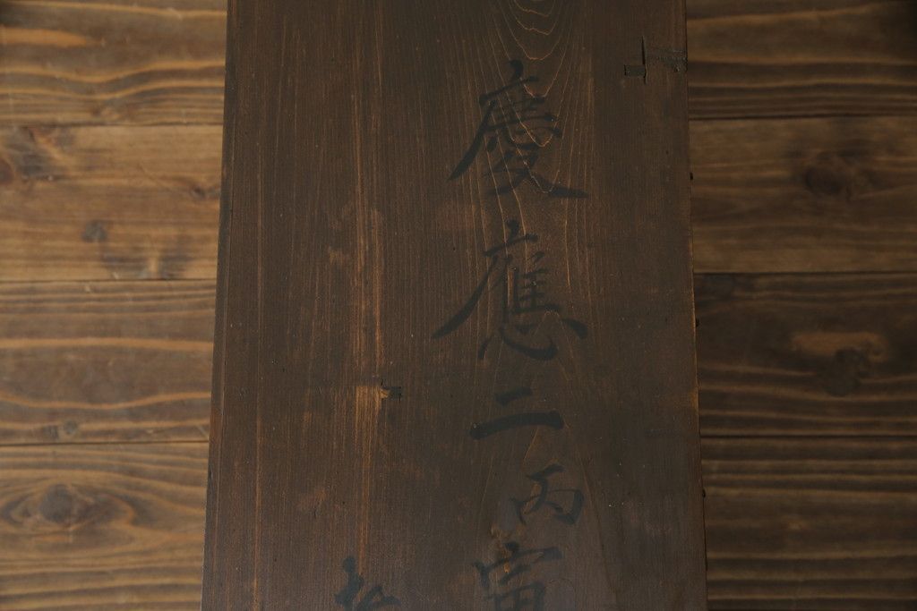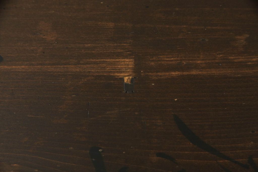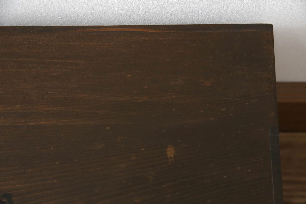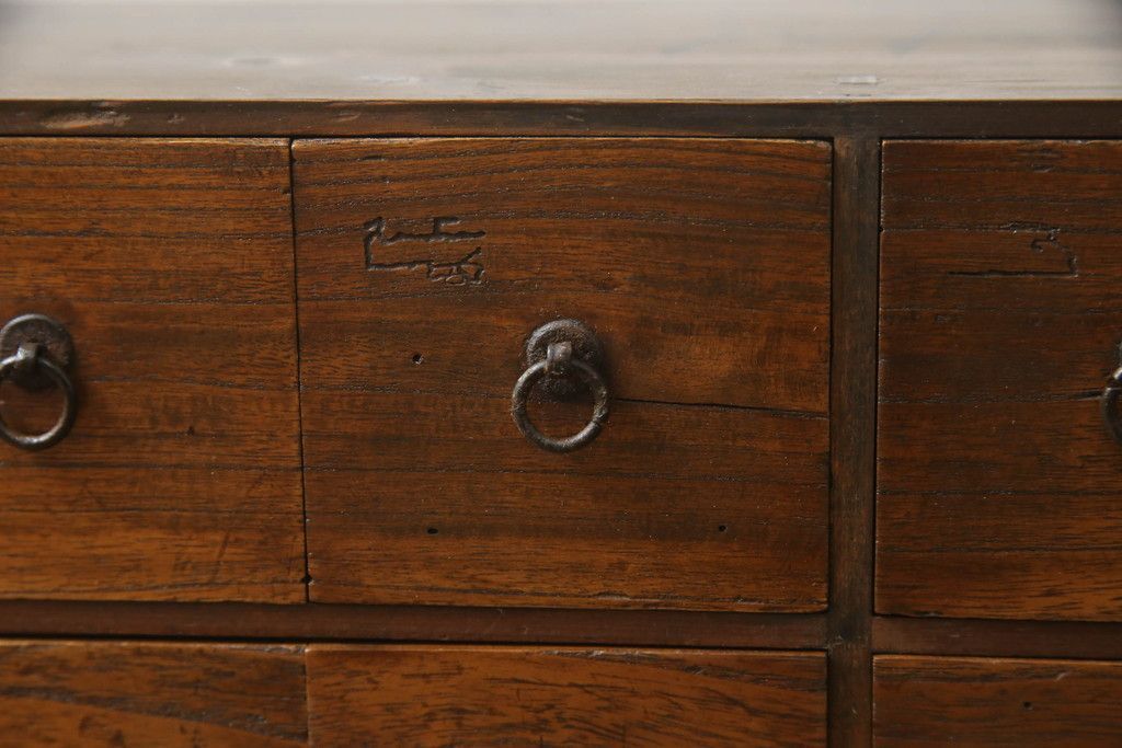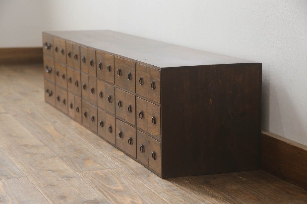 キャビネット・戸棚> テレビ台・ローボード > 薬箪笥をリペア&カスタム!高品質リペアを施し、天板の墨書きは残したままに1トーン落ち着いた色味に着色仕上げ。(薬タンス、小間物箪笥、百目箪笥、引き出し、小物収納、店舗什器、ローチェスト、ドロワーチェスト)