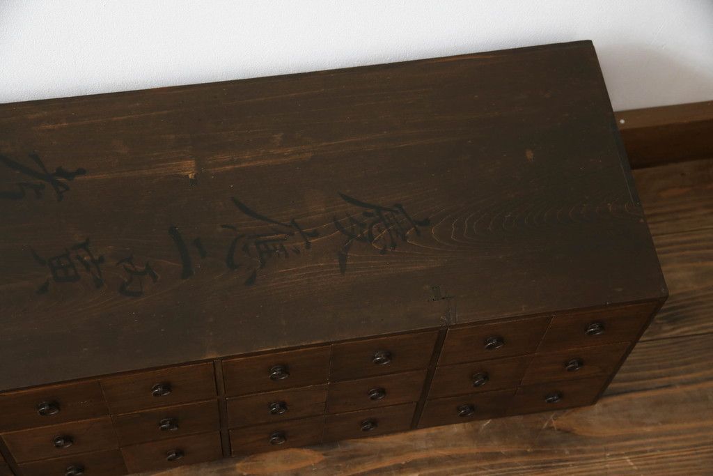 和箪笥> 薬箪笥 > 薬箪笥をリペア&カスタム!高品質リペアを施し、天板の墨書きは残したままに1トーン落ち着いた色味に着色仕上げ。(薬タンス、小間物箪笥、百目箪笥、引き出し、小物収納、店舗什器、ローチェスト、ドロワーチェスト)