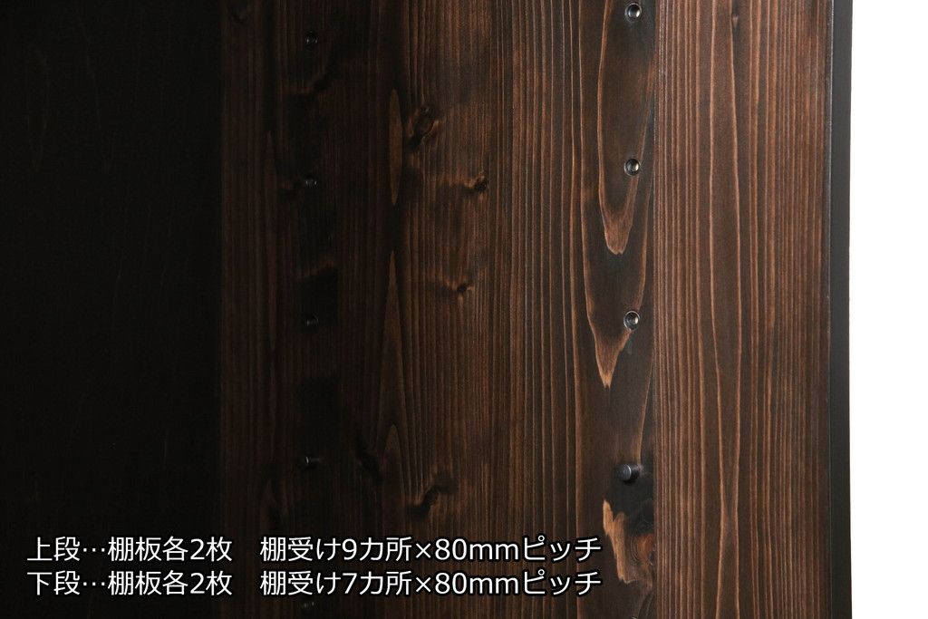棚板は取り外しできます。上段・下段ともに棚板は各2枚あります。棚受けは上段9ヶ所、80mmピッチ、下段7ヶ所、80mmピッチで調整できます。棚幅サイズのものが1枚の作りです。