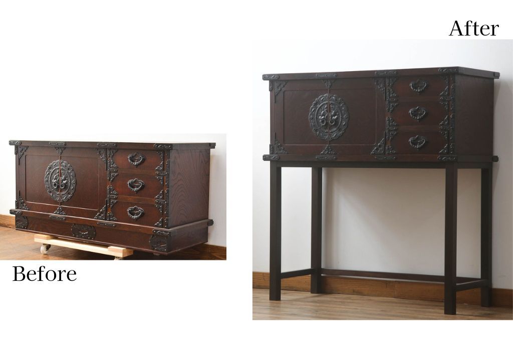 セミオーダー家具実績 > 岩谷堂箪笥をリペア&カスタム!台輪をカットし木製脚を取り付け。1トーン落ち着いた色味に着色仕上げ。(サイドボード、サイドキャビネット、戸棚、収納棚、引き出し、収納箪笥、和タンス)