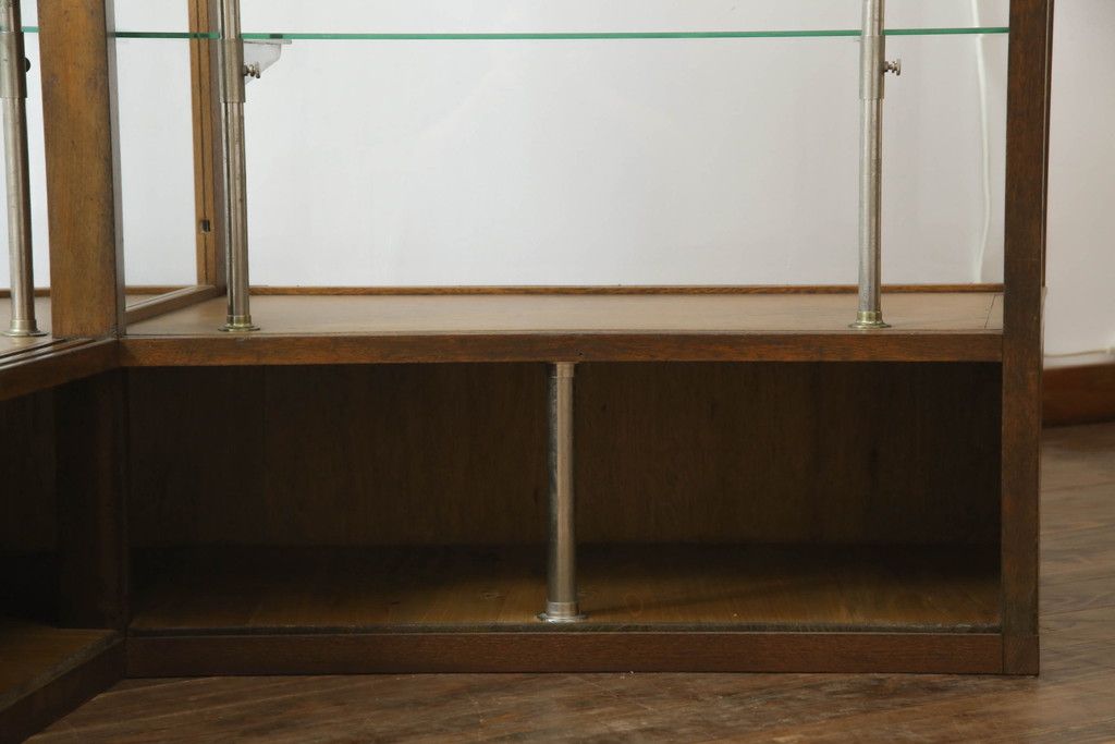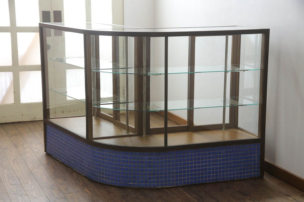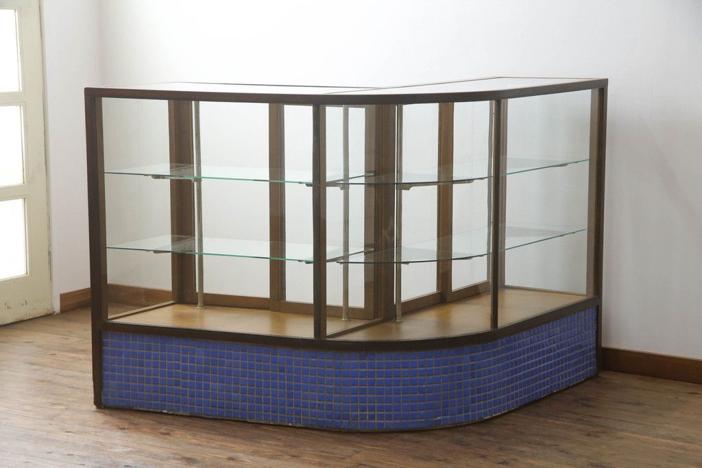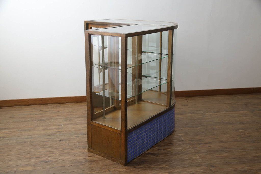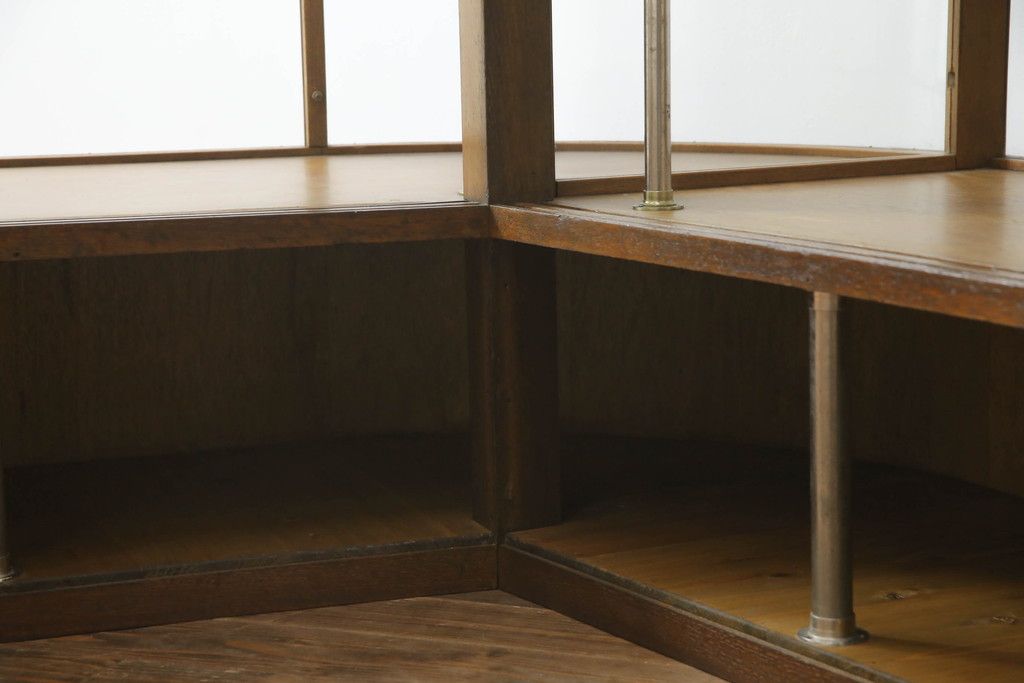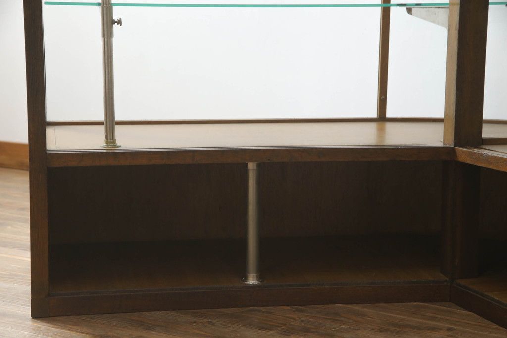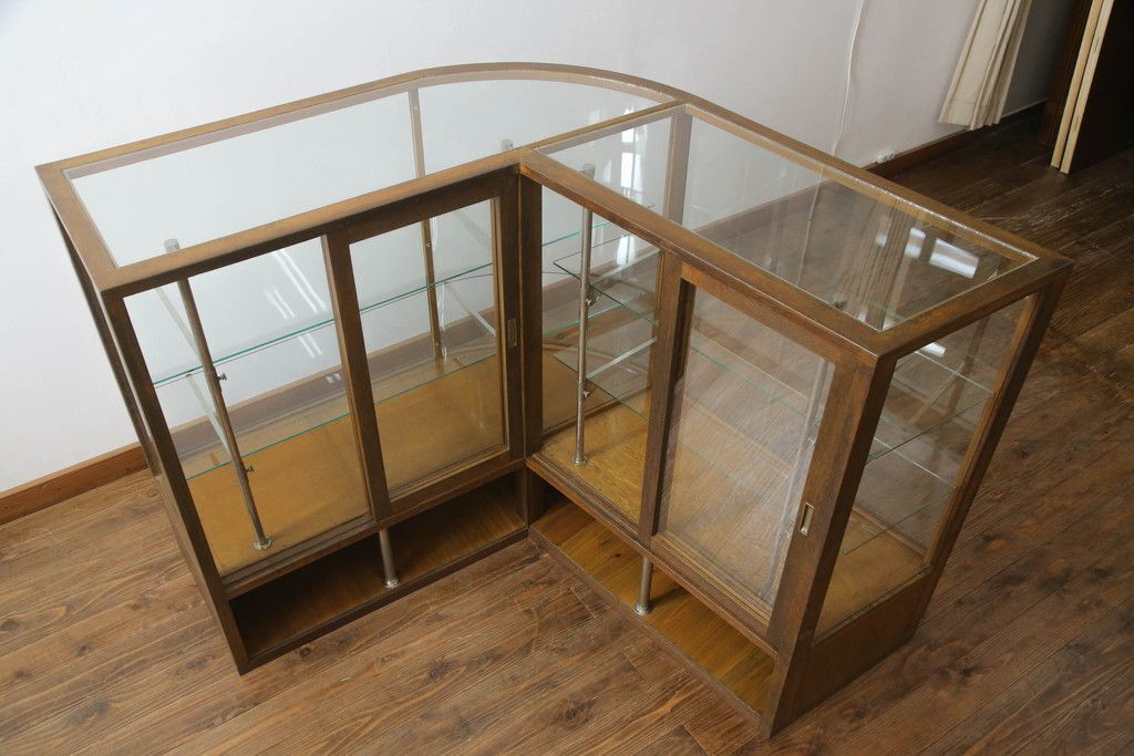 ガラスケース・ショーケース> カウンターショーケース > L字ガラスケースをリペア&カスタム!高品質リペアを施し、下部は物を収納できるようオープン仕様に。1トーン落ち着いた色味に着色仕上げ。(Rガラス、ショーケース、店舗什器、陳列棚、曲げガラス)