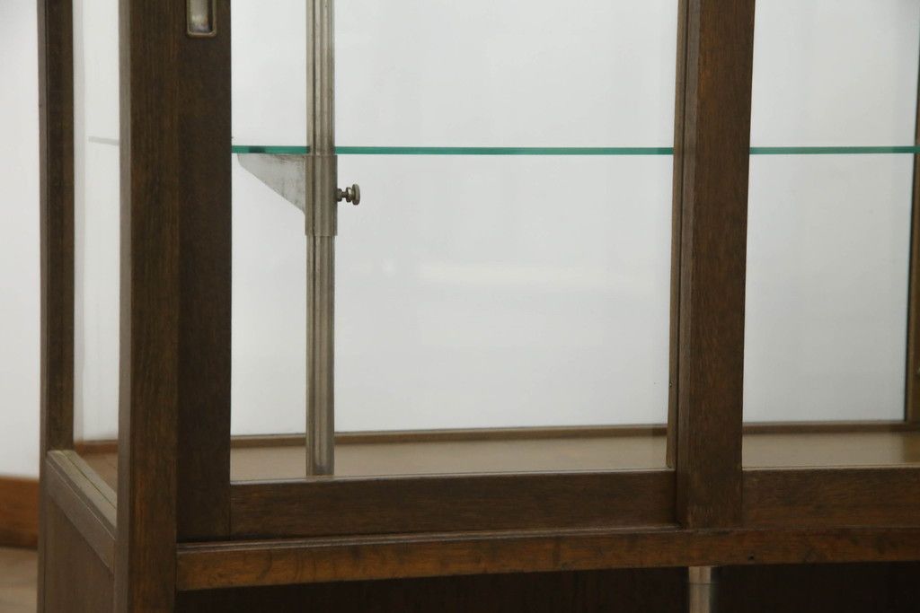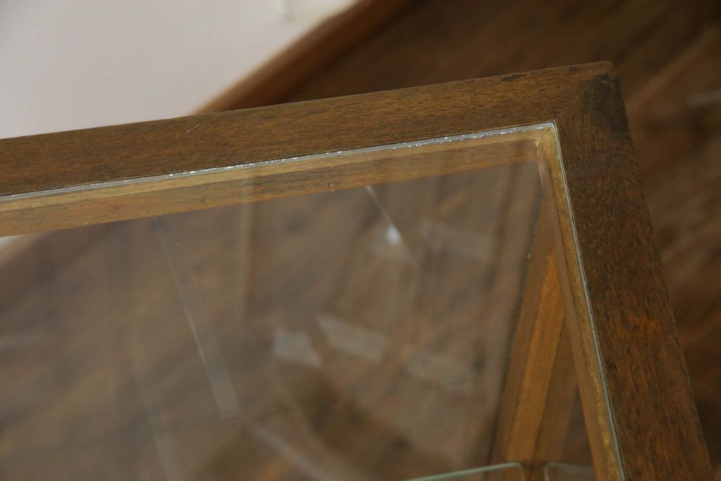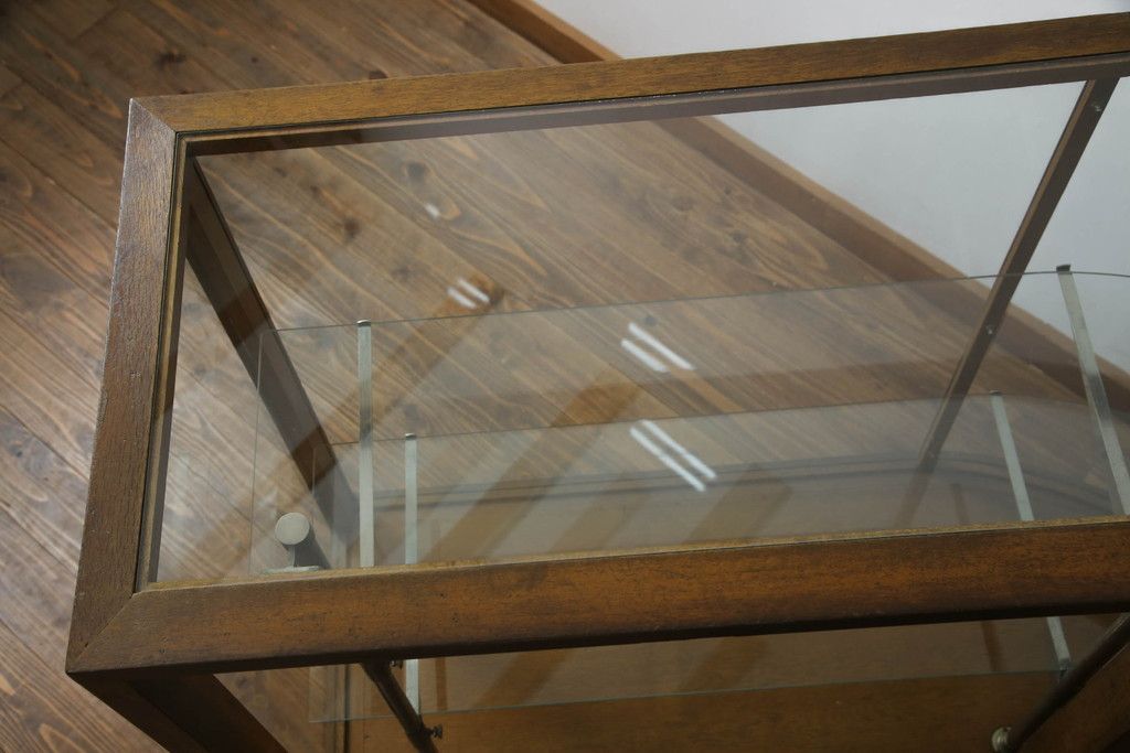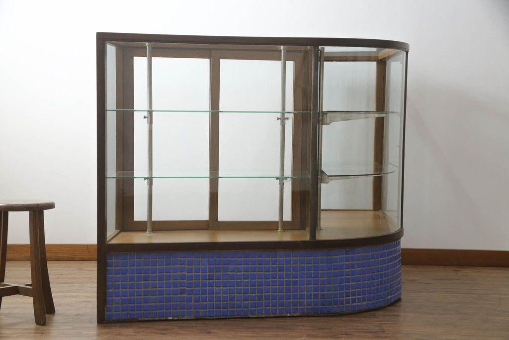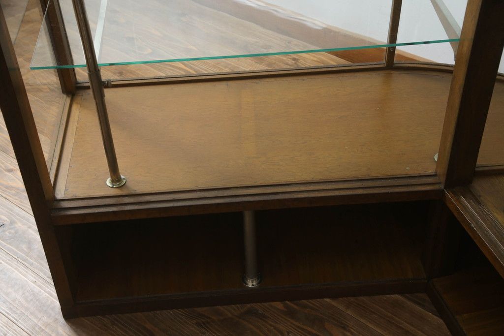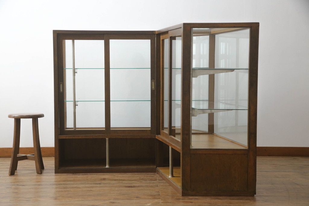ガラスケース・ショーケース> カウンターショーケース > L字ガラスケースをリペア&カスタム!高品質リペアを施し、下部は物を収納できるようオープン仕様に。1トーン落ち着いた色味に着色仕上げ。(Rガラス、ショーケース、店舗什器、陳列棚、曲げガラス)