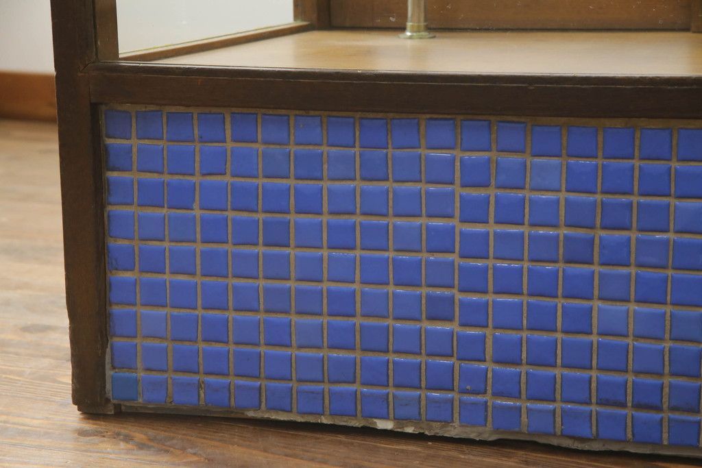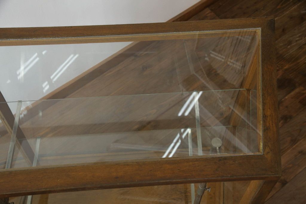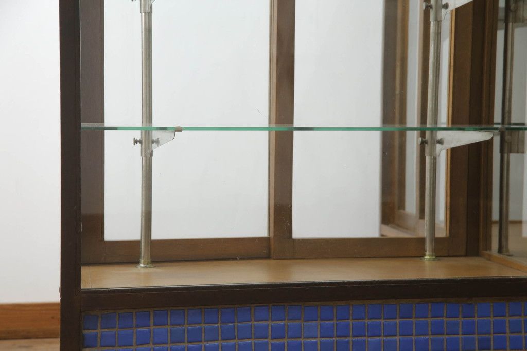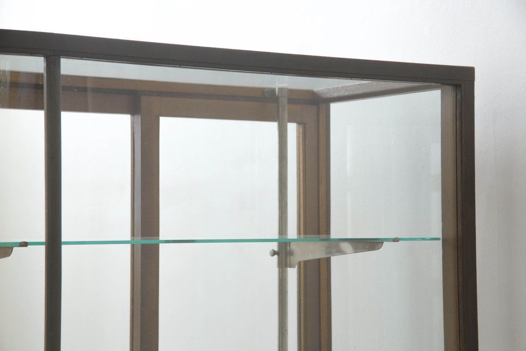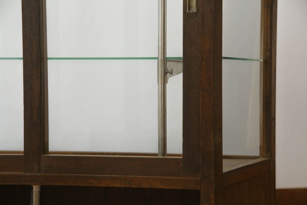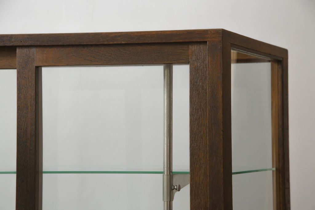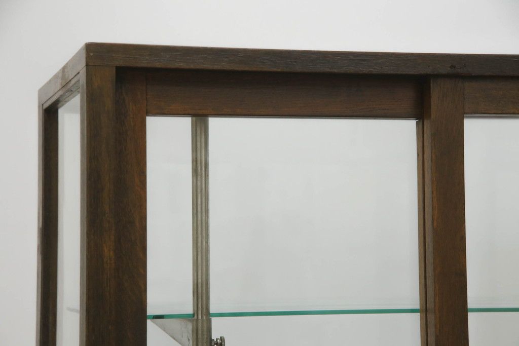 ガラスケース・ショーケース> カウンターショーケース > L字ガラスケースをリペア&カスタム!高品質リペアを施し、下部は物を収納できるようオープン仕様に。1トーン落ち着いた色味に着色仕上げ。(Rガラス、ショーケース、店舗什器、陳列棚、曲げガラス)