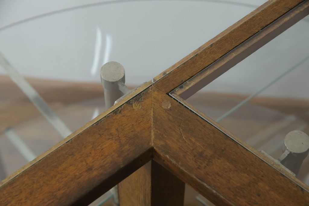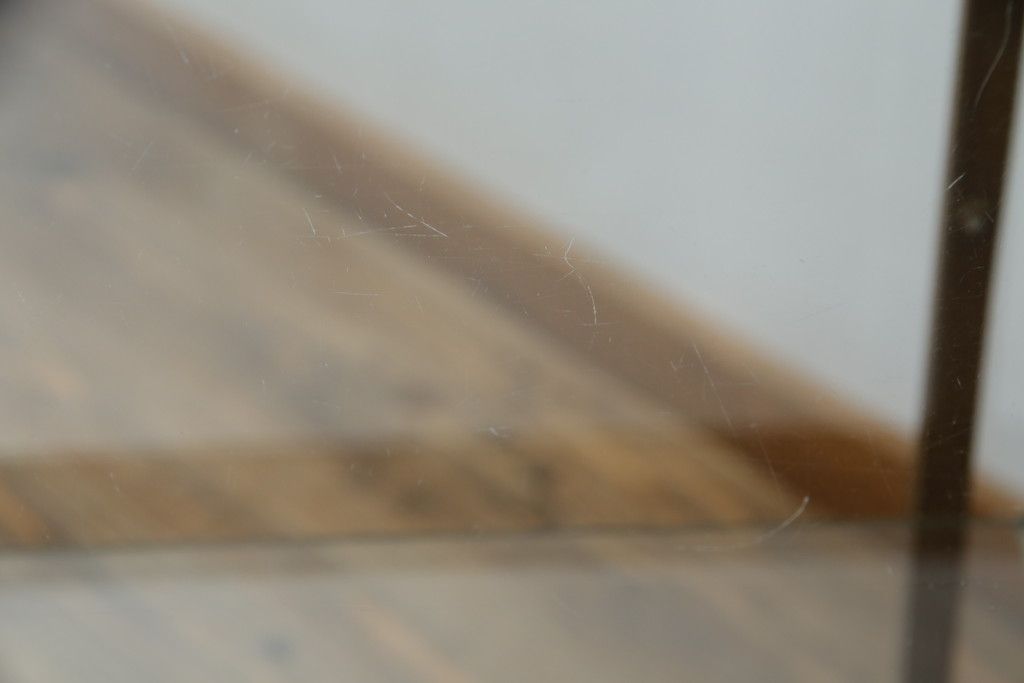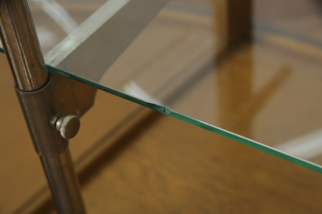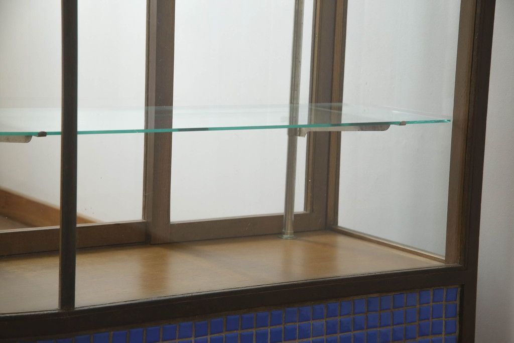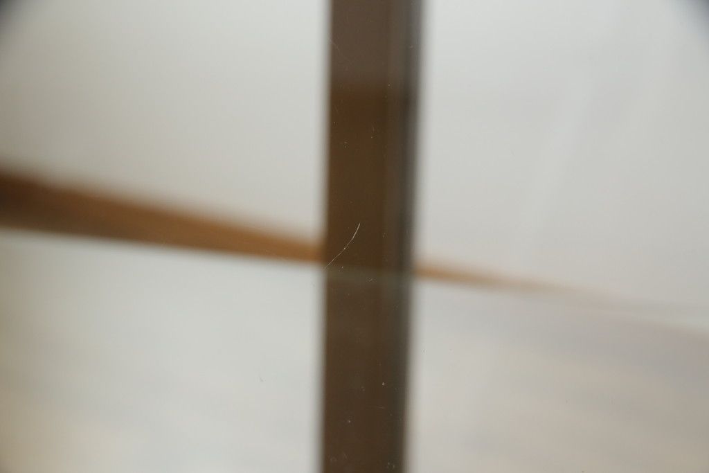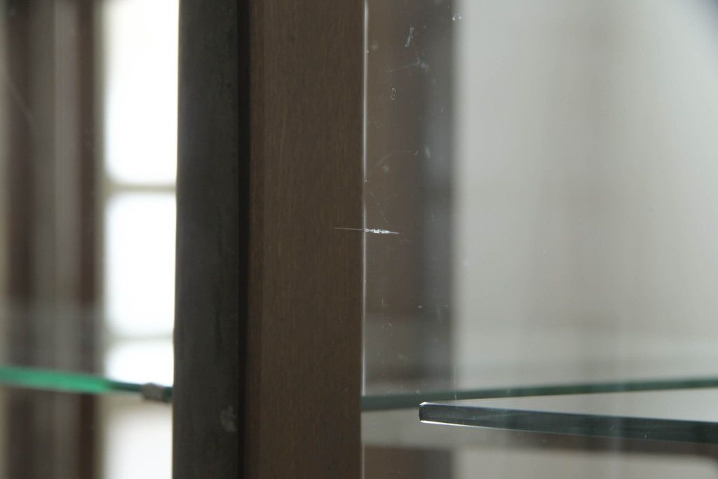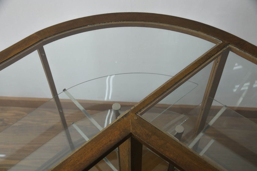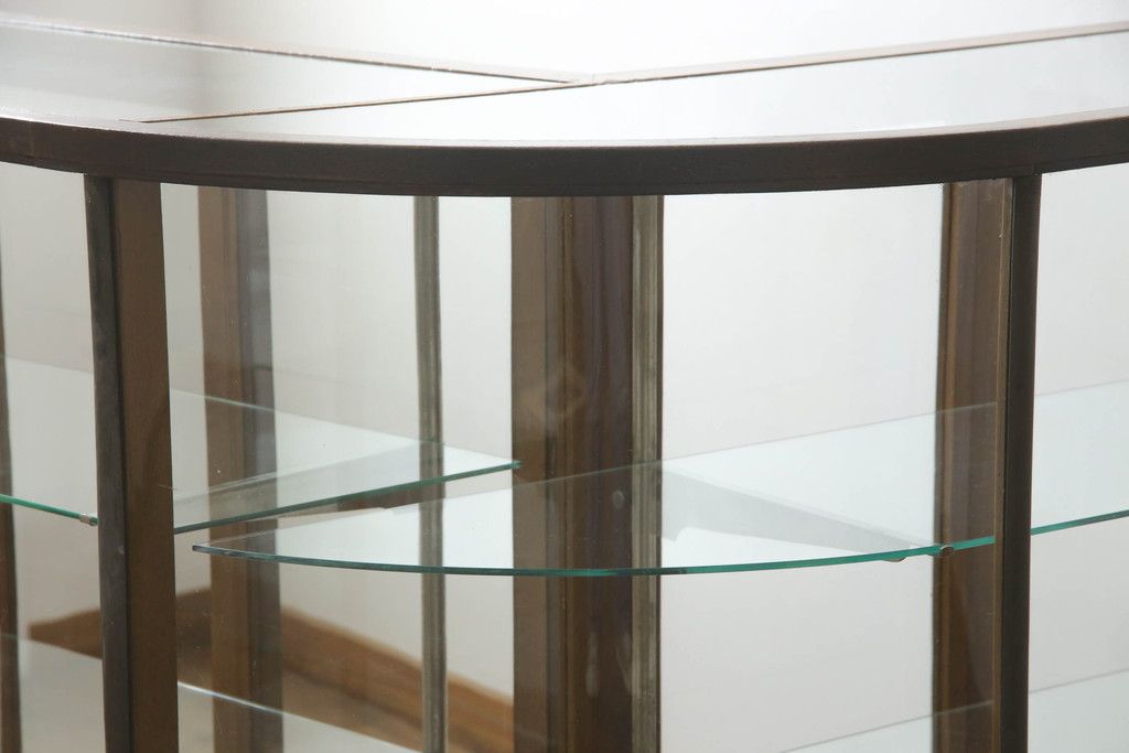 ガラスケース・ショーケース > L字ガラスケースをリペア&カスタム!高品質リペアを施し、下部は物を収納できるようオープン仕様に。1トーン落ち着いた色味に着色仕上げ。(Rガラス、ショーケース、店舗什器、陳列棚、曲げガラス)