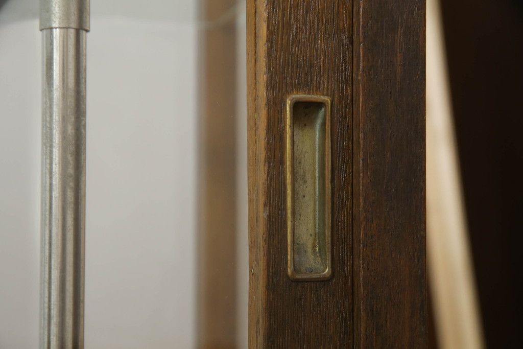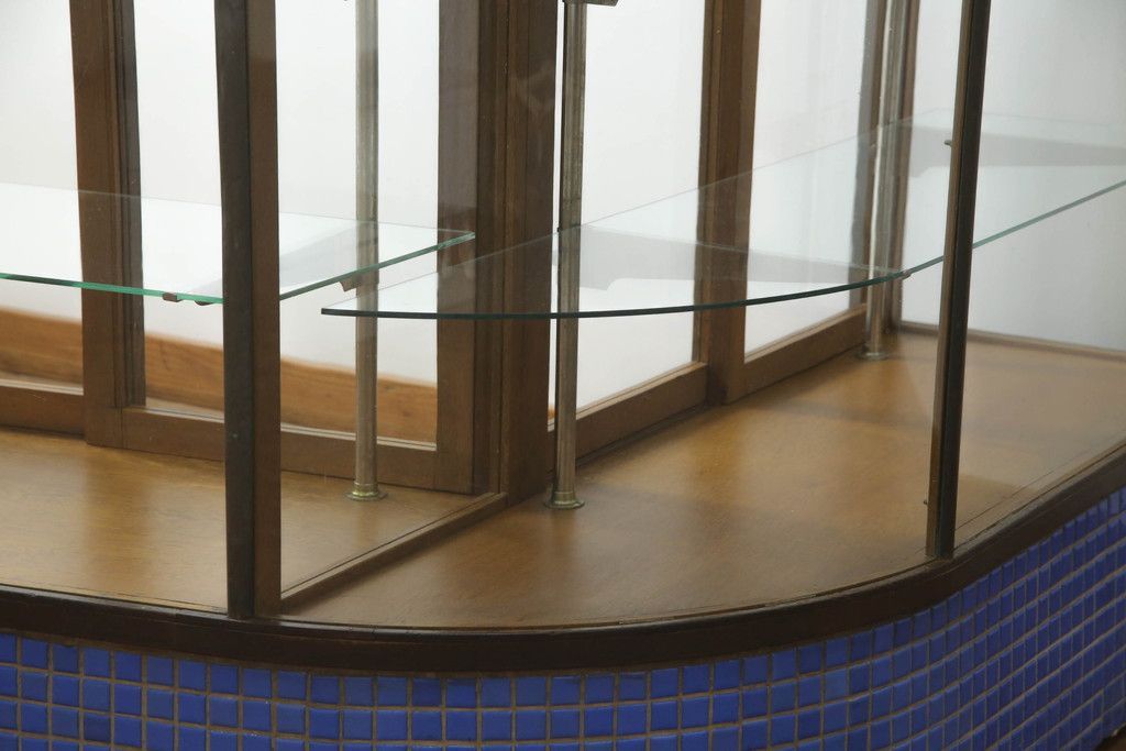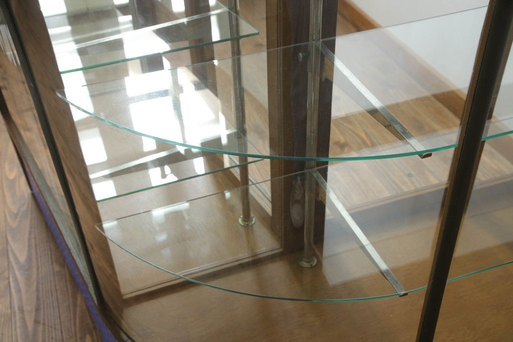 セミオーダー家具実績 > L字ガラスケースをリペア&カスタム!高品質リペアを施し、下部は物を収納できるようオープン仕様に。1トーン落ち着いた色味に着色仕上げ。(Rガラス、ショーケース、店舗什器、陳列棚、曲げガラス)