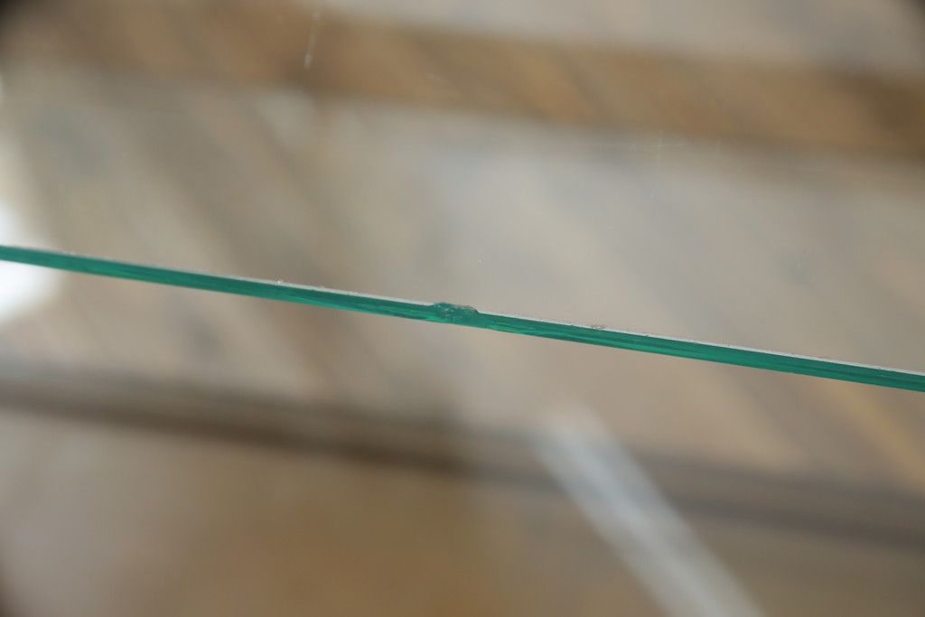 L字ガラスケースをリペア&カスタム!高品質リペアを施し、下部は物を収納できるようオープン仕様に。1トーン落ち着いた色味に着色仕上げ。(Rガラス、ショーケース、店舗什器、陳列棚、曲げガラス)
