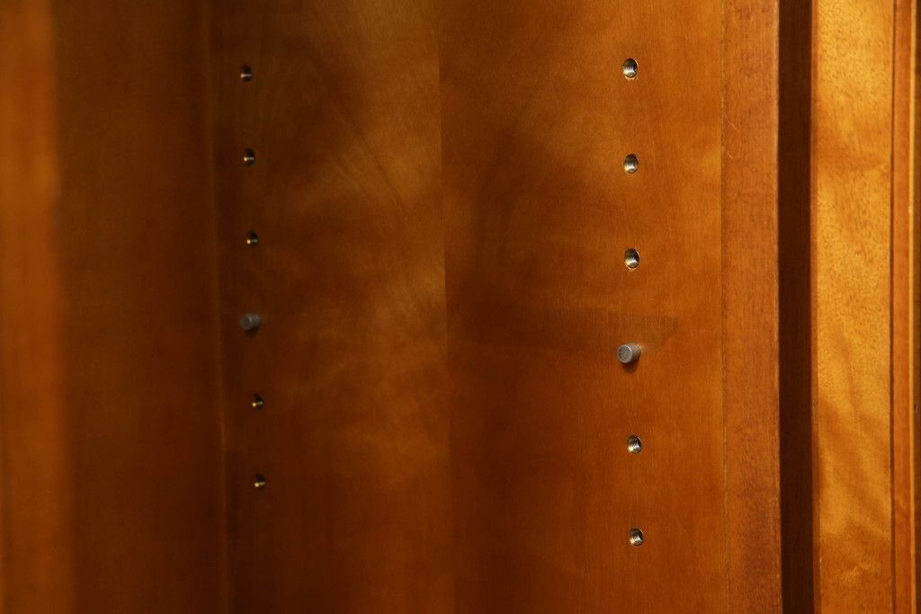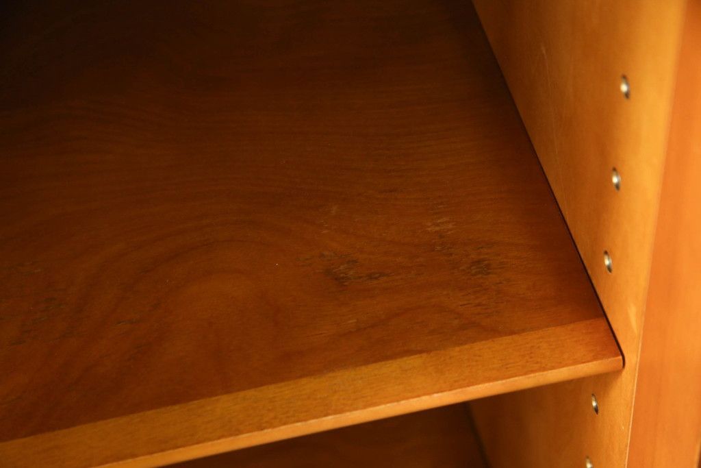 棚板は取り外しできます。棚板は各2枚あります。棚受けは15ヶ所、40mmピッチで調整できます。棚幅サイズのものが1枚の作りです。