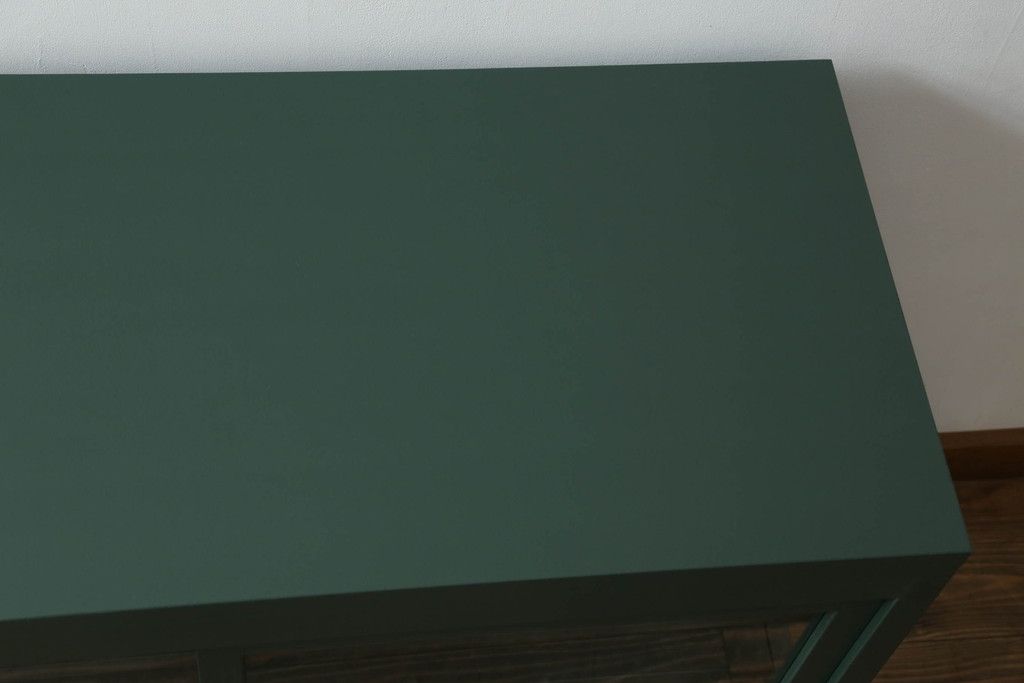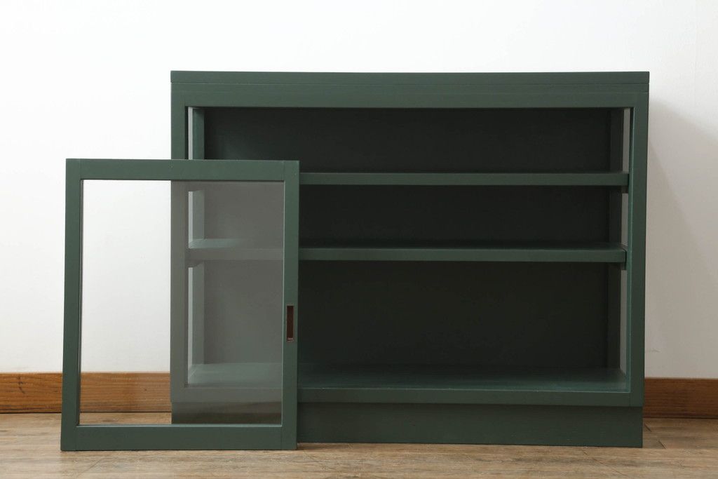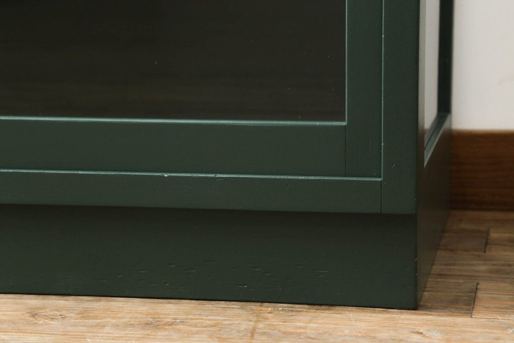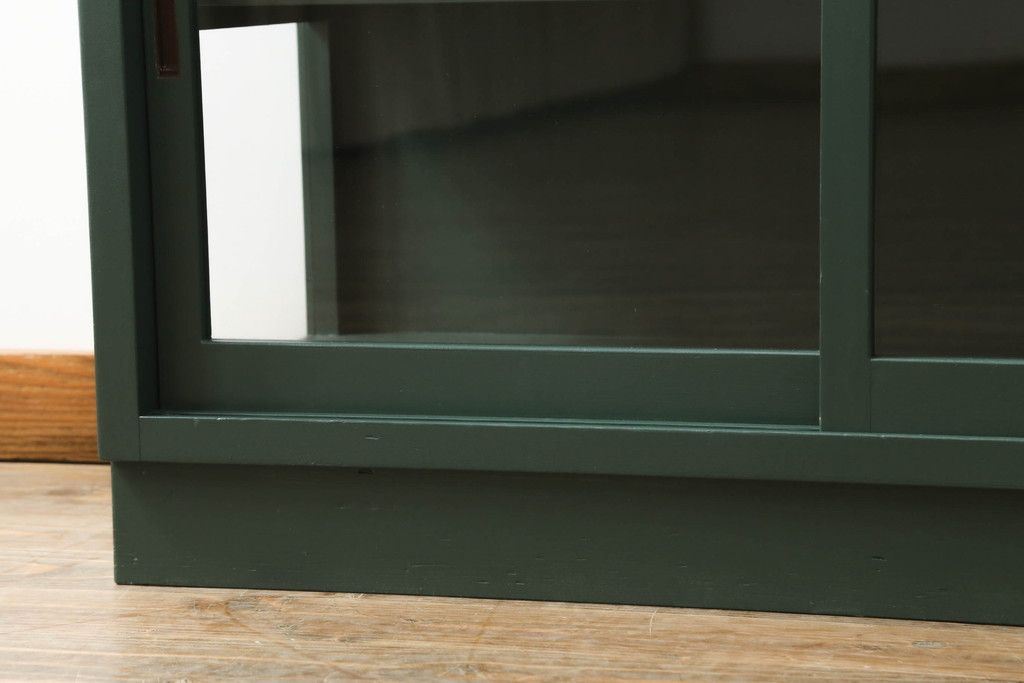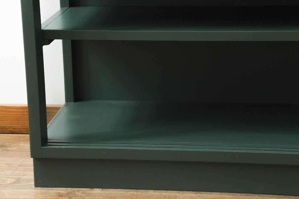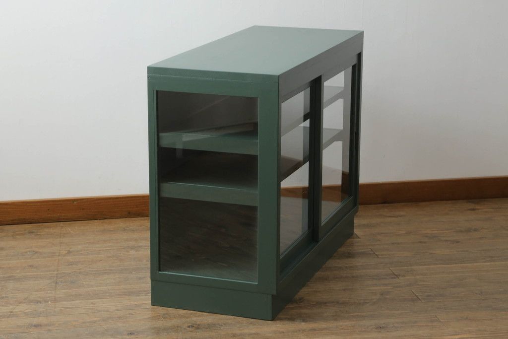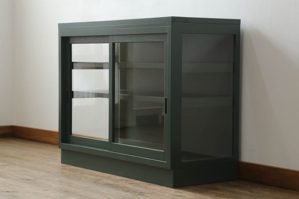 店舗什器 > ガラス収納棚をリペア&カスタム!天板の取り付け。取り外し可能な棚板を設置。ダークグリーンでペイント仕上げ。(ガラスケース、サイドボード、飾り棚、陳列棚、戸棚、キャビネット、店舗什器、三面)