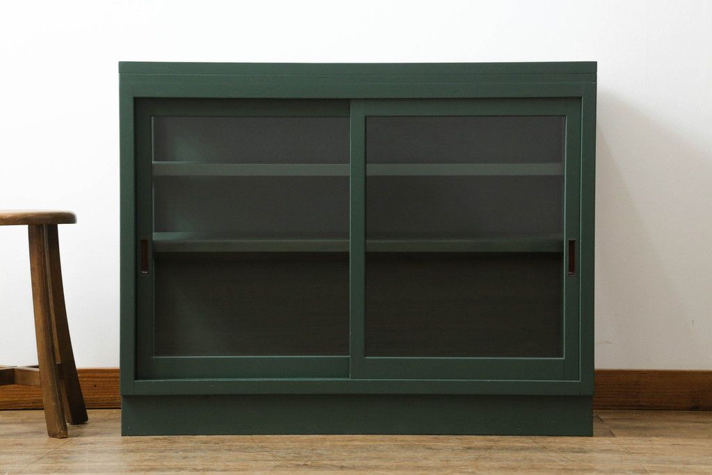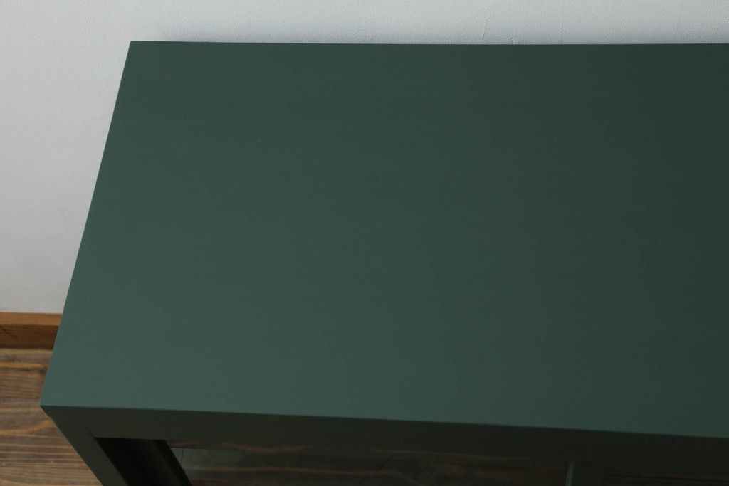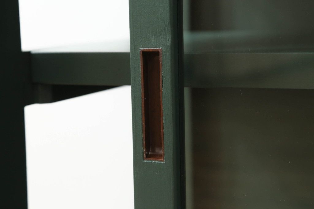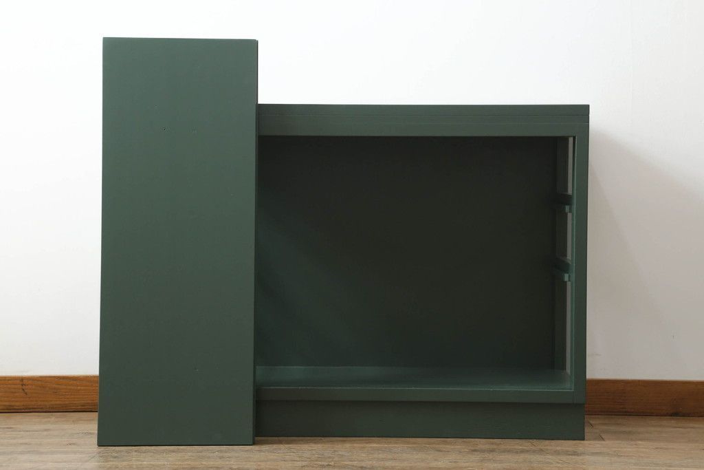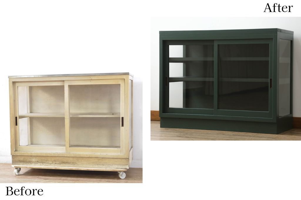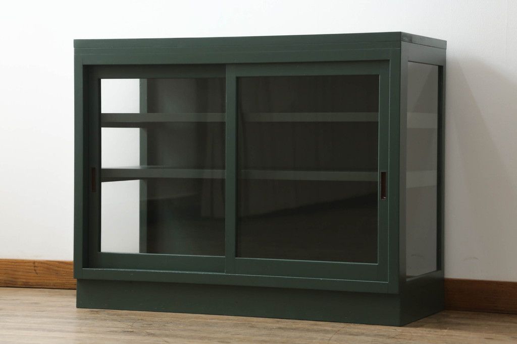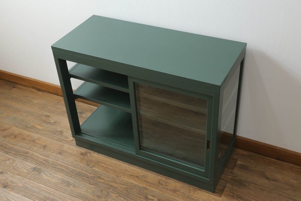 店舗什器 > ガラス収納棚をリペア&カスタム!天板の取り付け。取り外し可能な棚板を設置。ダークグリーンでペイント仕上げ。(ガラスケース、サイドボード、飾り棚、陳列棚、戸棚、キャビネット、店舗什器、三面)