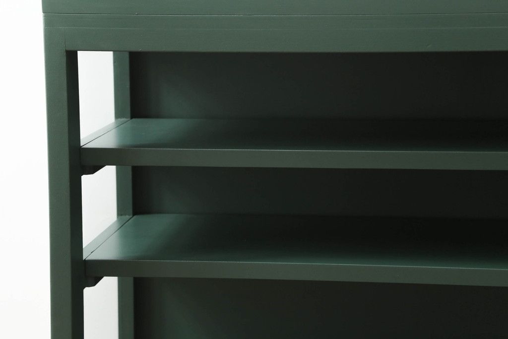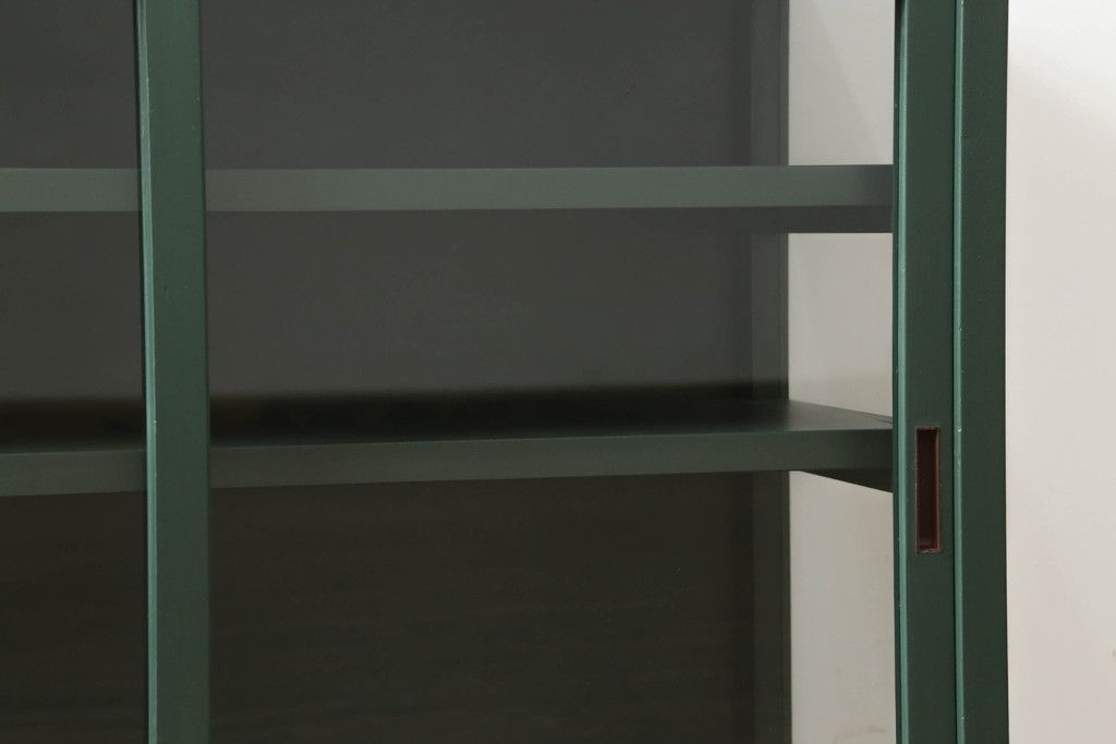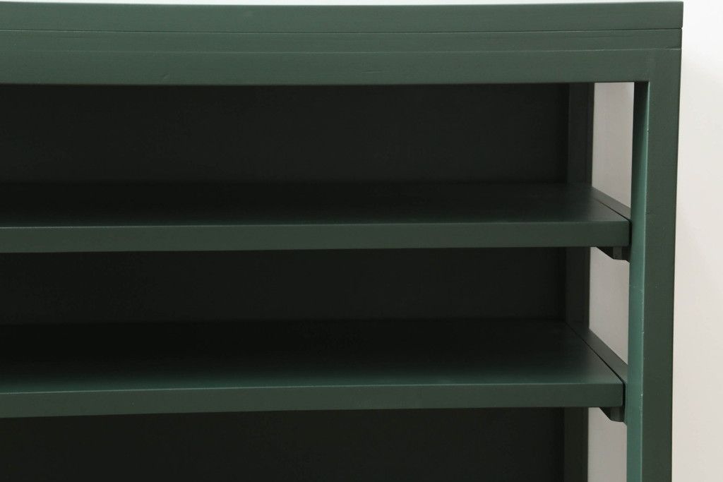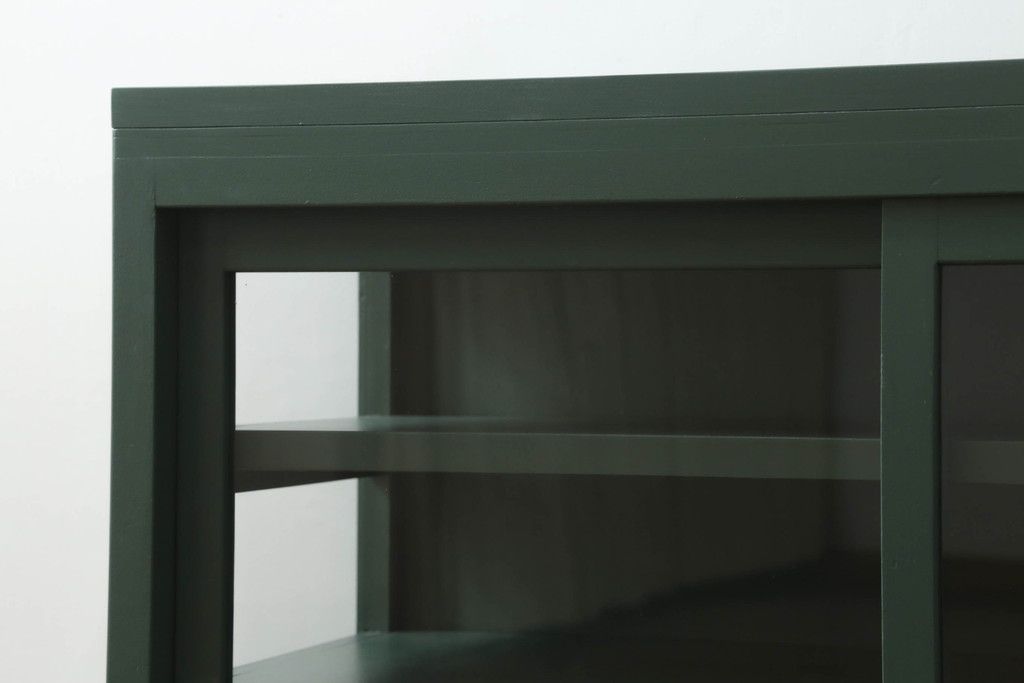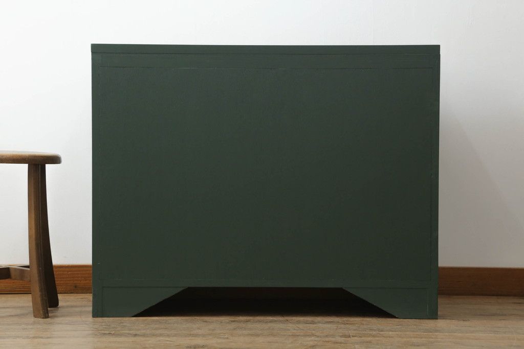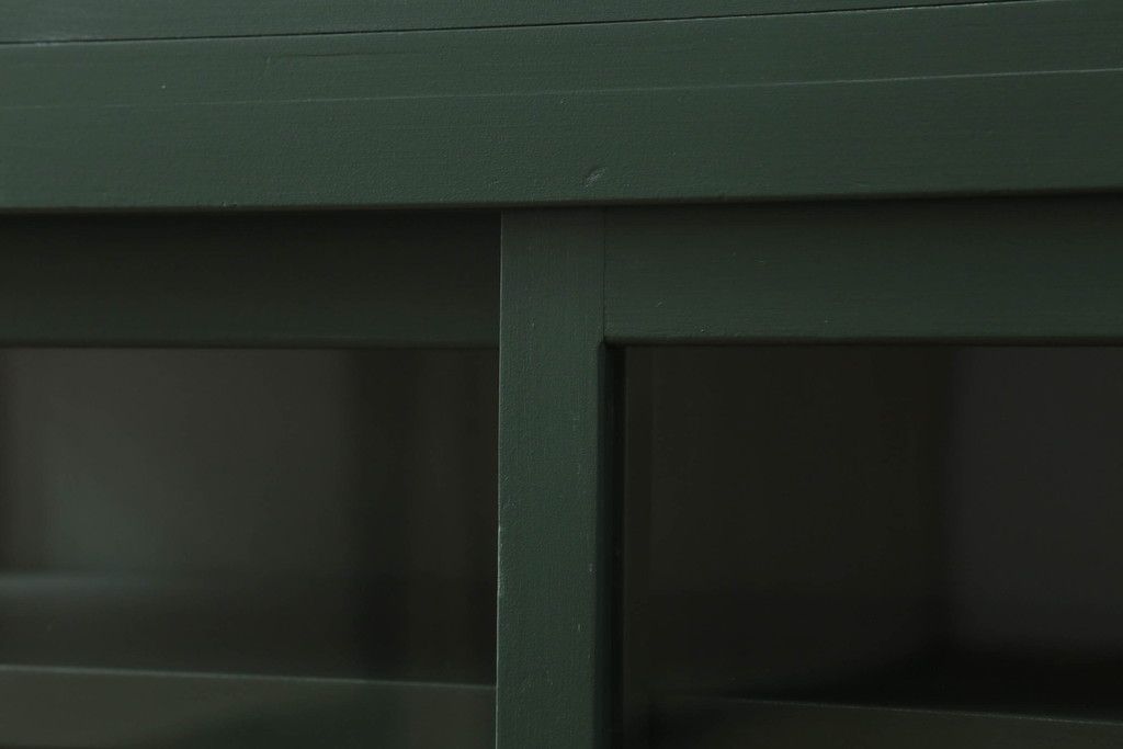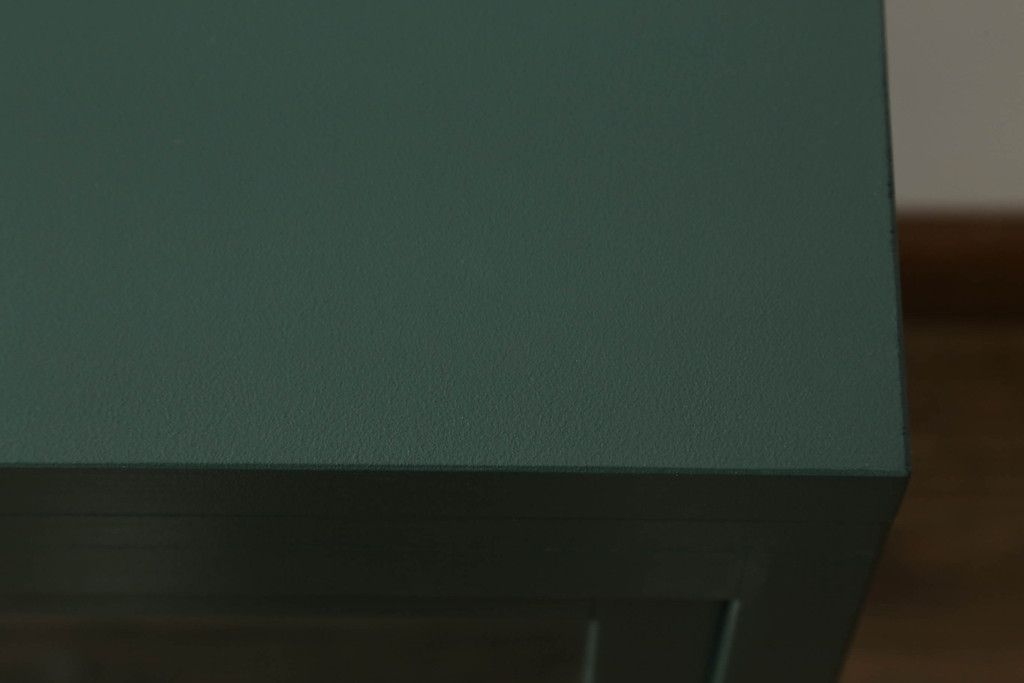 店舗什器 > ガラス収納棚をリペア&カスタム!天板の取り付け。取り外し可能な棚板を設置。ダークグリーンでペイント仕上げ。(ガラスケース、サイドボード、飾り棚、陳列棚、戸棚、キャビネット、店舗什器、三面)
