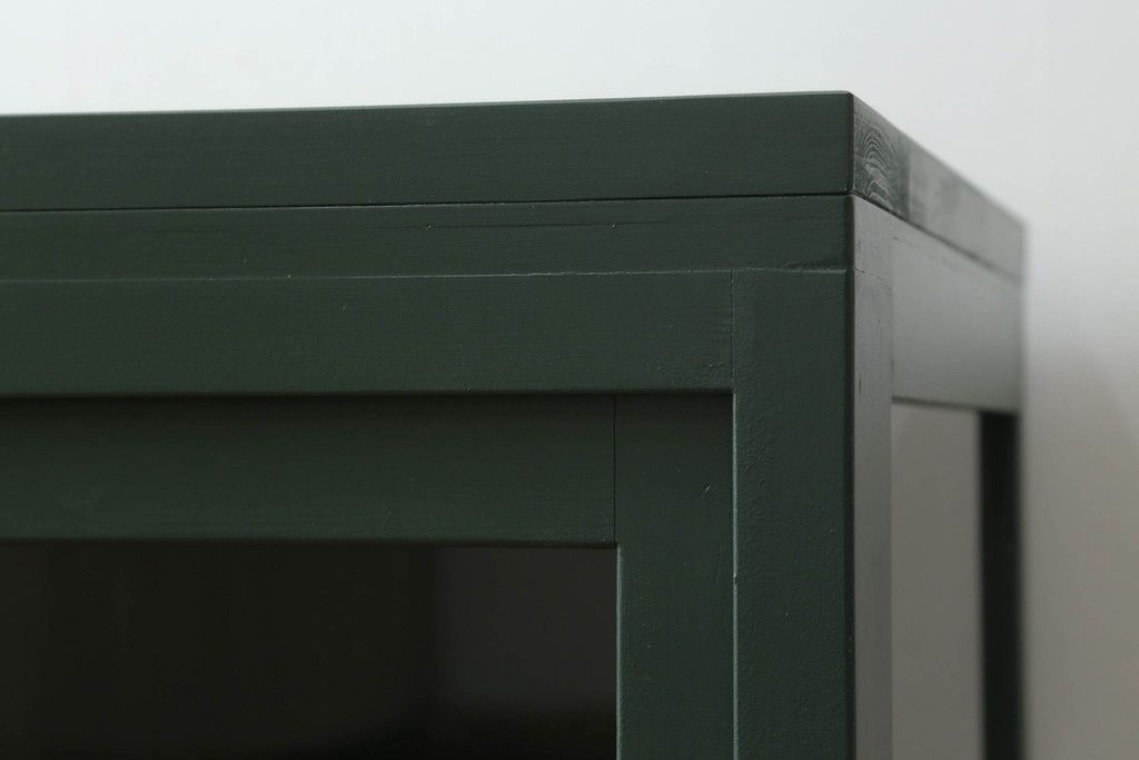 セミオーダー家具実績 > ガラス収納棚をリペア&カスタム!天板の取り付け。取り外し可能な棚板を設置。ダークグリーンでペイント仕上げ。(ガラスケース、サイドボード、飾り棚、陳列棚、戸棚、キャビネット、店舗什器、三面)