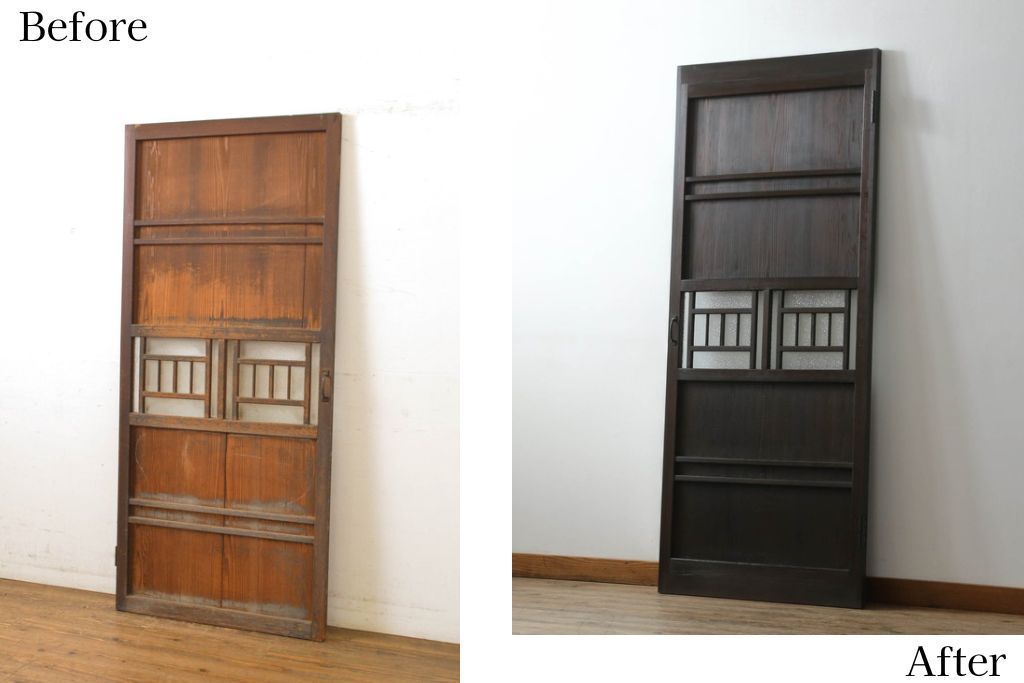 ドア・建具 > 大正期の扉をリペア&カスタム!設置場所に合わせてリサイズ。マグネット式ラッチ金具を取り付け。濃い茶色で着色し仕上げ。(ドア、ガラスドア、片開きドア、木製ドア)