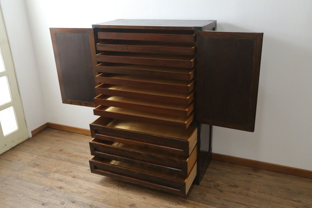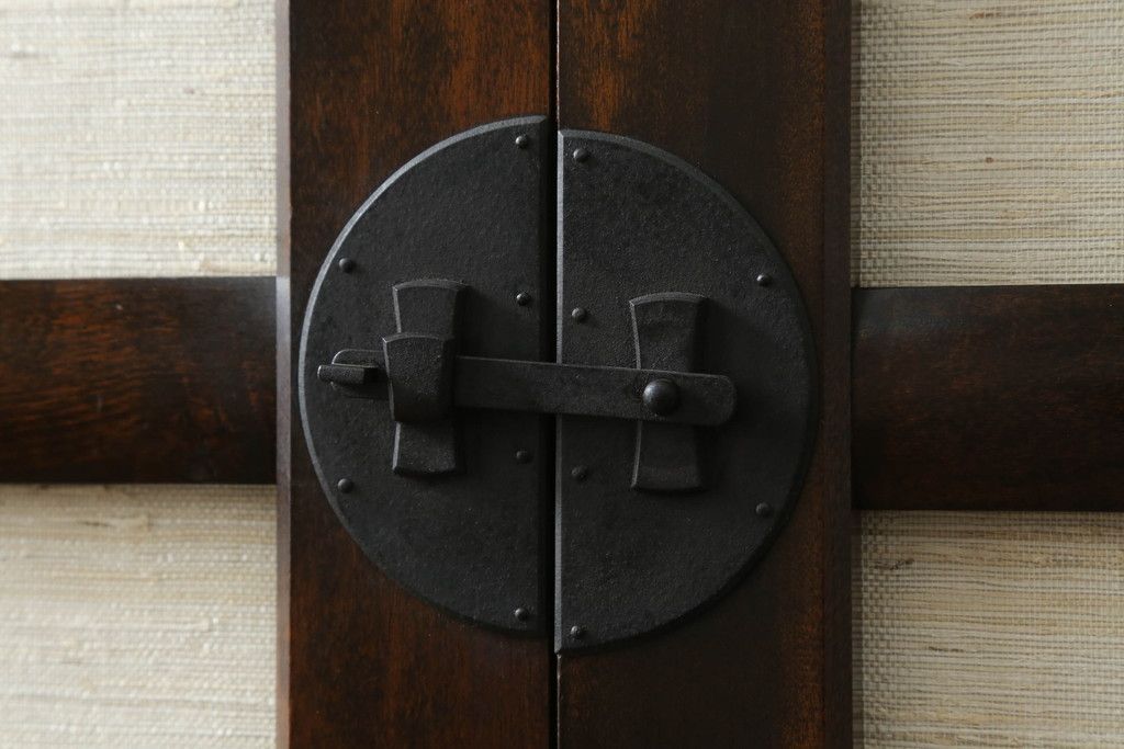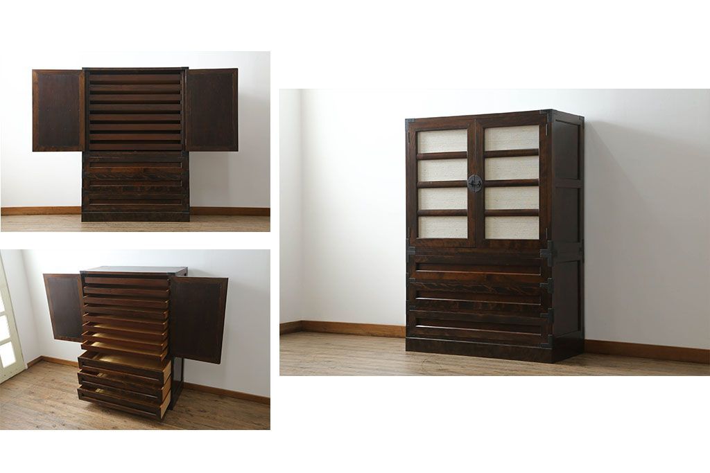 和箪笥をリペア&カスタム!高品質リペアを施し、観音扉部分の布をふすま紙に張り替え。現状の色味をベースに着色仕上げ。(衣装箪笥、着物箪笥、収納たんす、時代箪笥、チェスト、引き出し)