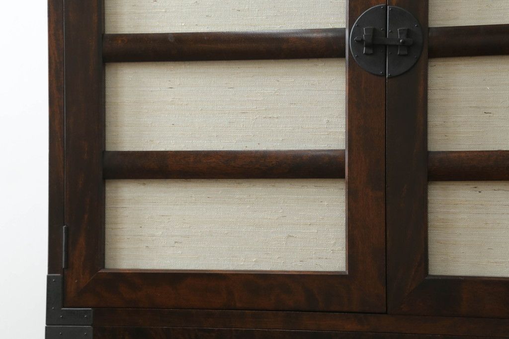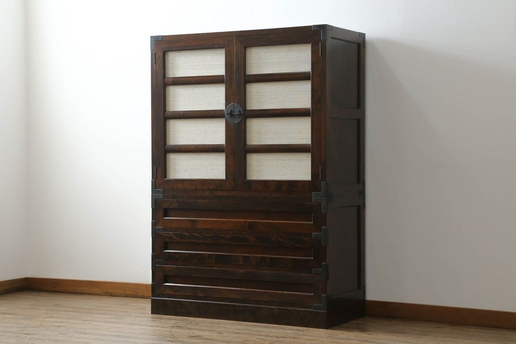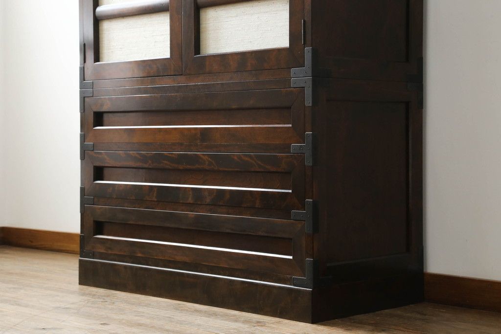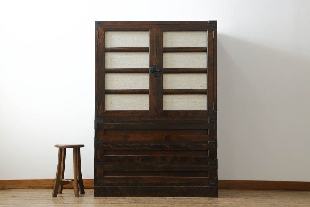 和箪笥> 観音箪笥 > 和箪笥をリペア&カスタム!高品質リペアを施し、観音扉部分の布をふすま紙に張り替え。現状の色味をベースに着色仕上げ。(衣装箪笥、着物箪笥、収納たんす、時代箪笥、チェスト、引き出し)