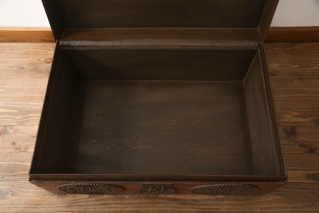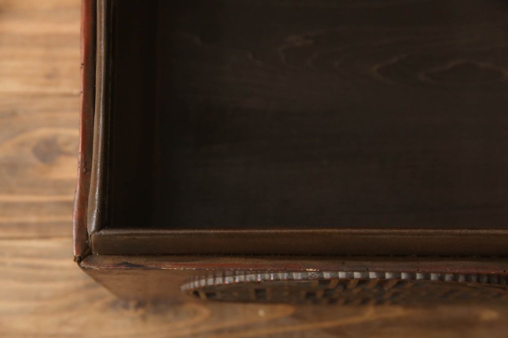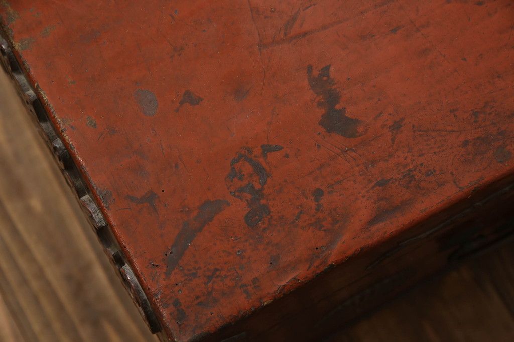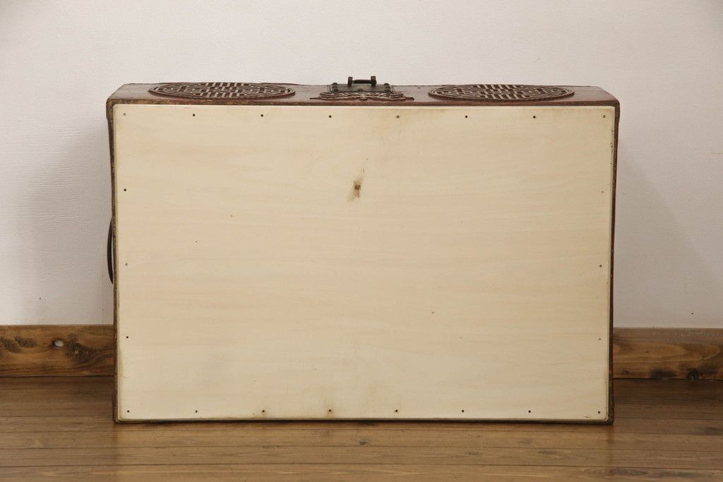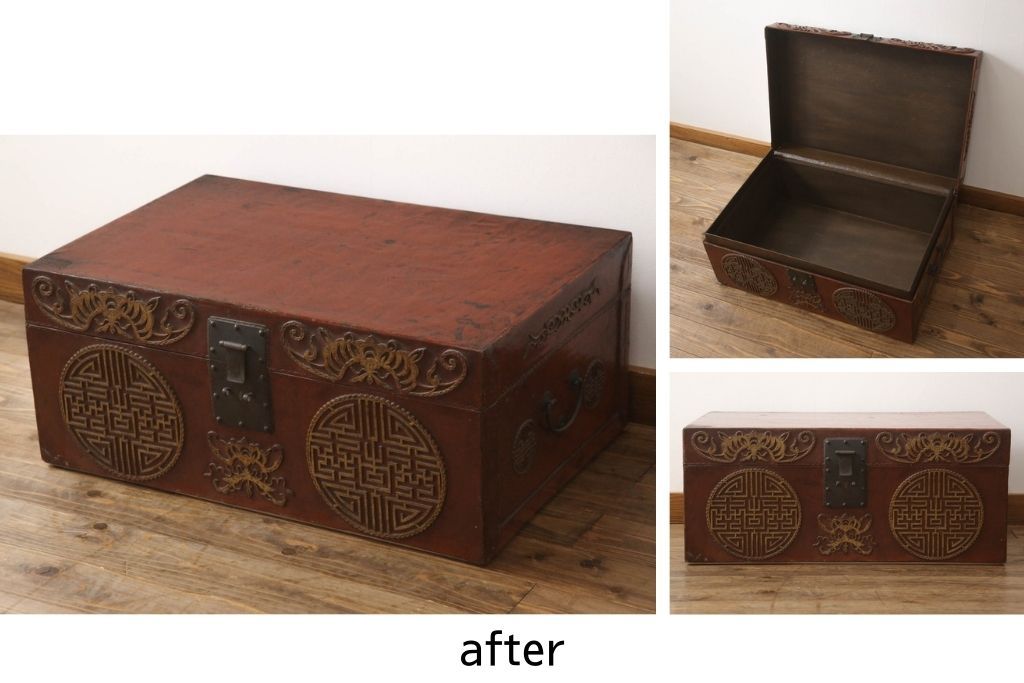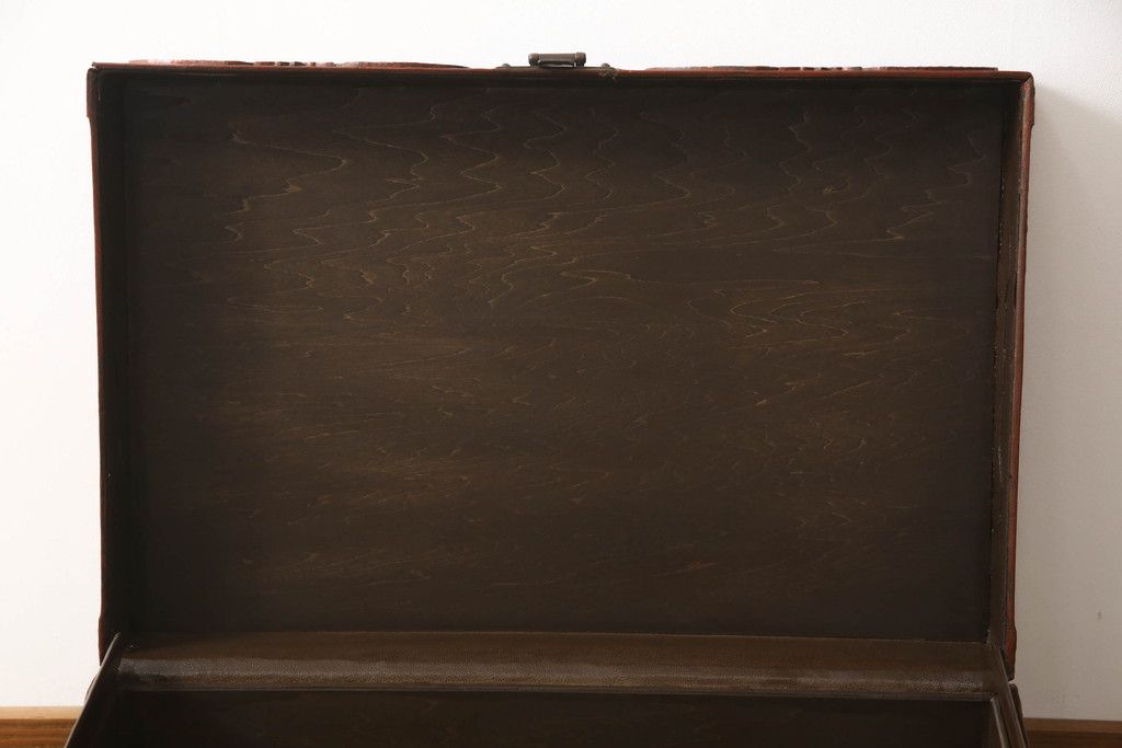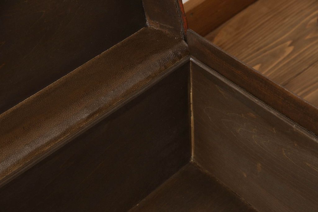 シナ鞄を綺麗に再生!高品質リペアを施し、上蓋内部を塗装。収納部分に箱を、底板に突板を入れて内部を補強。殺虫のために燻蒸作業。