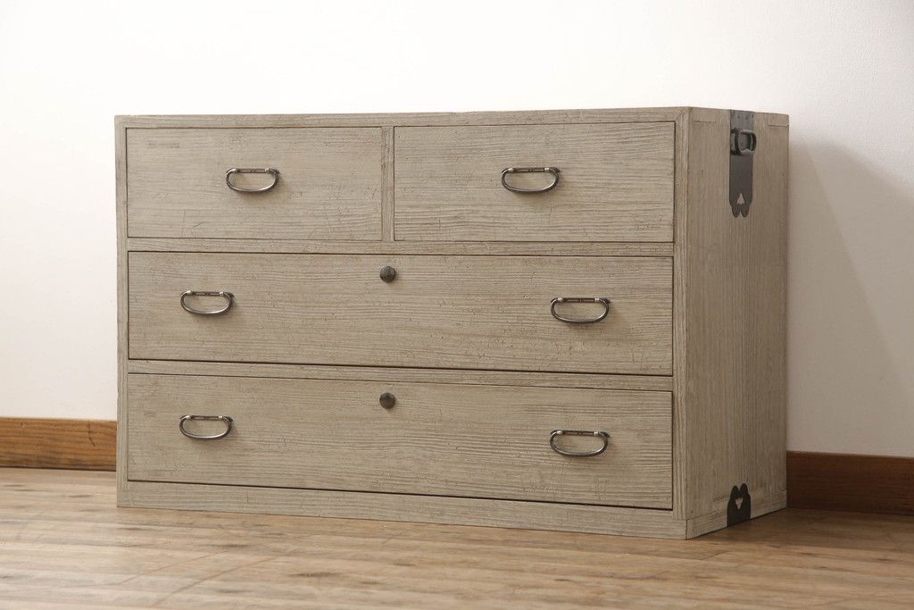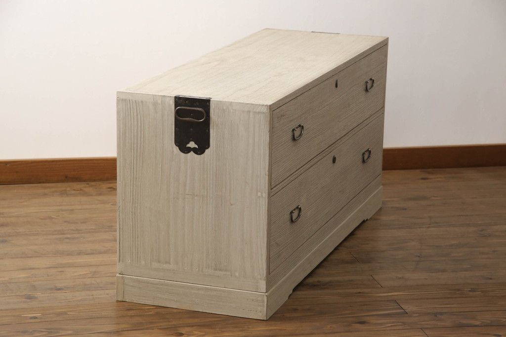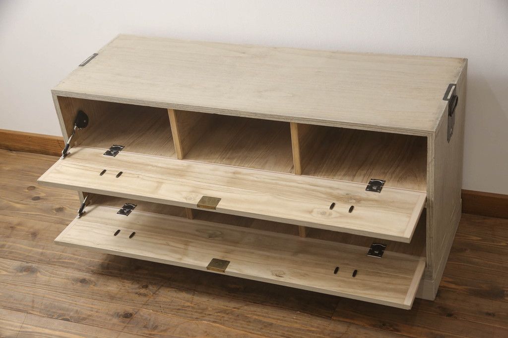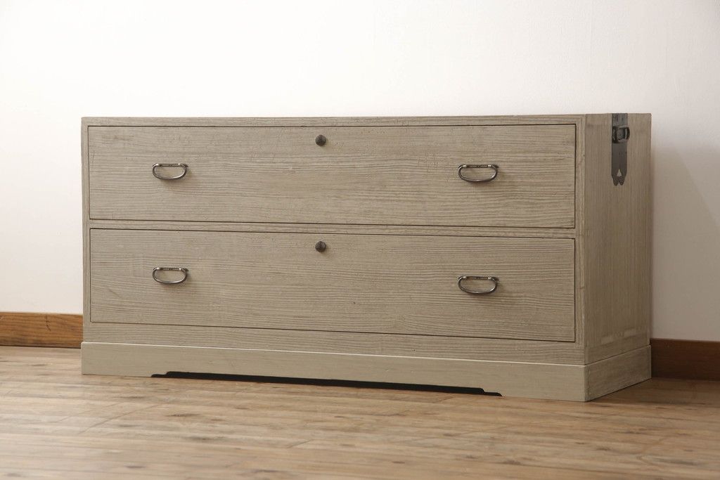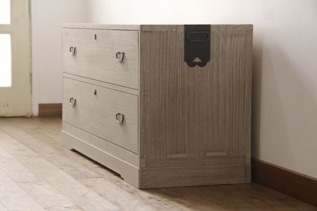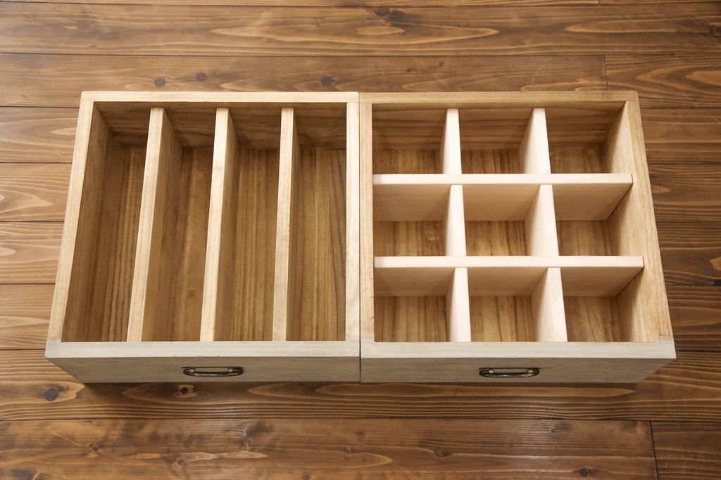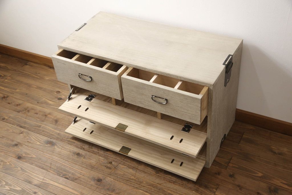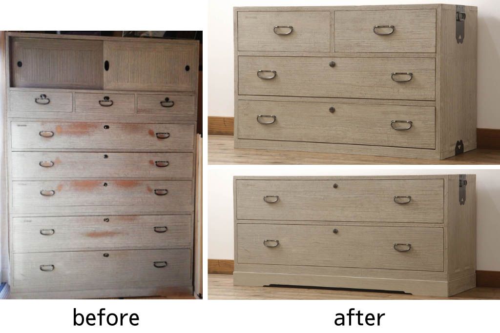 3段重ね桐箪笥を2つのローチェストにリメイク!中段は幅を小さく加工。1段目の引き出しを2分割し、新たに仕切りを追加。中段の下2段と下段の引き出しをフラップダウン仕様に。どちらとも側面に持ち手の取り付け。