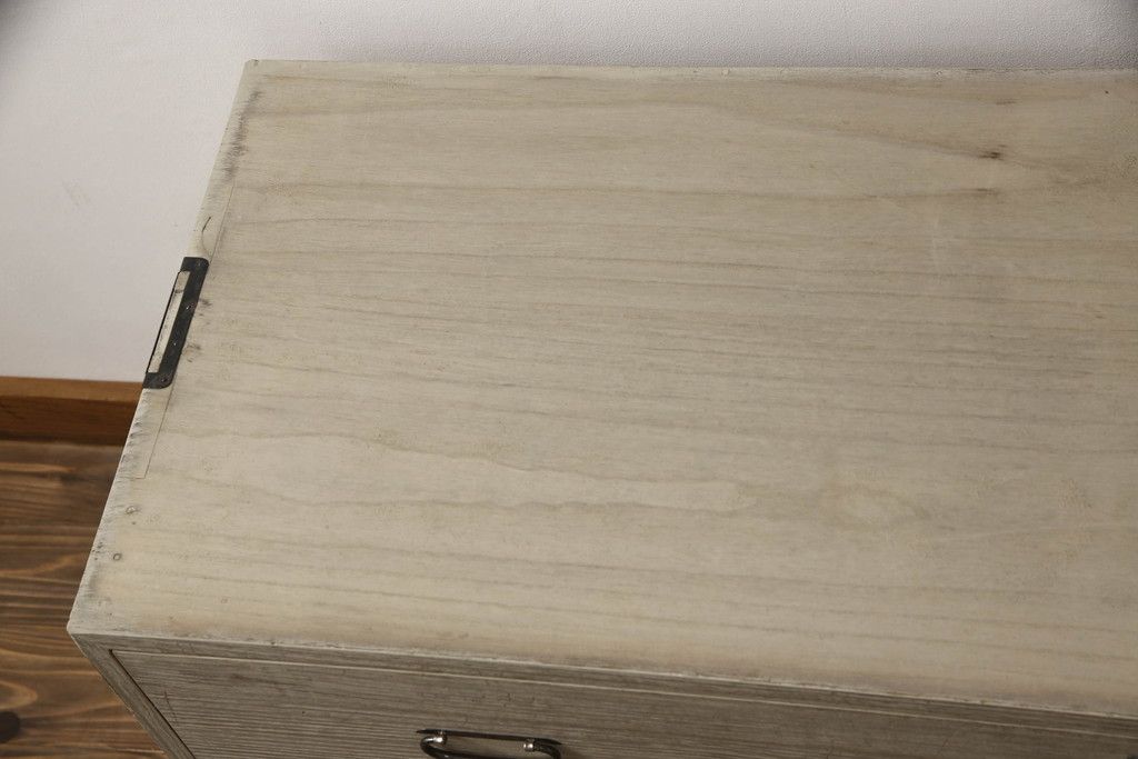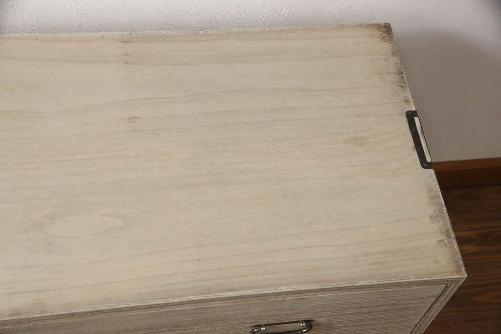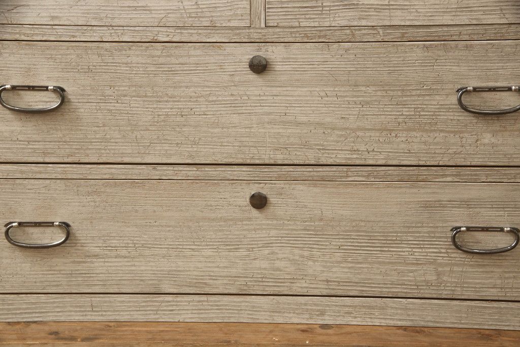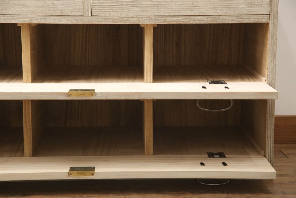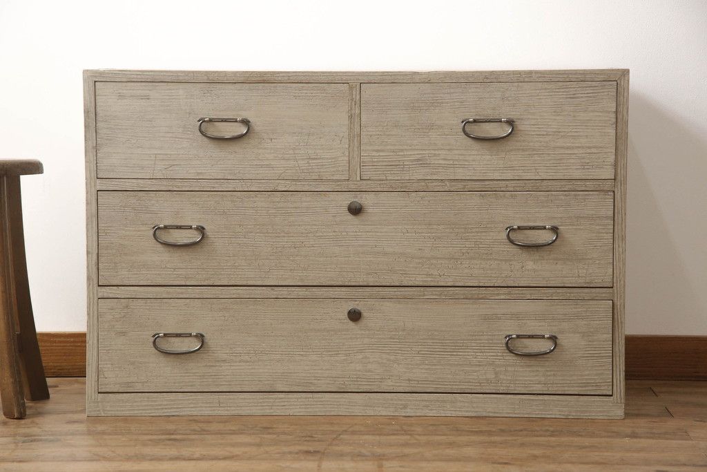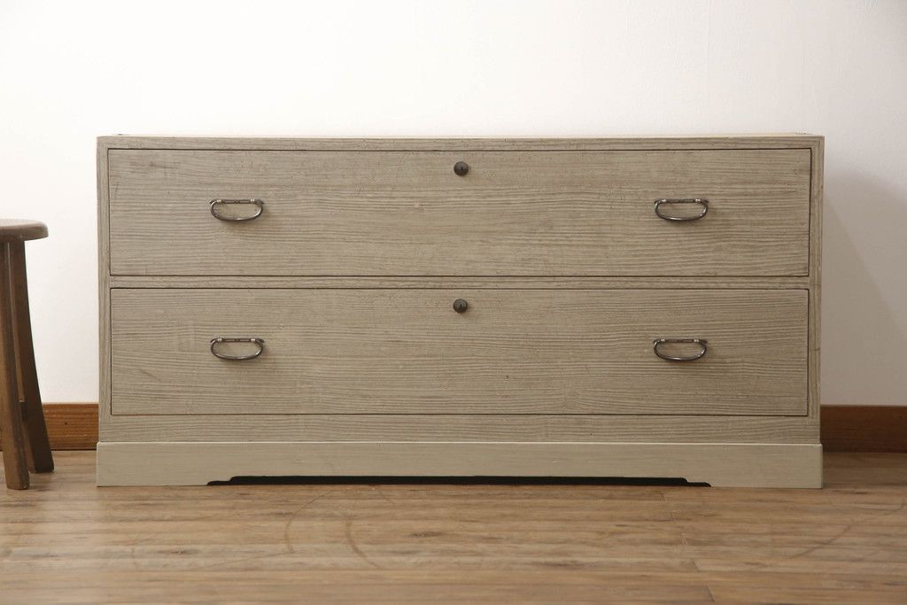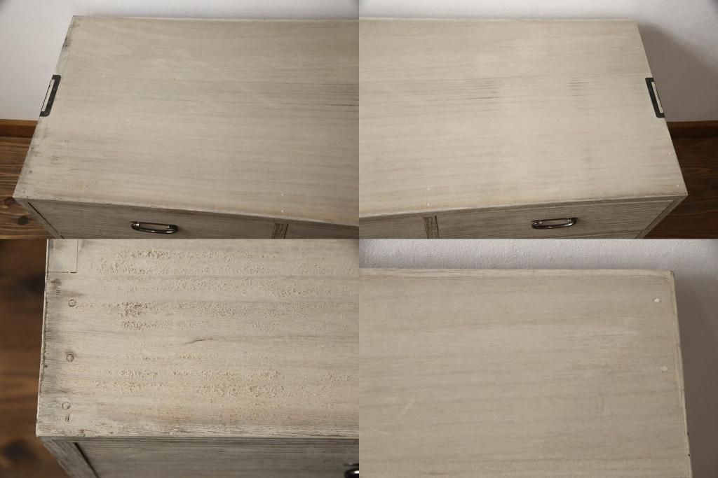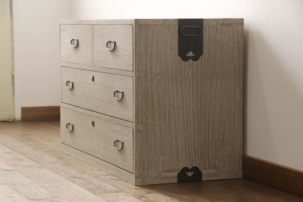3段重ね桐箪笥を2つのローチェストにリメイク!中段は幅を小さく加工。1段目の引き出しを2分割し、新たに仕切りを追加。中段の下2段と下段の引き出しをフラップダウン仕様に。どちらとも側面に持ち手の取り付け。