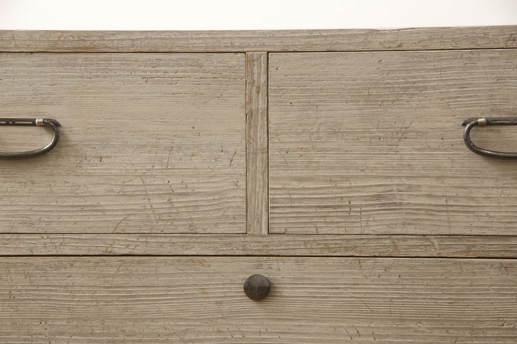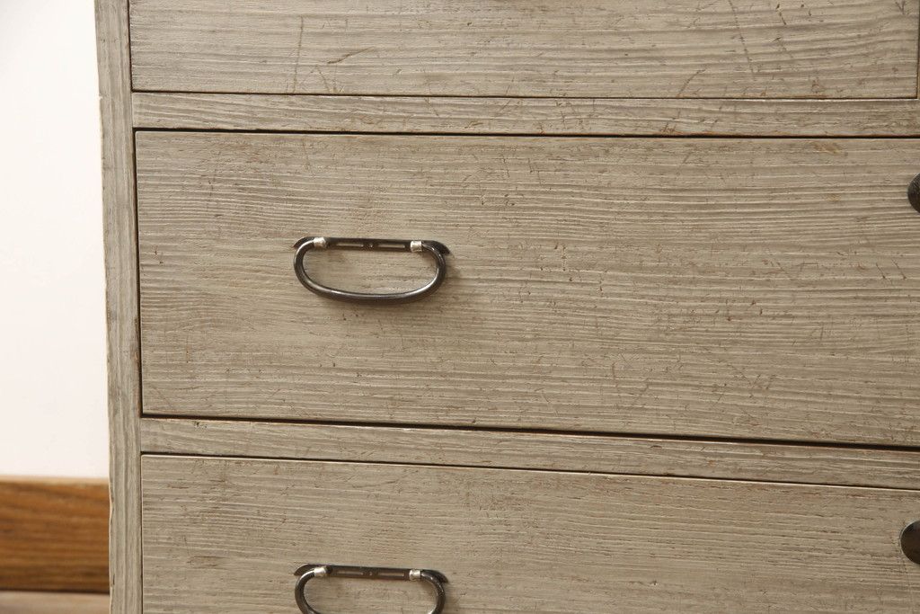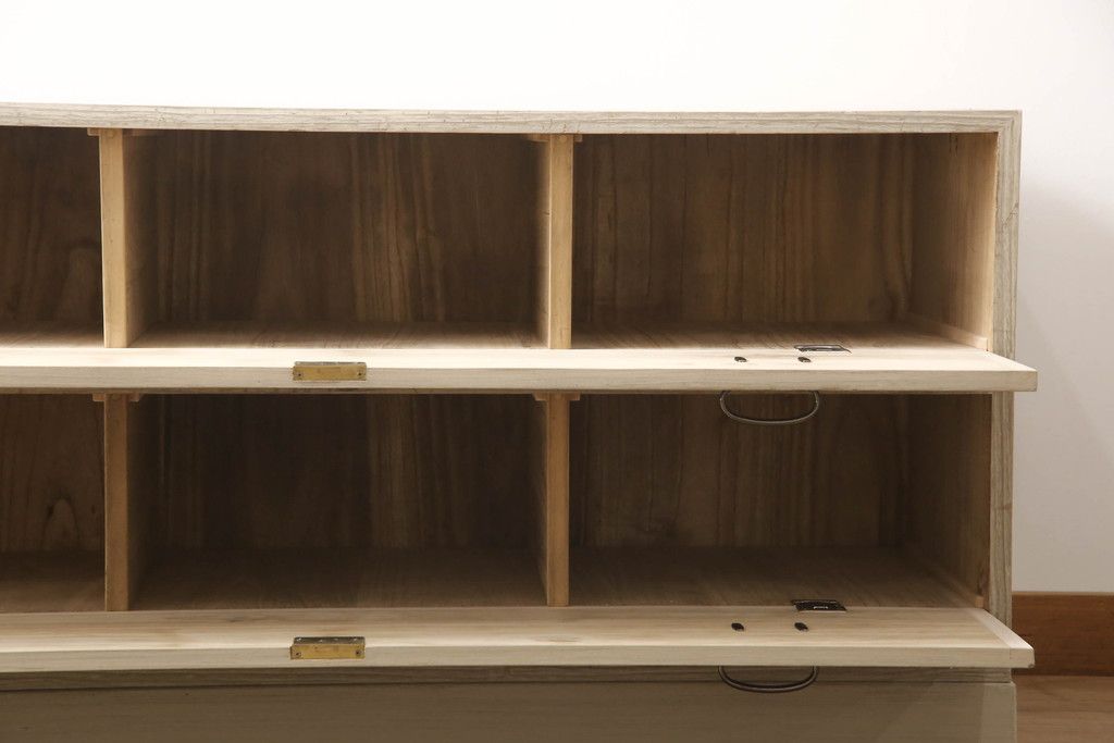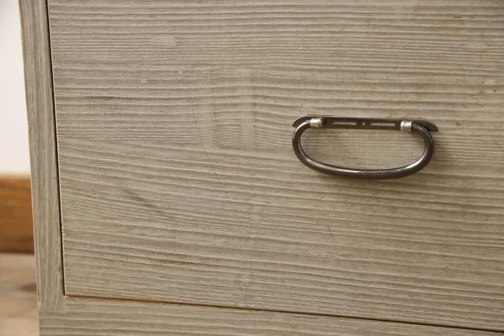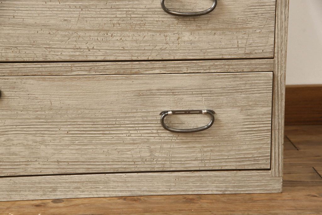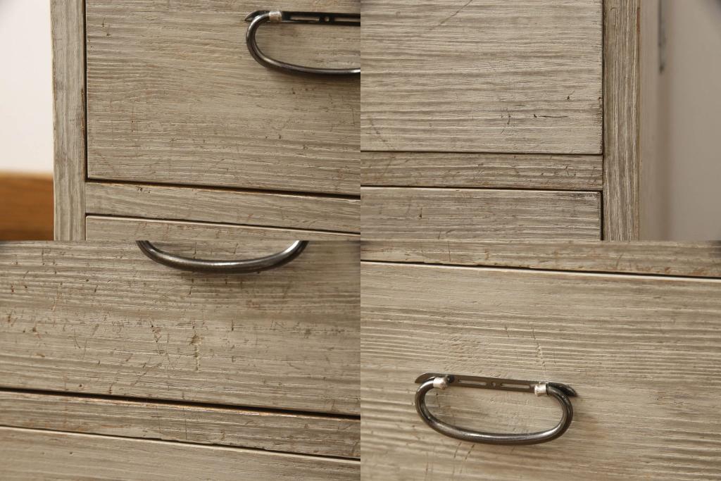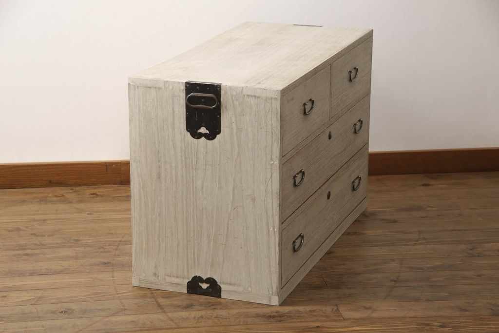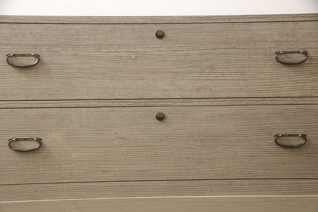 3段重ね桐箪笥を2つのローチェストにリメイク!中段は幅を小さく加工。1段目の引き出しを2分割し、新たに仕切りを追加。中段の下2段と下段の引き出しをフラップダウン仕様に。どちらとも側面に持ち手の取り付け。