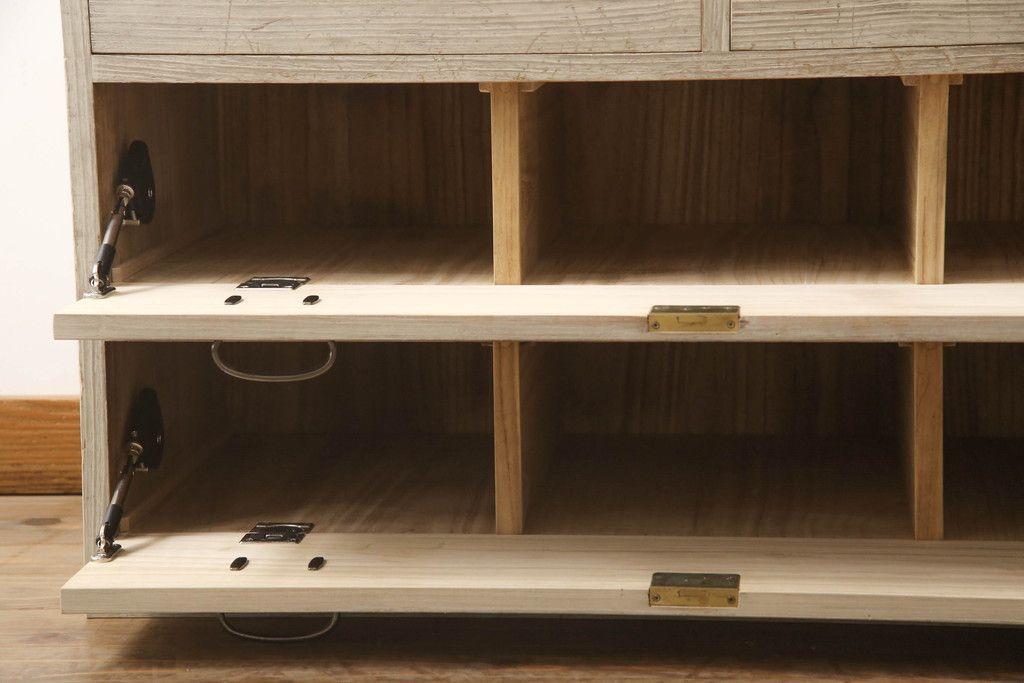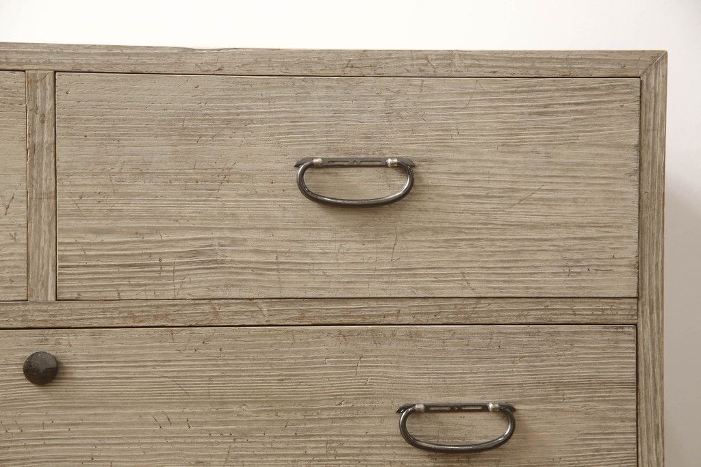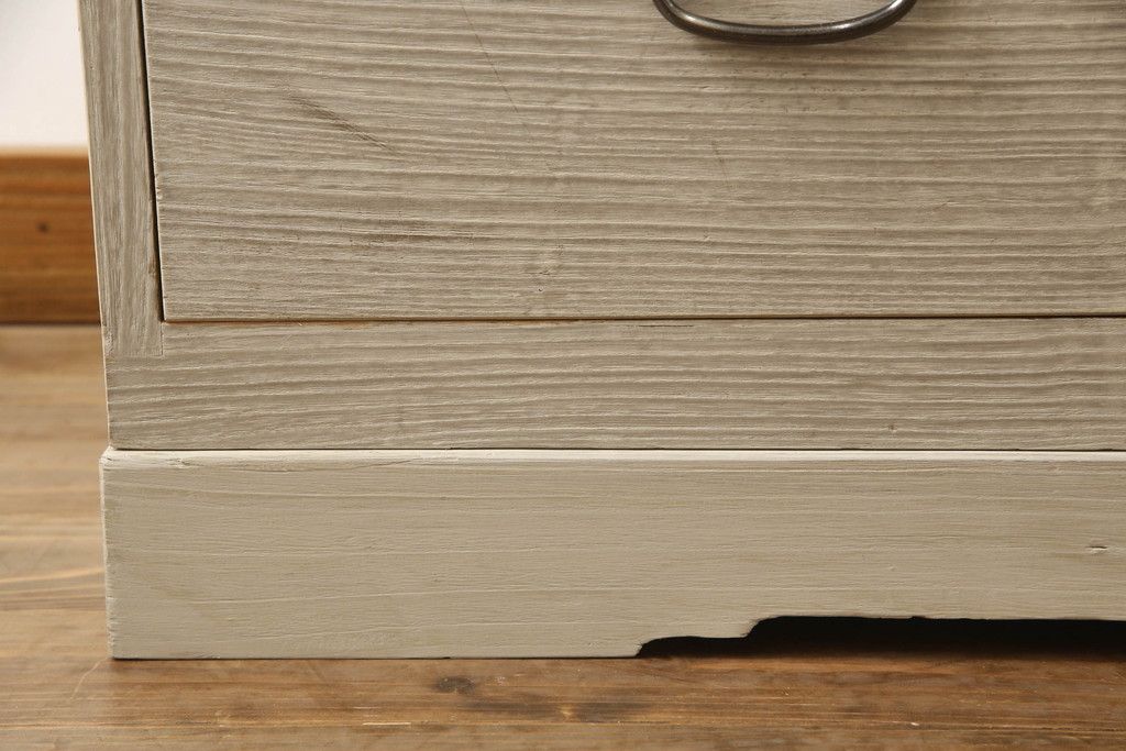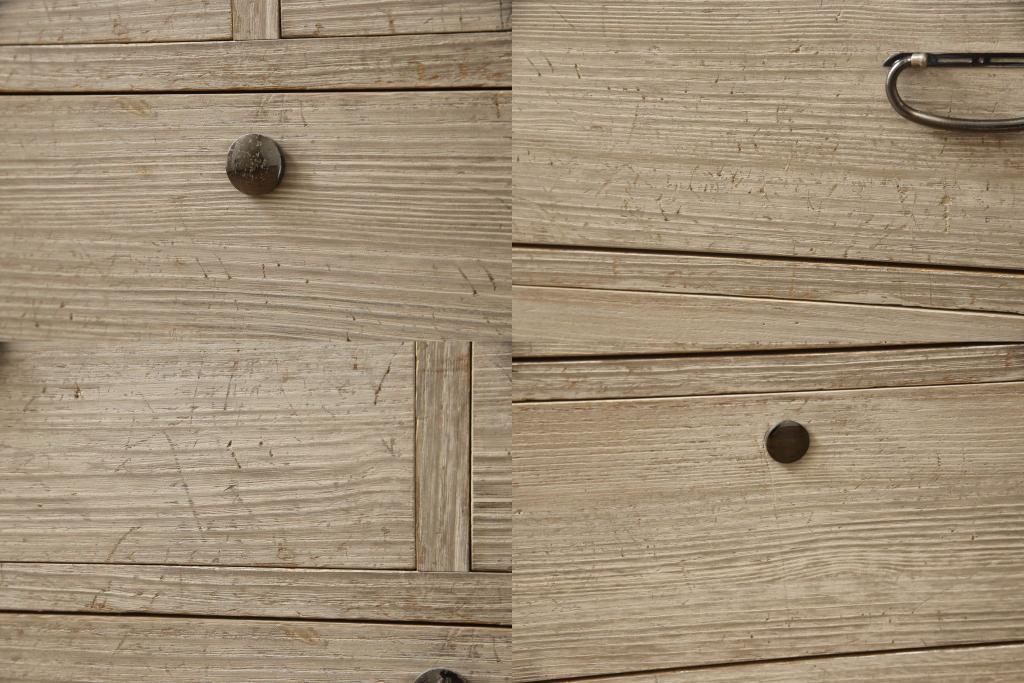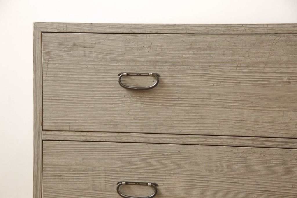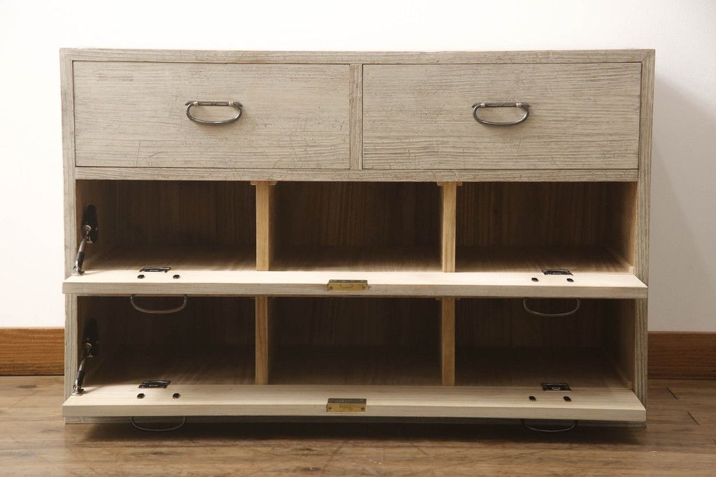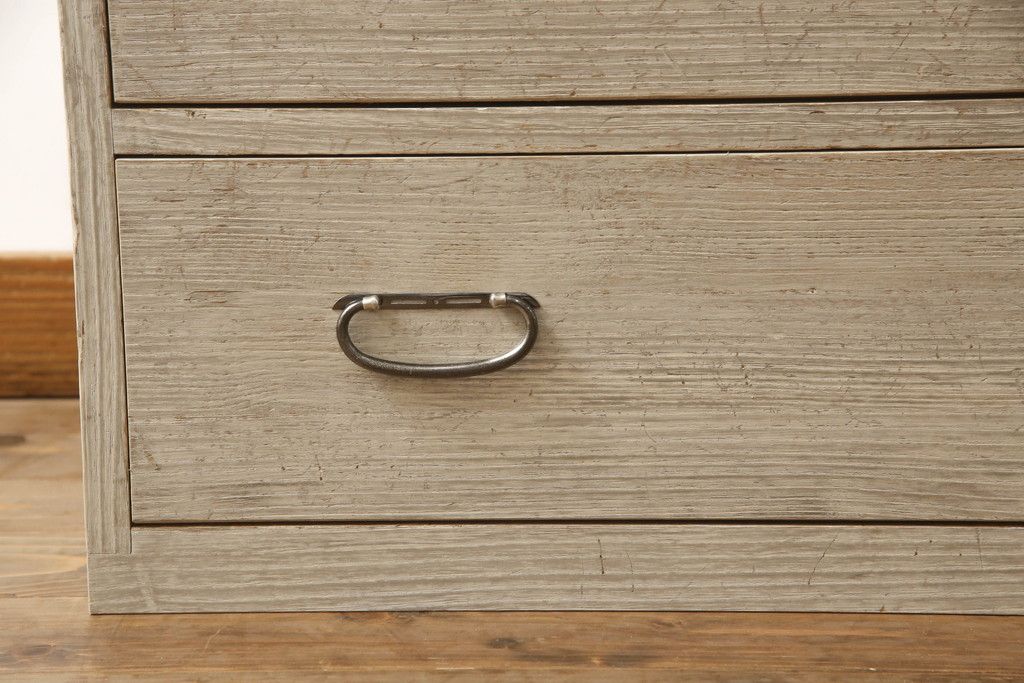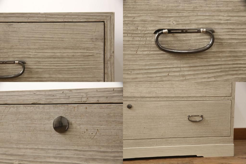 3段重ね桐箪笥を2つのローチェストにリメイク!中段は幅を小さく加工。1段目の引き出しを2分割し、新たに仕切りを追加。中段の下2段と下段の引き出しをフラップダウン仕様に。どちらとも側面に持ち手の取り付け。