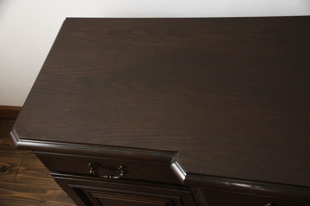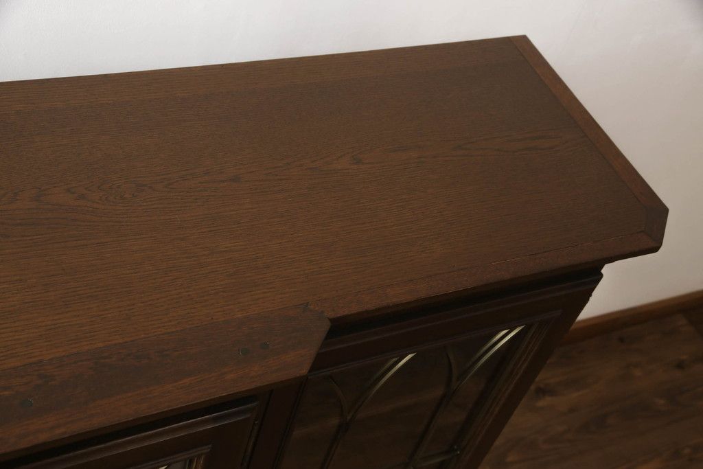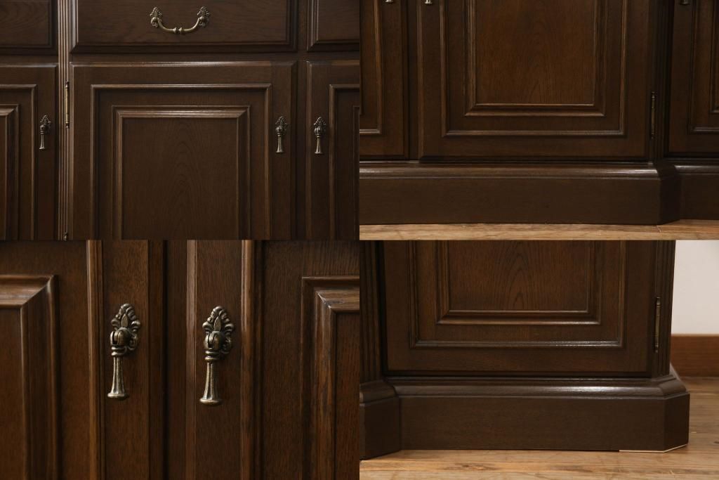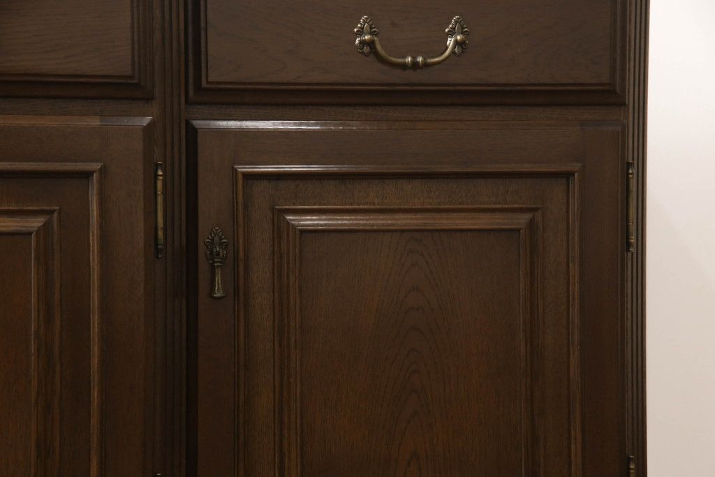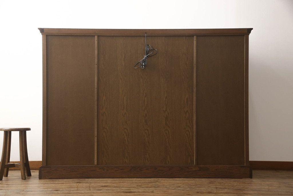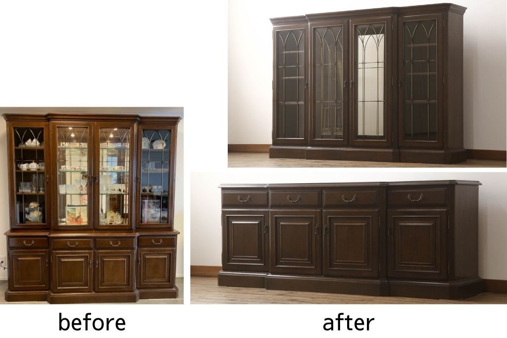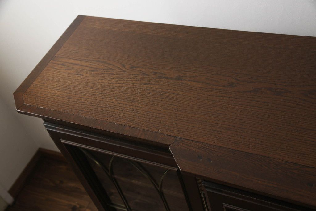 食器棚を収納棚とサイドボードにリメイク!上段はオーク材の天板と台輪を取り付け、照明をLEDに変更。下段は上段の天板を移設・表面にオーク材の突板を張り替え。