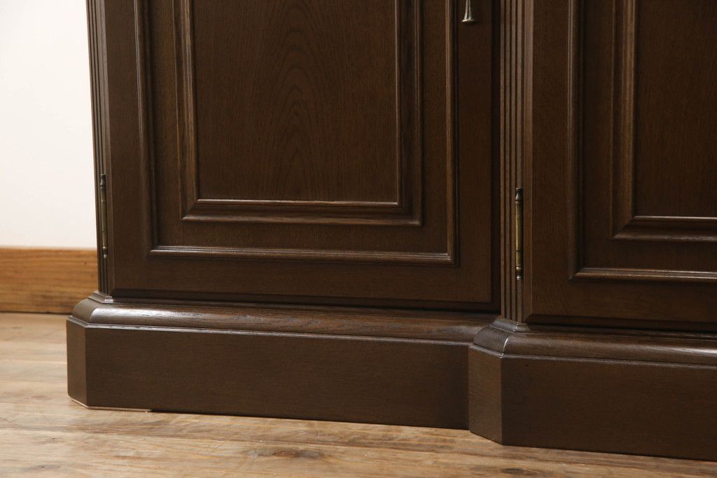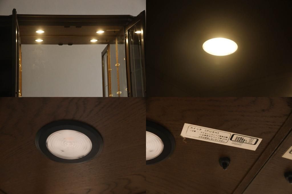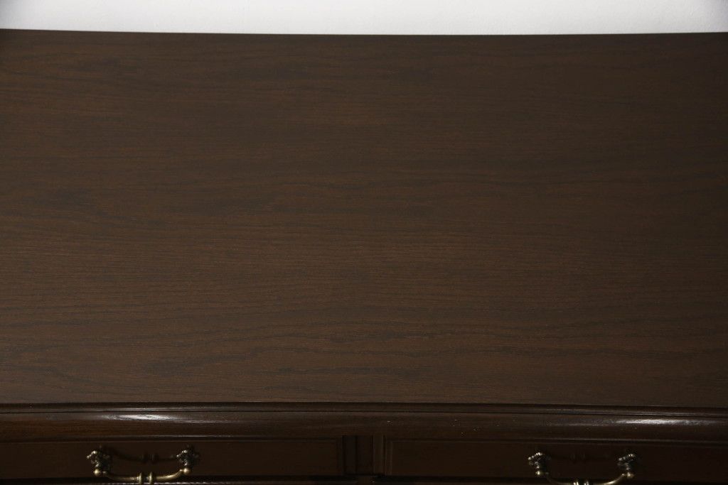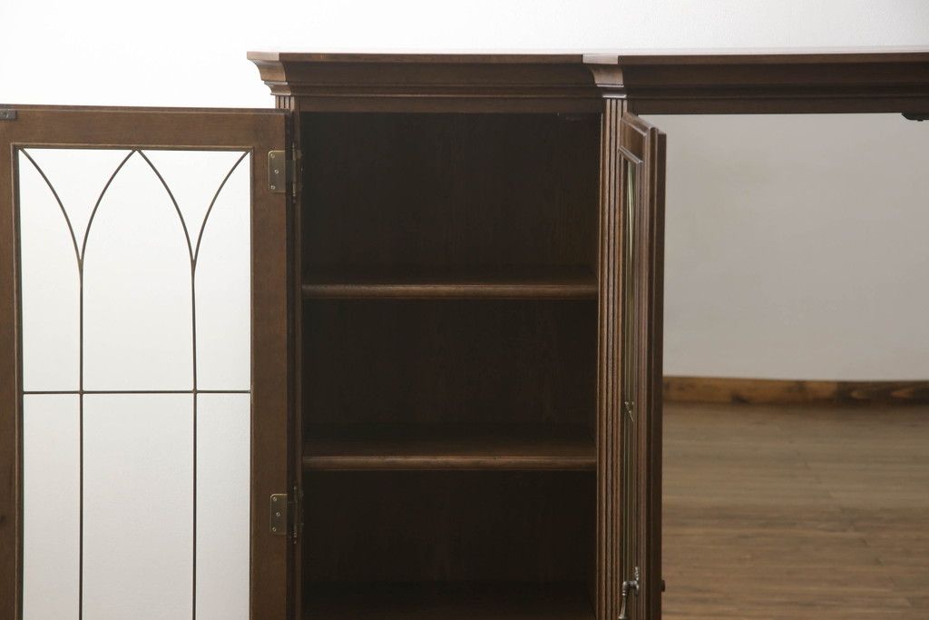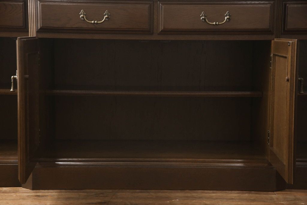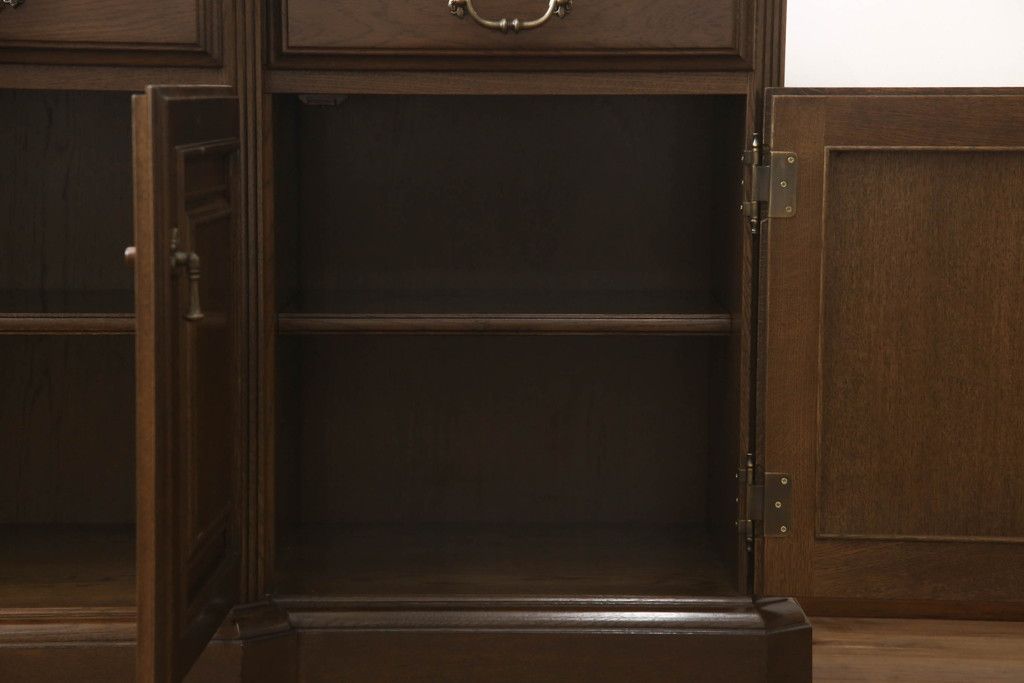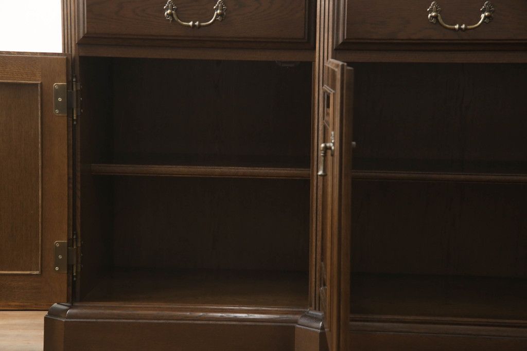食器棚を収納棚とサイドボードにリメイク!上段はオーク材の天板と台輪を取り付け、照明をLEDに変更。下段は上段の天板を移設・表面にオーク材の突板を張り替え。