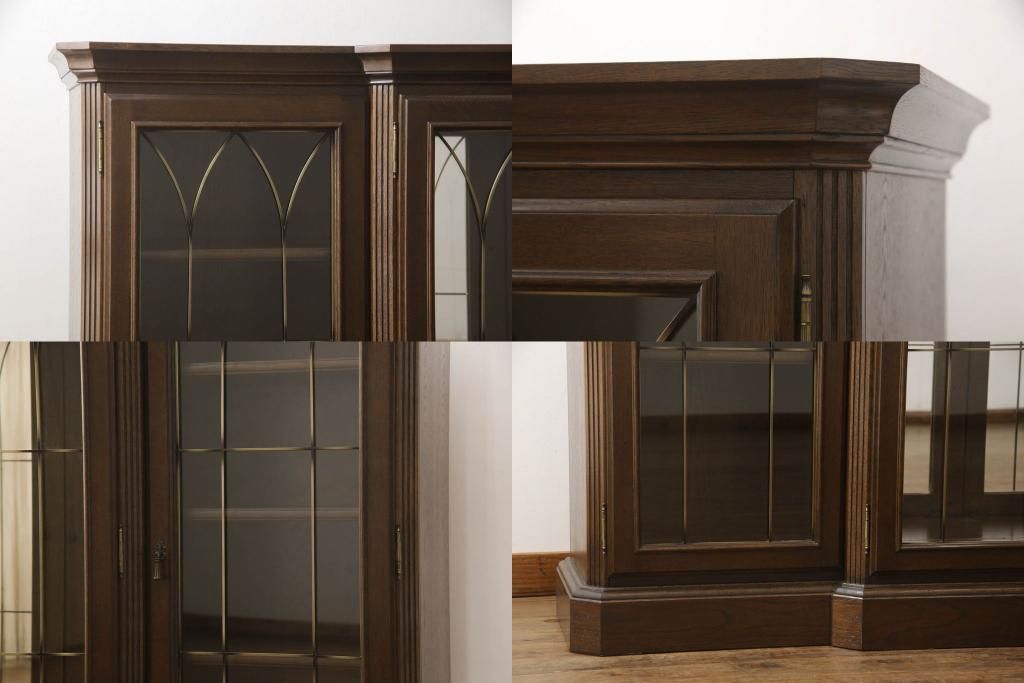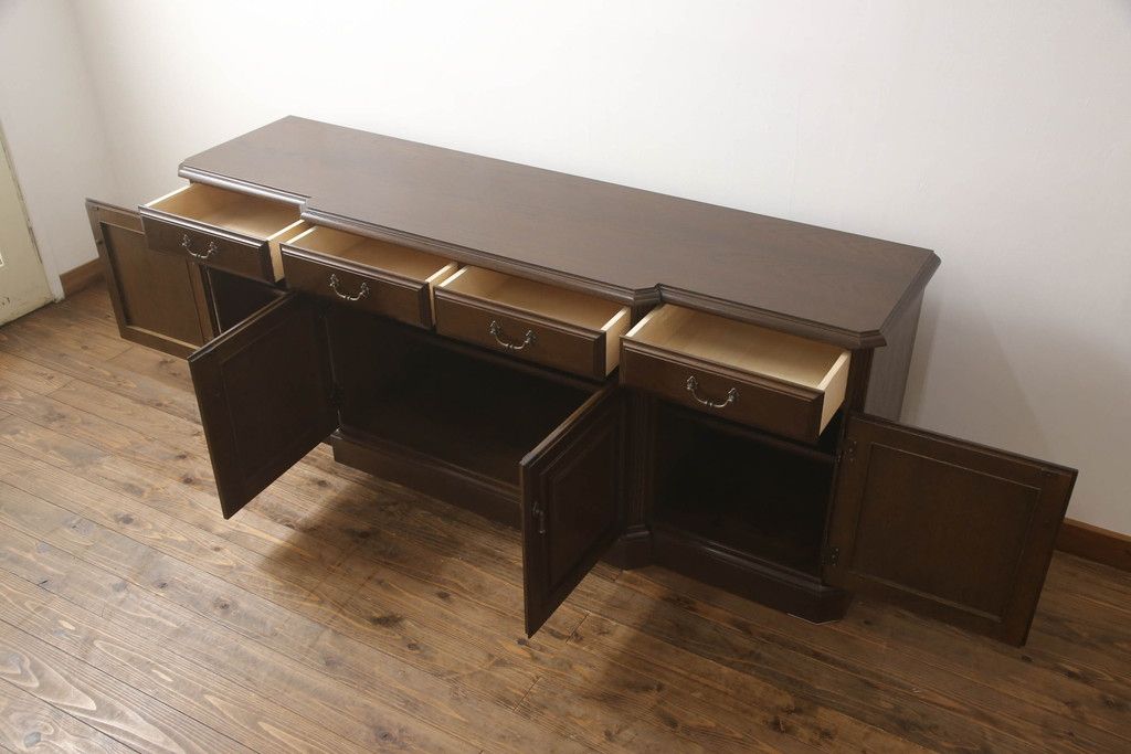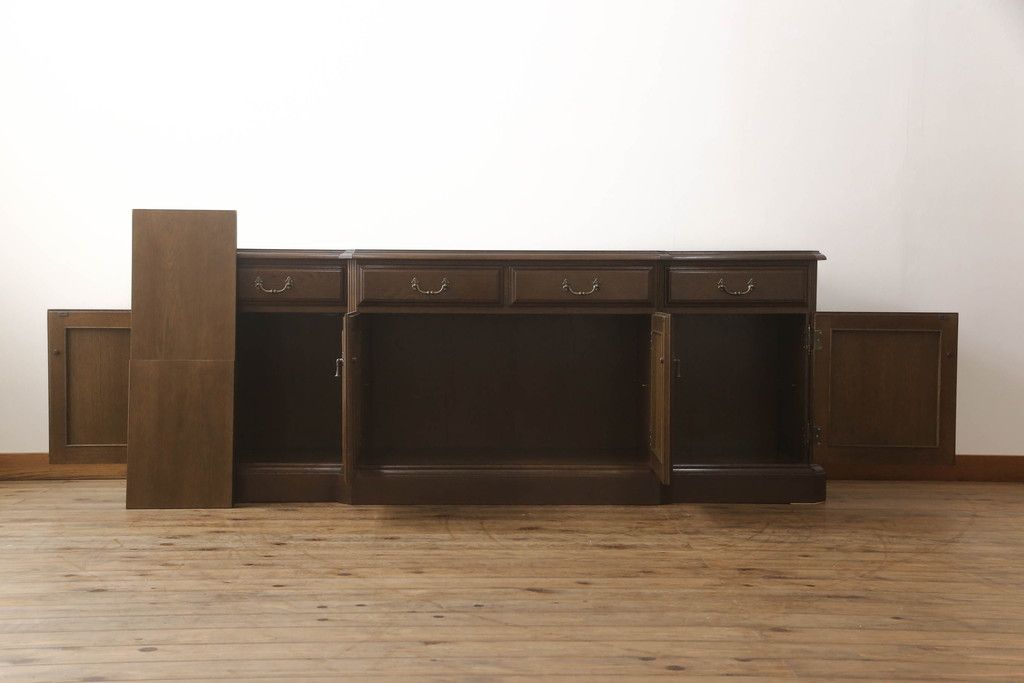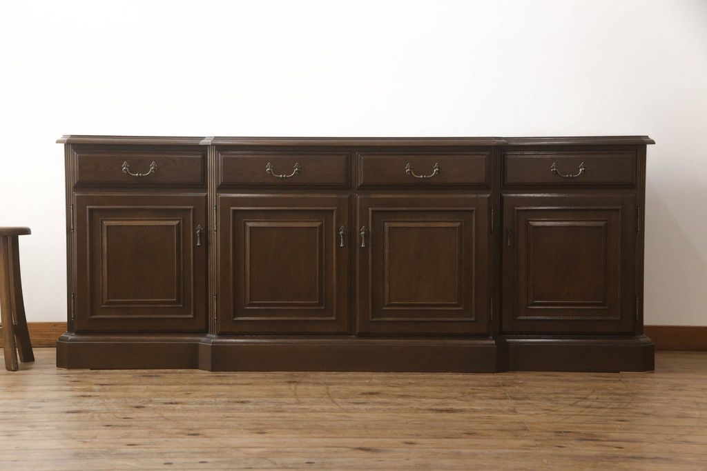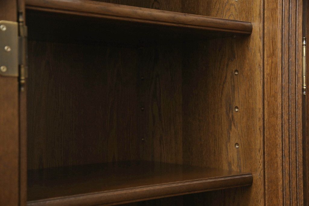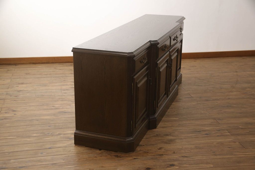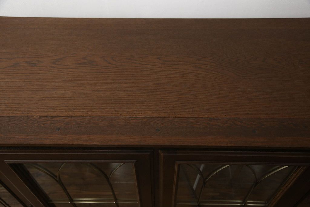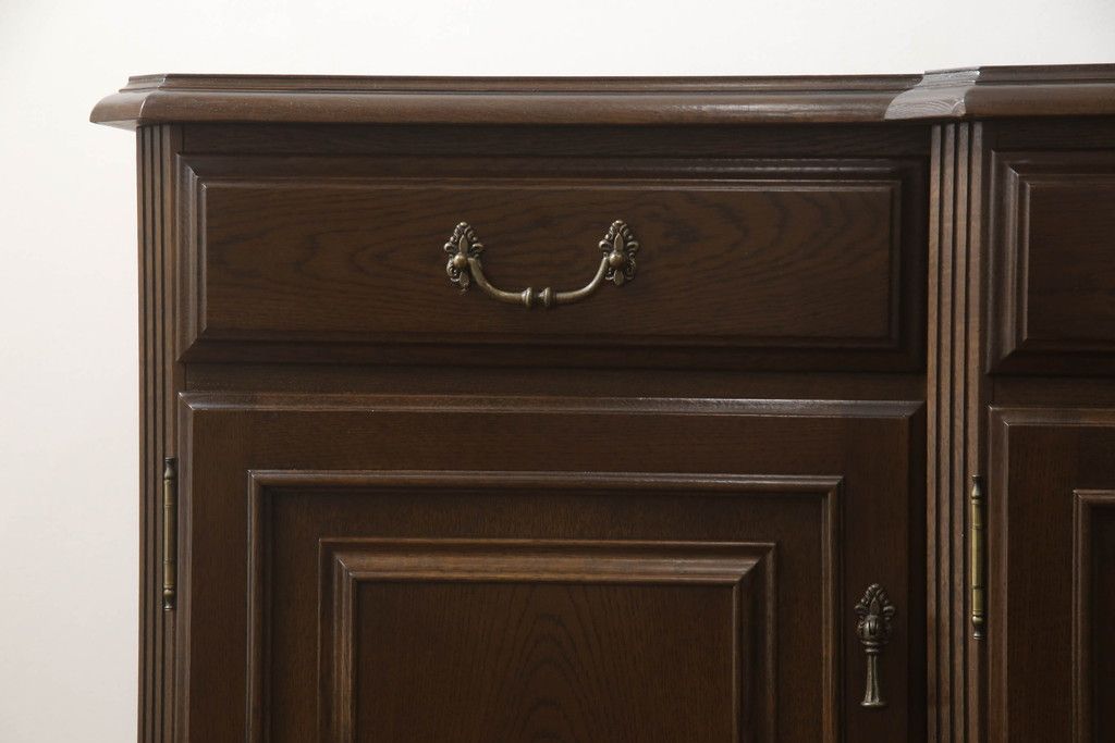食器棚を収納棚とサイドボードにリメイク!上段はオーク材の天板と台輪を取り付け、照明をLEDに変更。下段は上段の天板を移設・表面にオーク材の突板を張り替え。