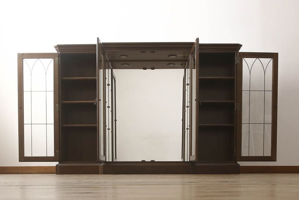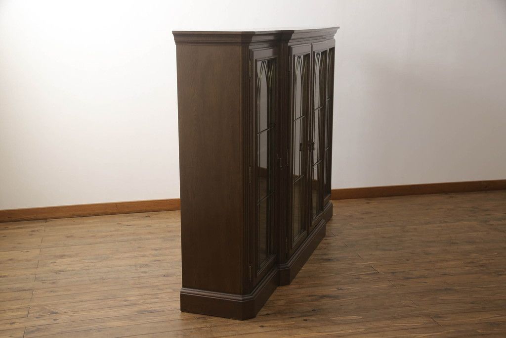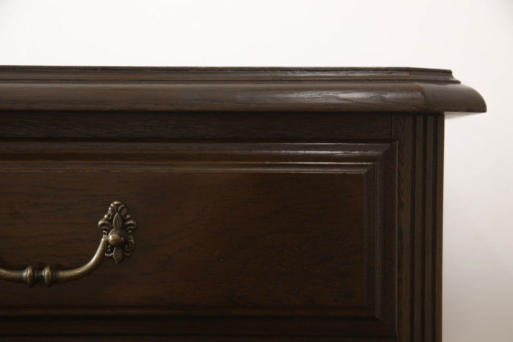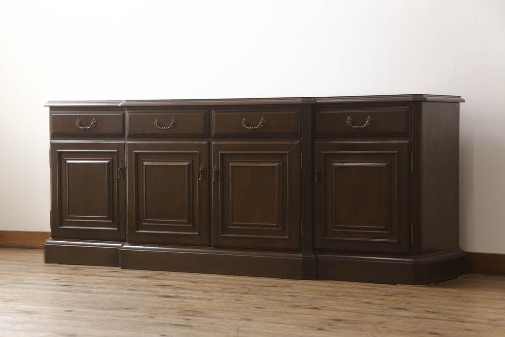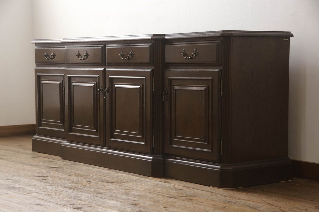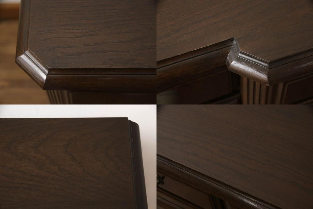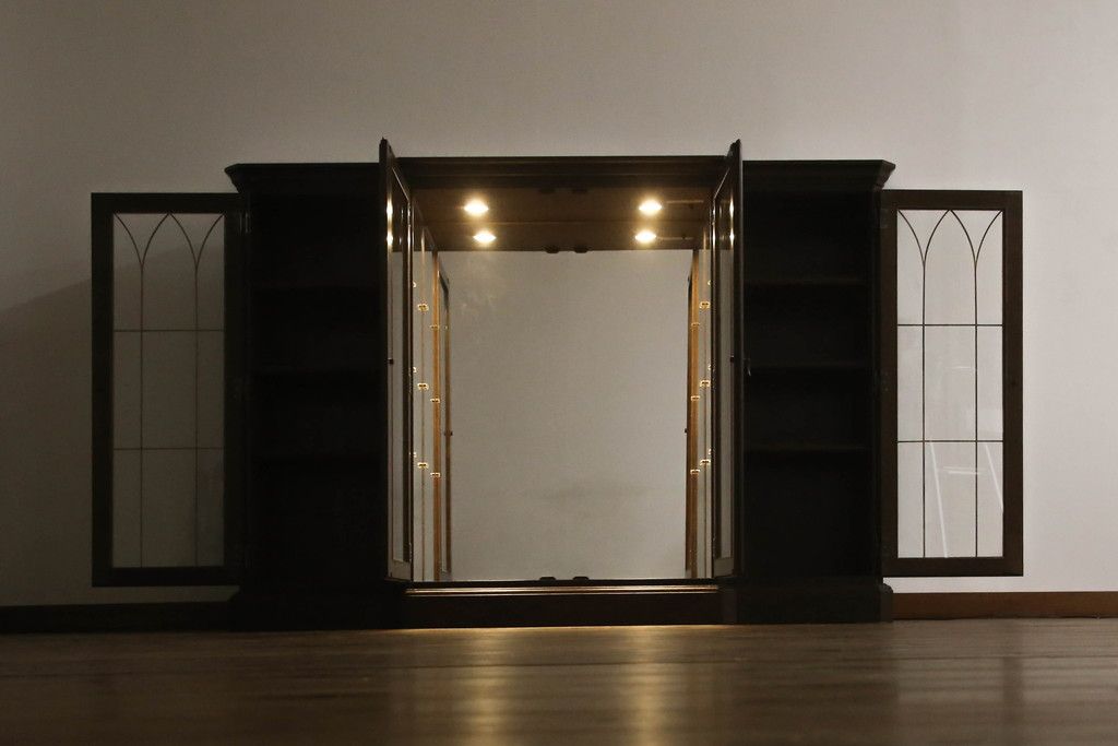 食器棚を収納棚とサイドボードにリメイク!上段はオーク材の天板と台輪を取り付け、照明をLEDに変更。下段は上段の天板を移設・表面にオーク材の突板を張り替え。