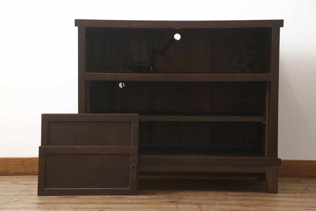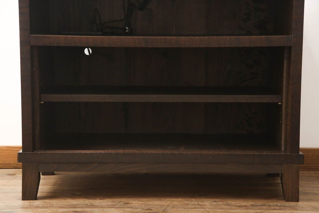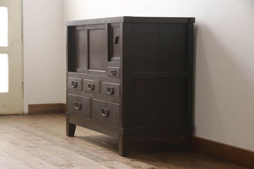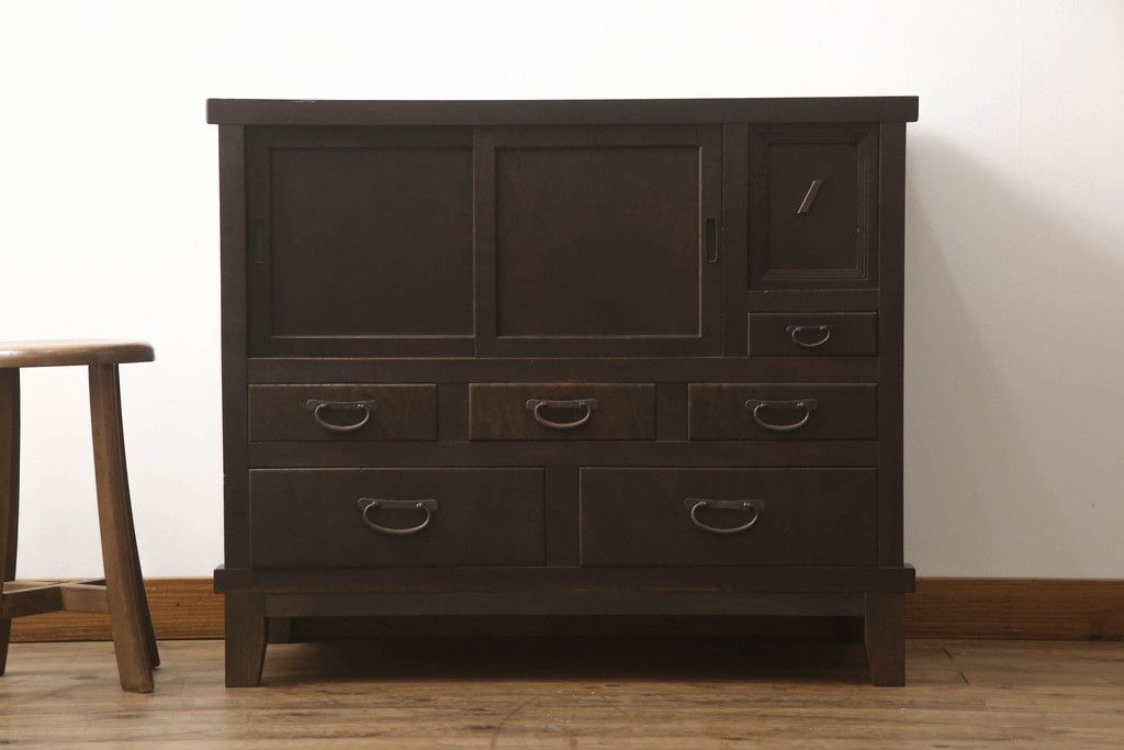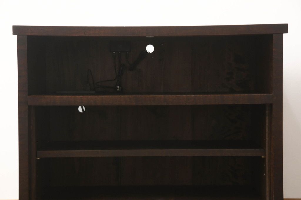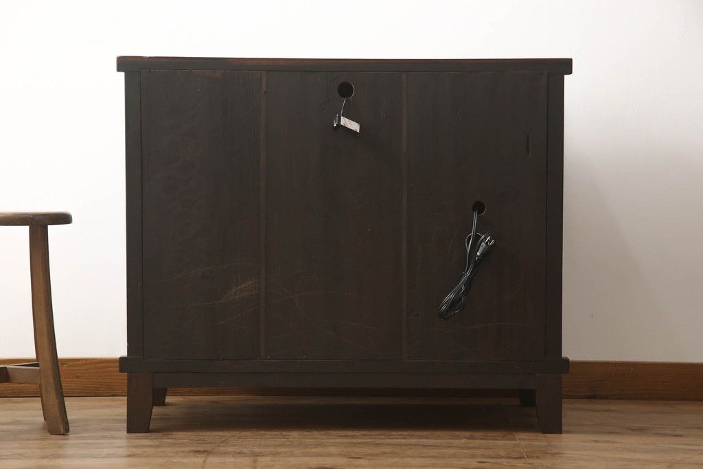 お手持ちの家具・建具リメイク実績 > 2段重ね箪笥を2つのサイドボードにリメイク!上段の開き戸に棚受けと棚板を制作し、電源タップとリモコン中継器を取り付け。下段は棚底を張り替え。いずれも引手・取っ手を交換し脚を付けて、新材は本体に合わせて着色。本体は1トーン落ち着いた色に仕上げ。