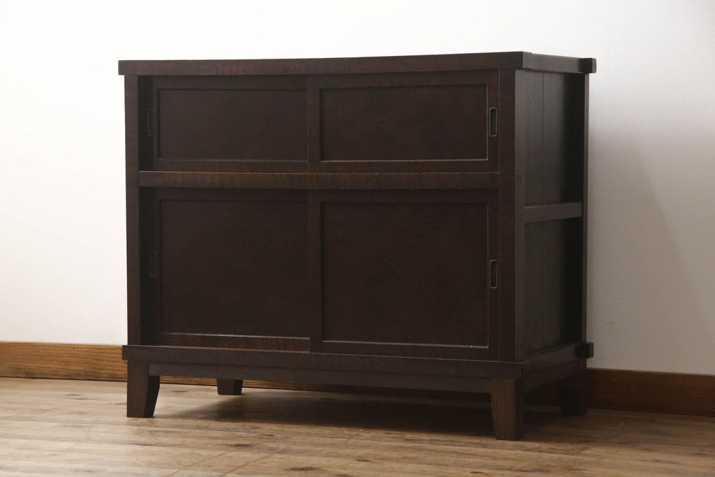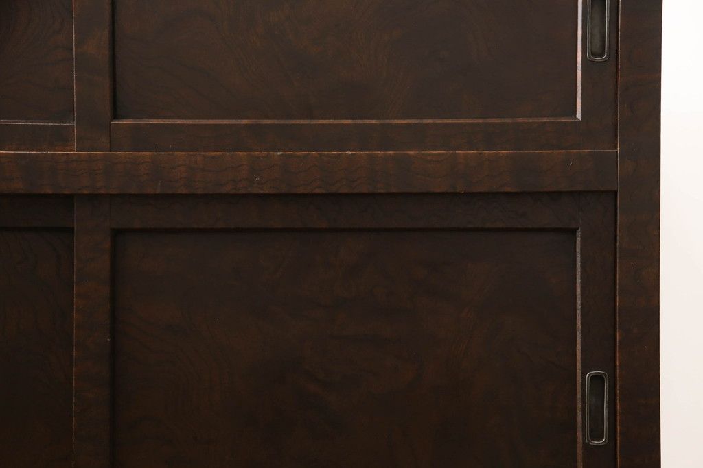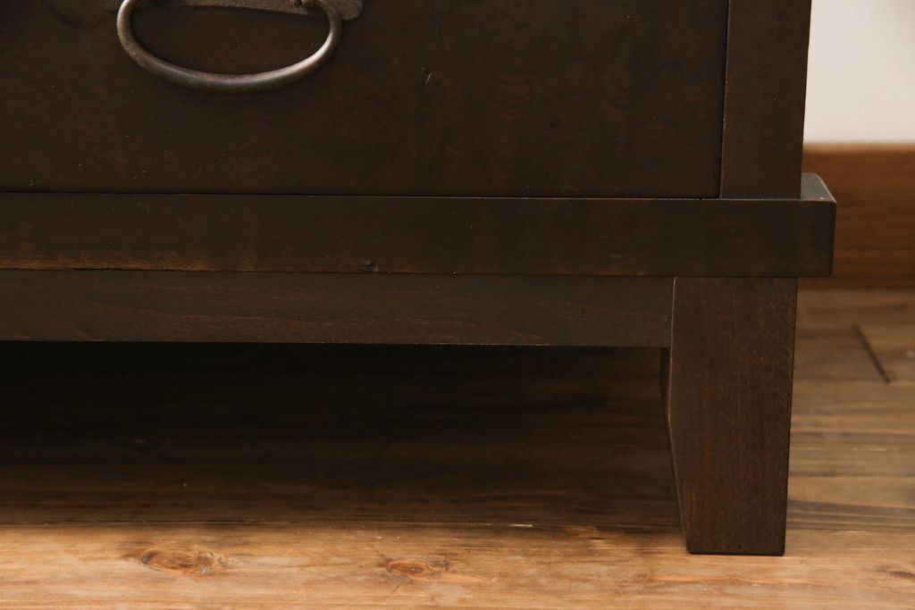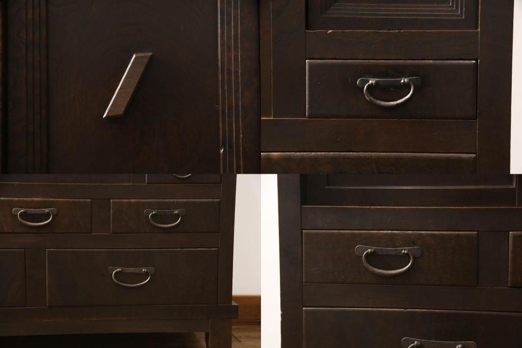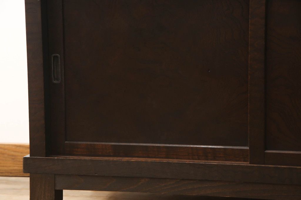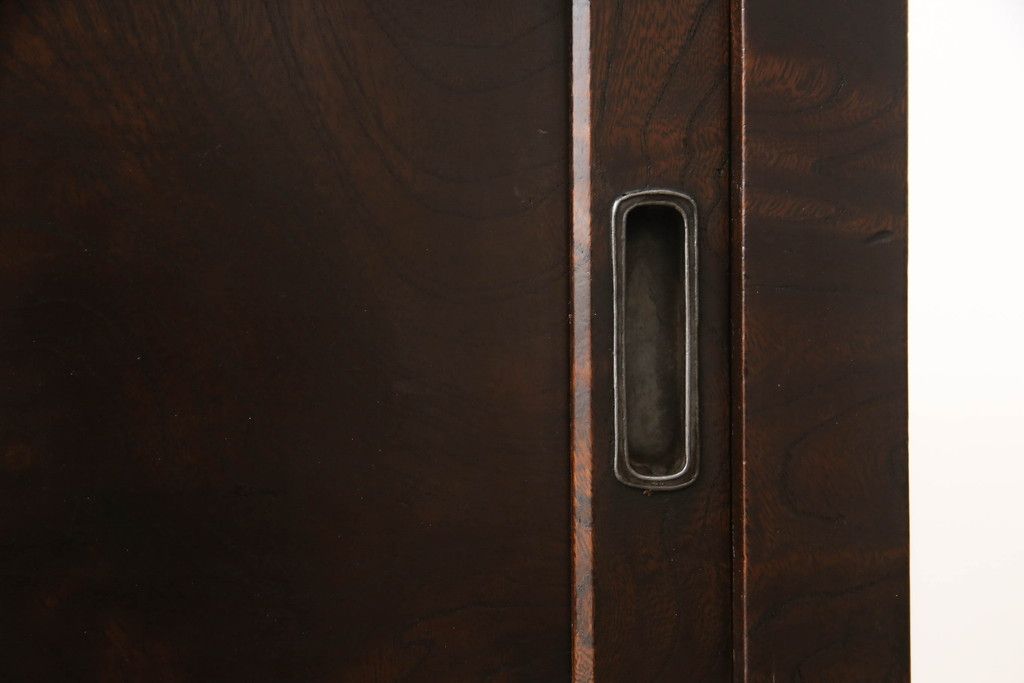お手持ちの家具・建具リメイク実績 > 2段重ね箪笥を2つのサイドボードにリメイク!上段の開き戸に棚受けと棚板を制作し、電源タップとリモコン中継器を取り付け。下段は棚底を張り替え。いずれも引手・取っ手を交換し脚を付けて、新材は本体に合わせて着色。本体は1トーン落ち着いた色に仕上げ。