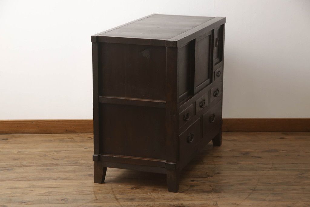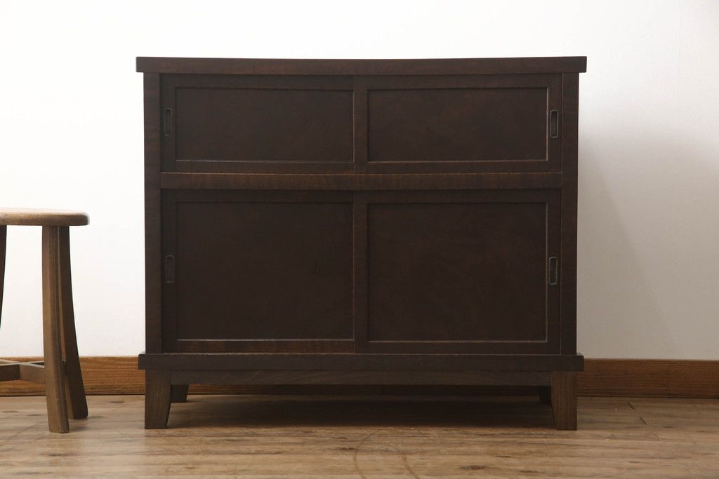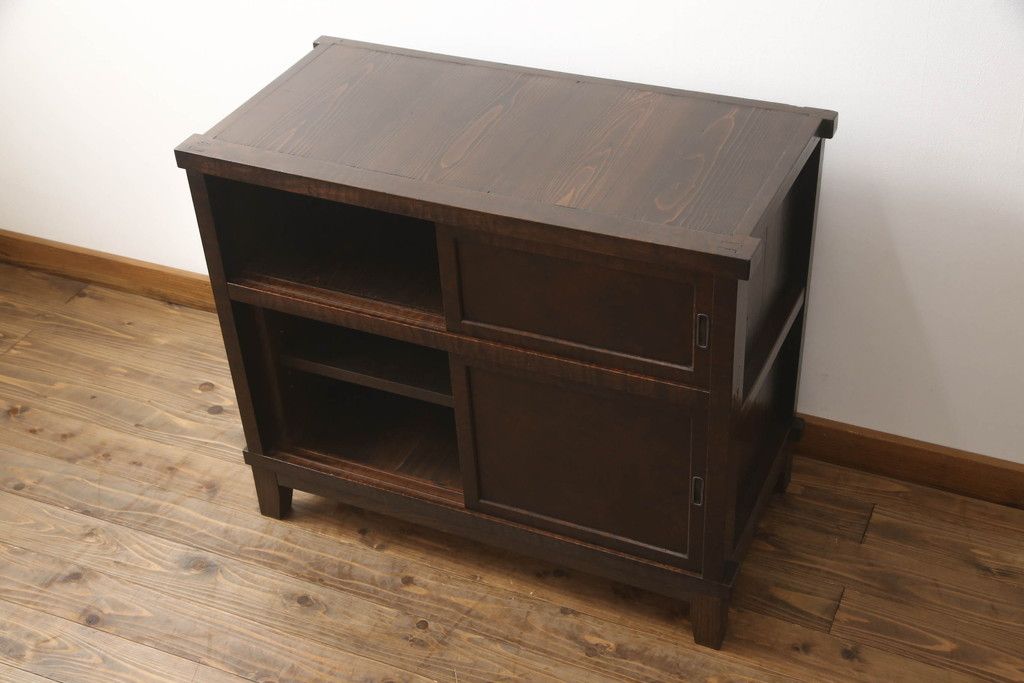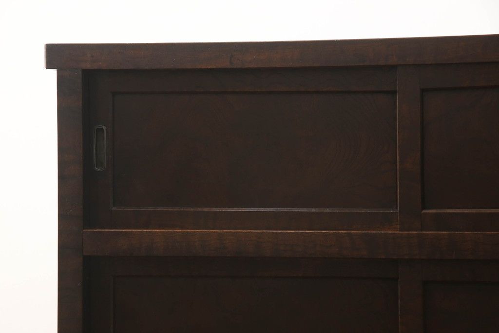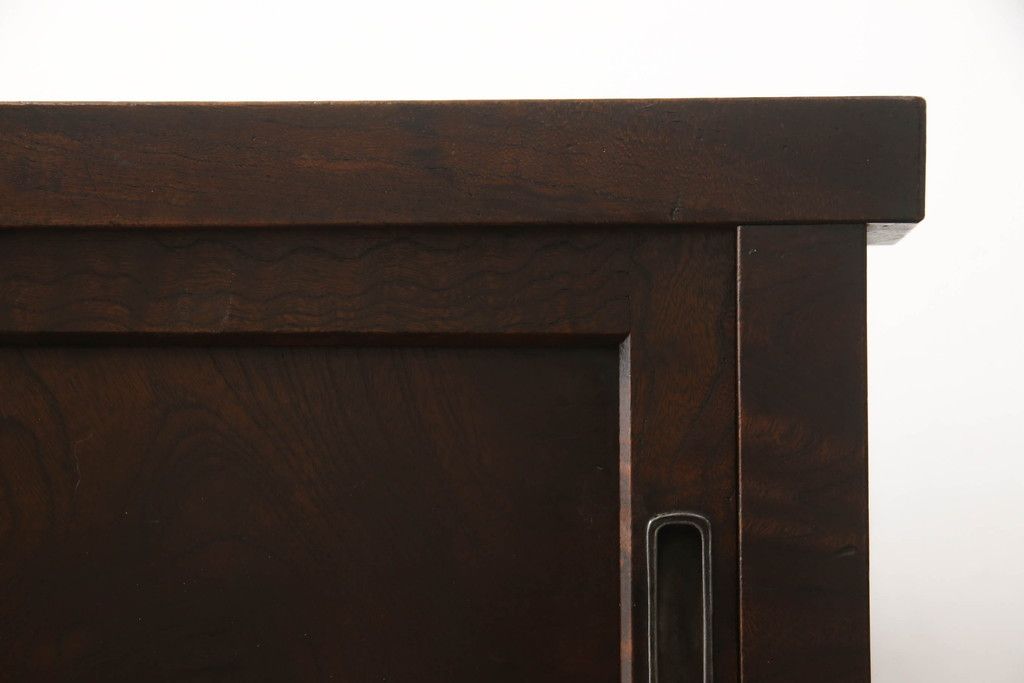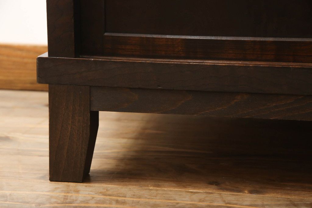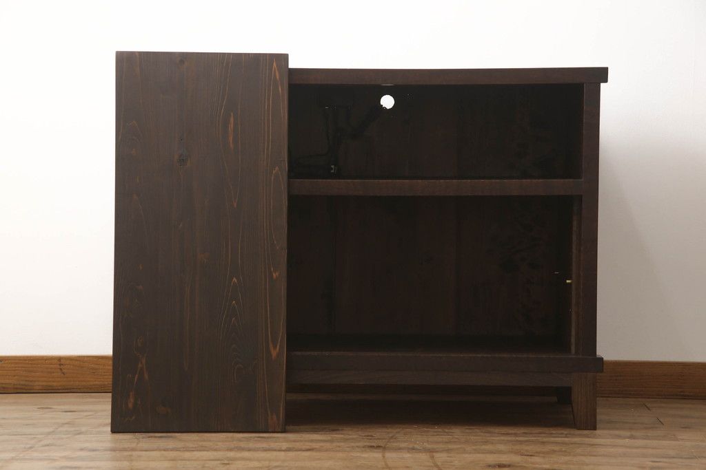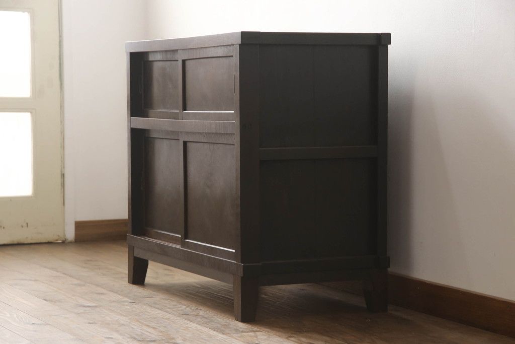 2段重ね箪笥を2つのサイドボードにリメイク!上段の開き戸に棚受けと棚板を制作し、電源タップとリモコン中継器を取り付け。下段は棚底を張り替え。いずれも引手・取っ手を交換し脚を付けて、新材は本体に合わせて着色。本体は1トーン落ち着いた色に仕上げ。
