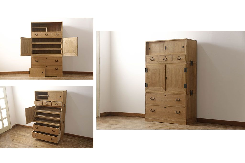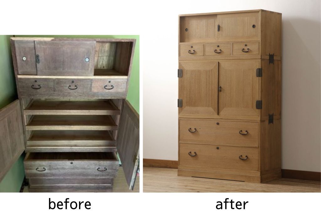 3段重ね桐箪笥を綺麗に再生!クリーニングを施し、可動部分の調整、接合部分の締め直し施工。クリアワックスで仕上げ。