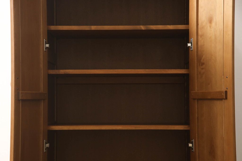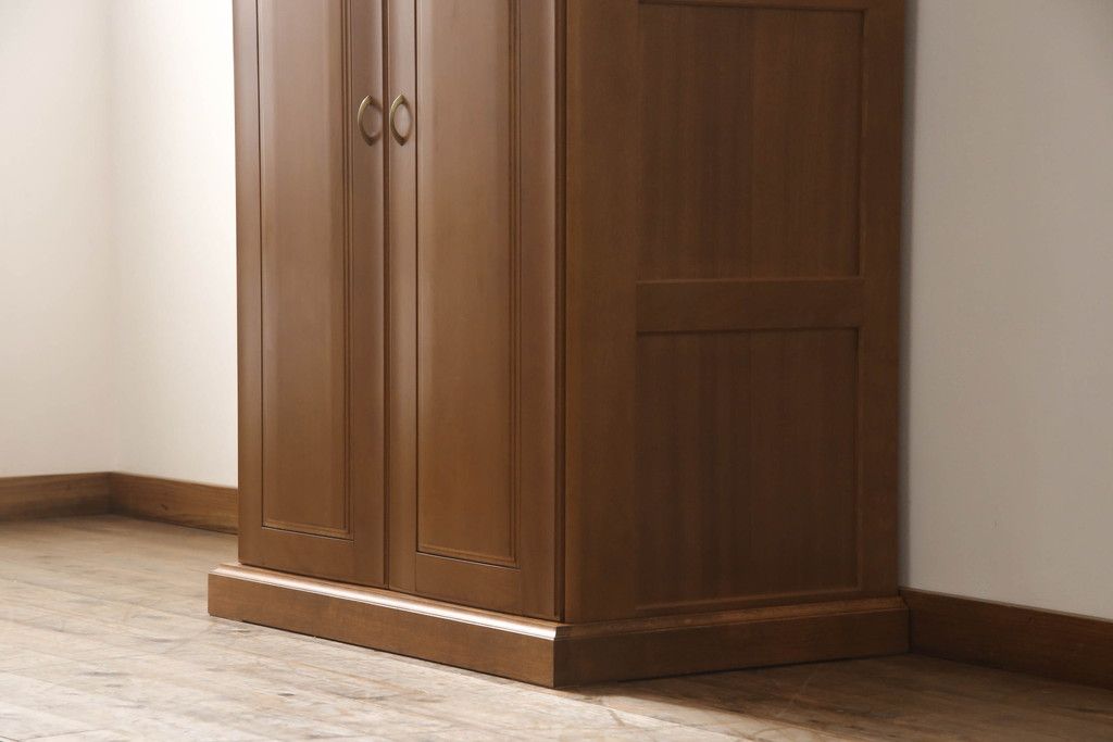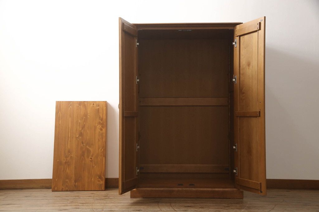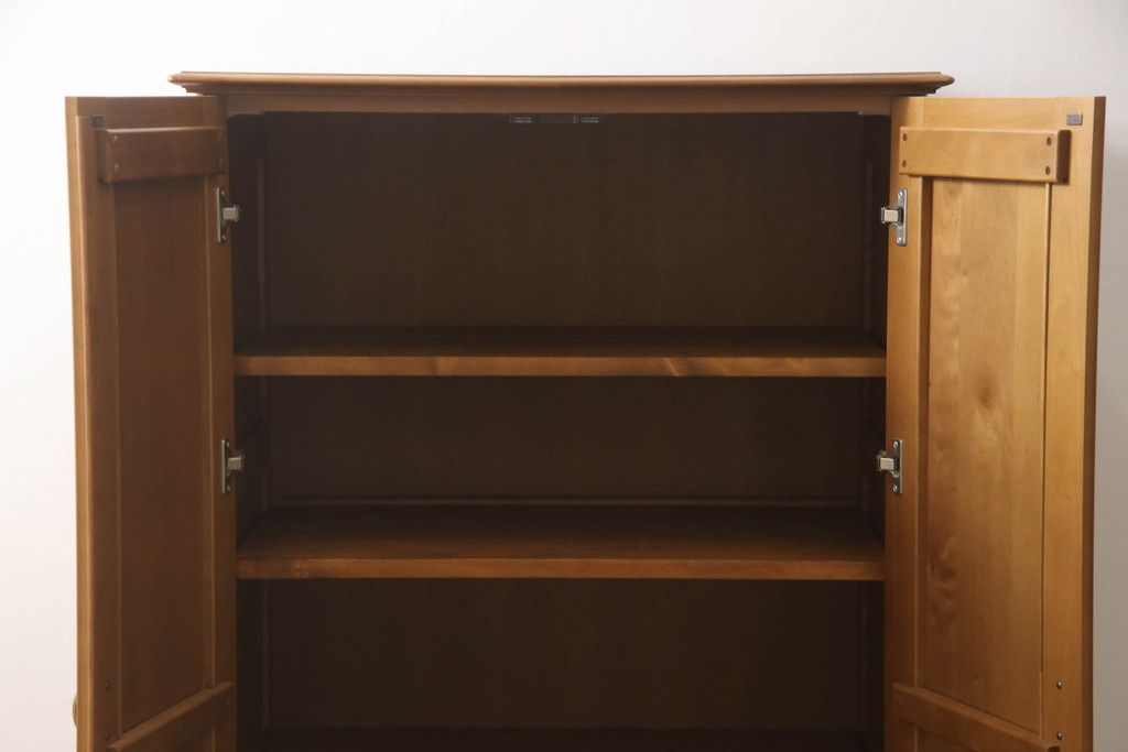 ワードローブを収納棚とテレビ台にリメイク!上部は横幅もリサイズし、底面と台輪を取り付け。可動式の棚を製作して収納棚に。下部は高さをカットし、天板と棚板を製作してオープンタイプのテレビ台に。