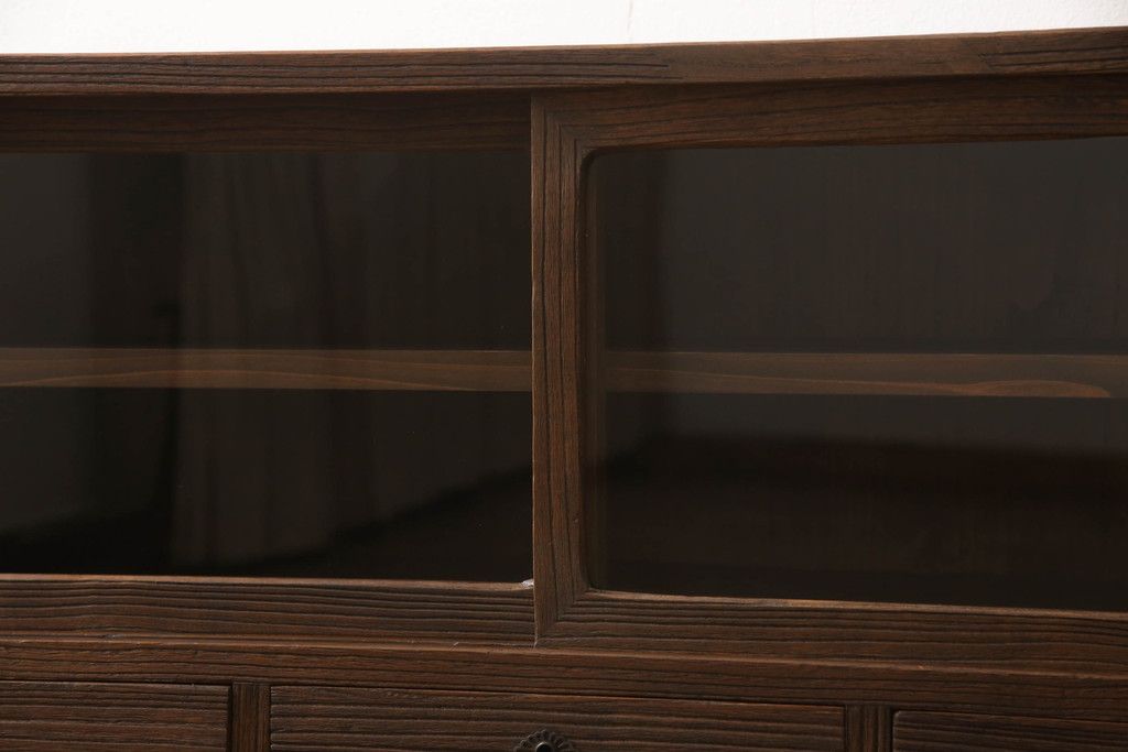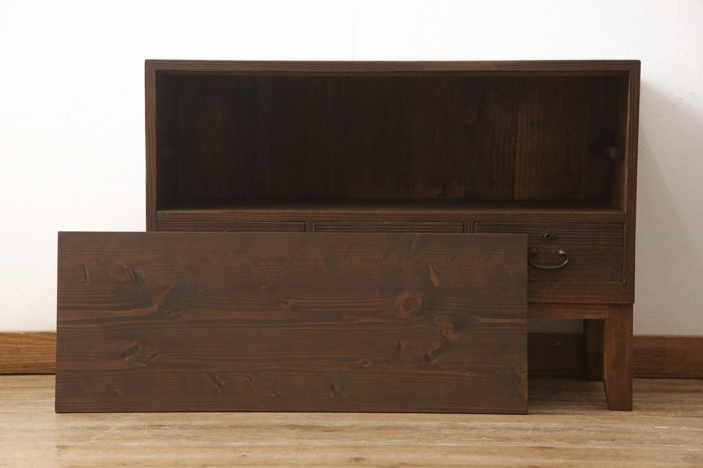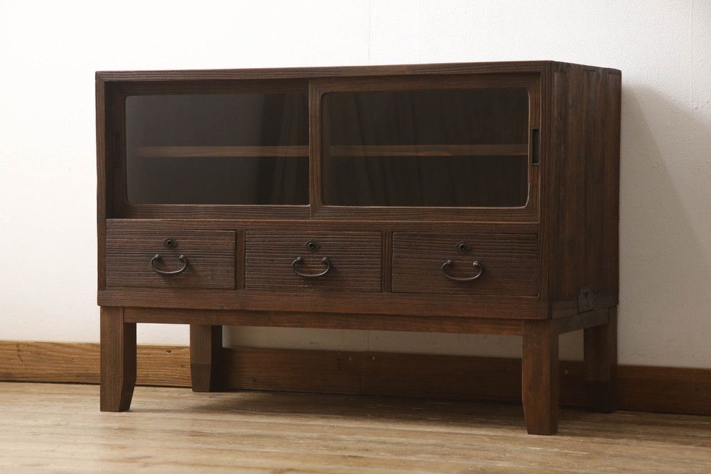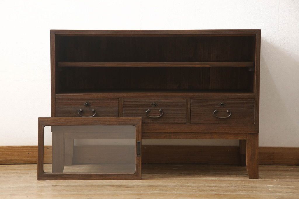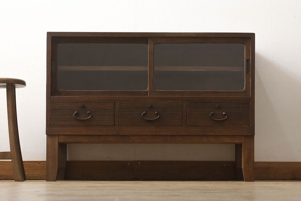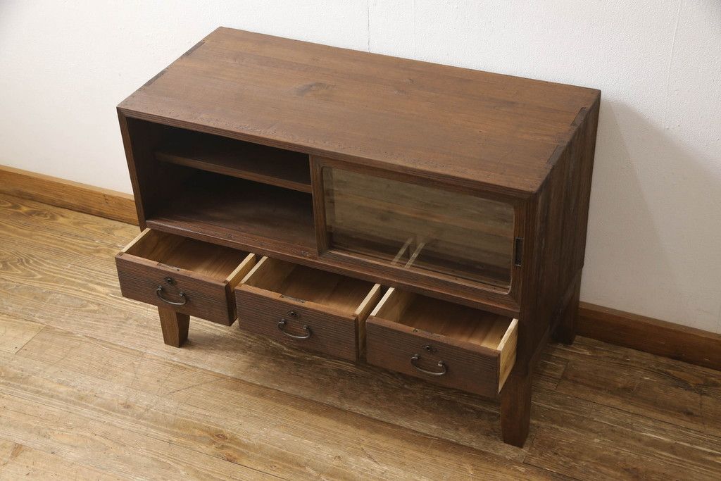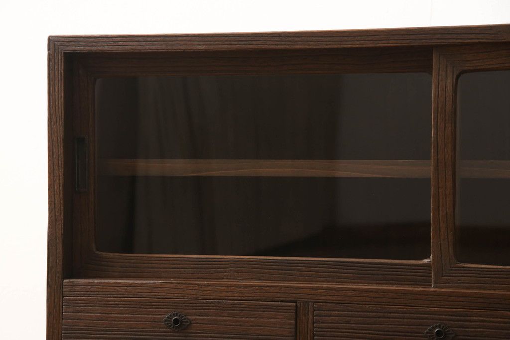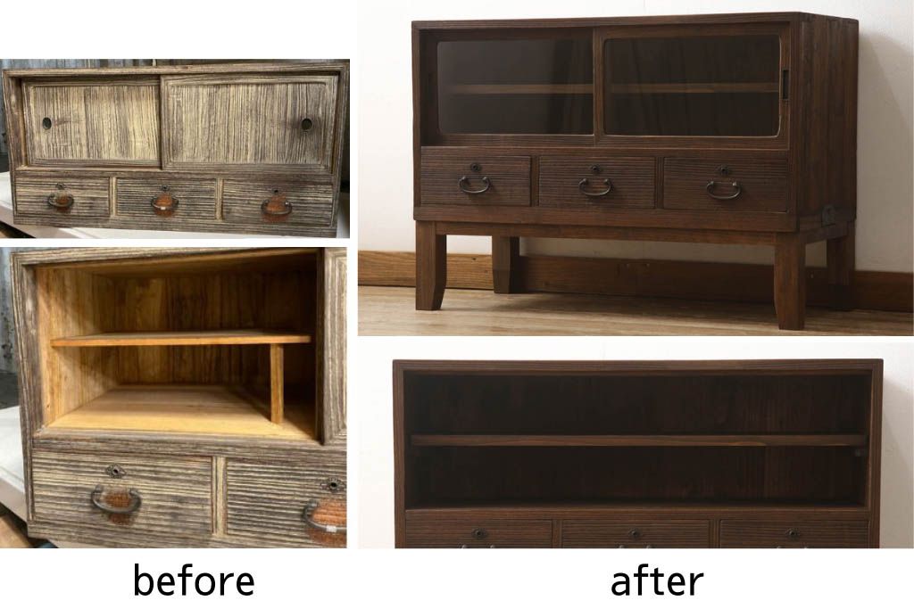 桐箪笥をローボードにリメイク!引き戸にクリアガラスをはめ込み、引手を取り付け。既存の棚板を撤去し新たな棚下を製作、脚を取り付け。オーク系に着色して仕上げ。