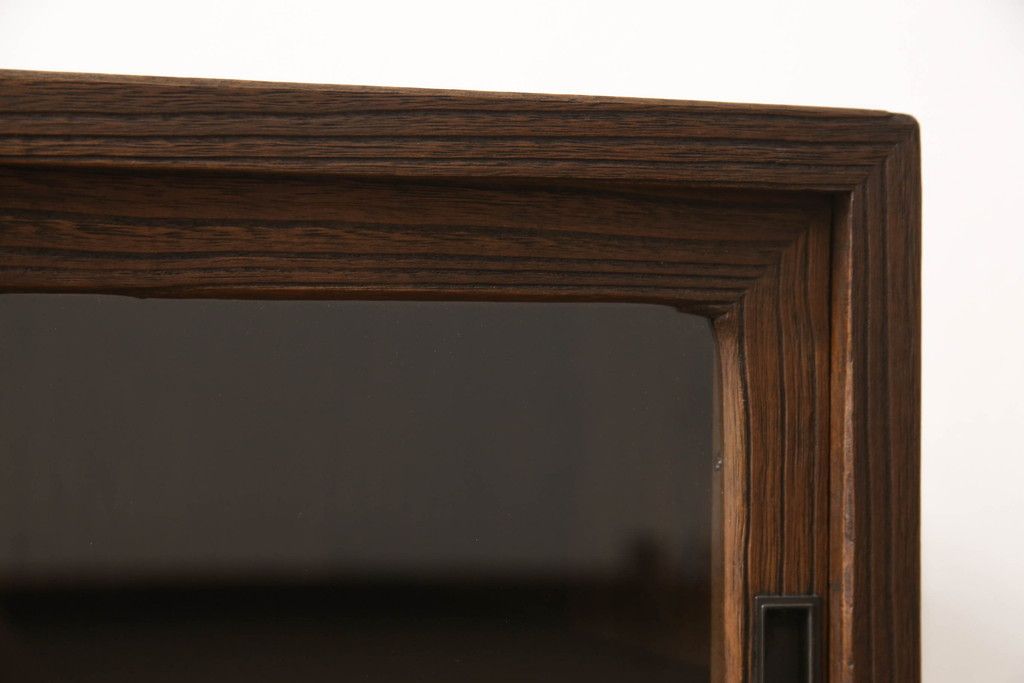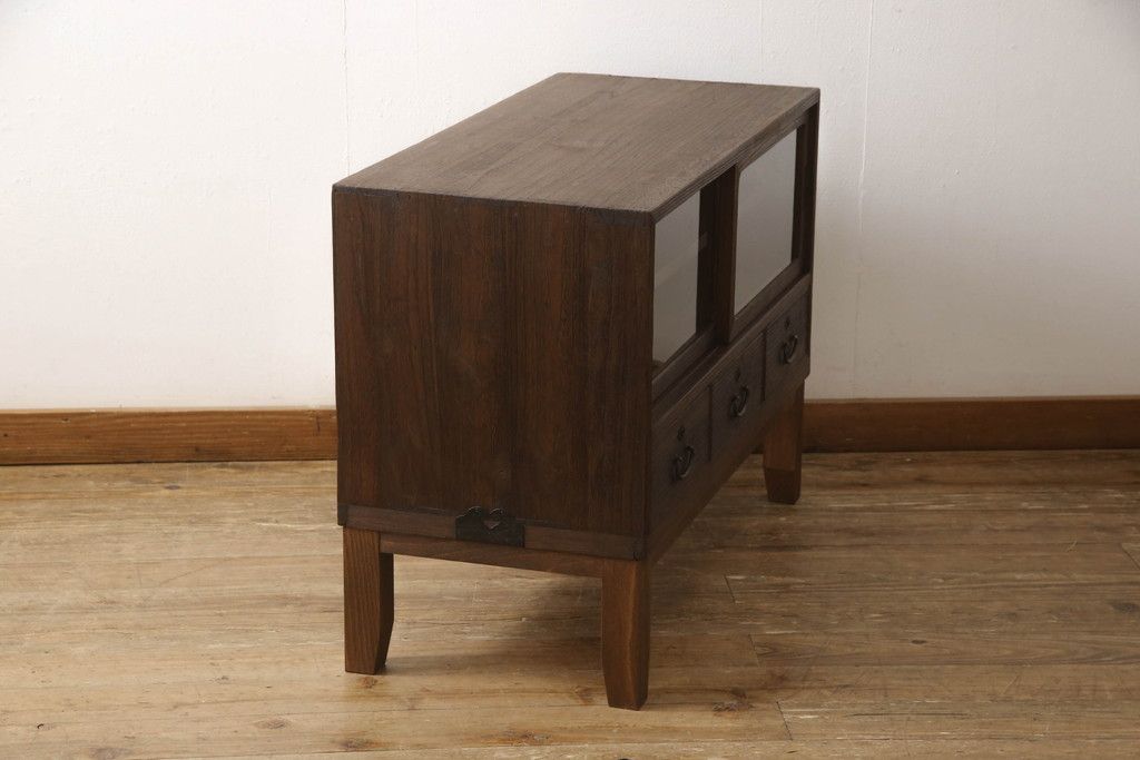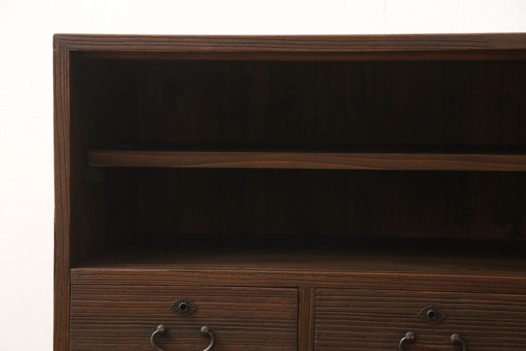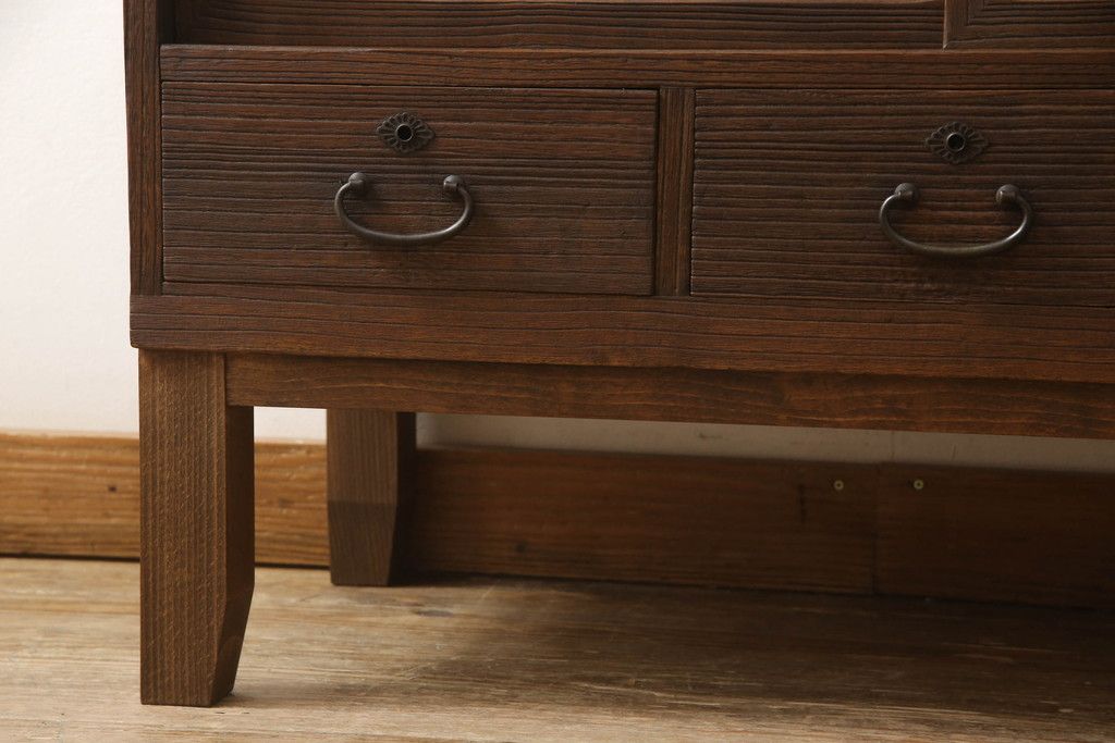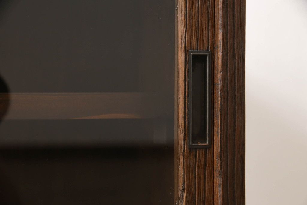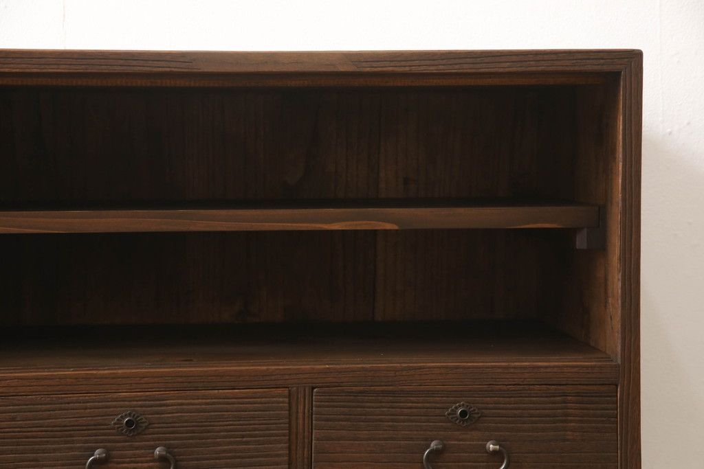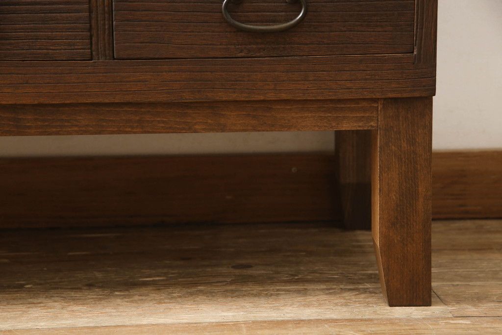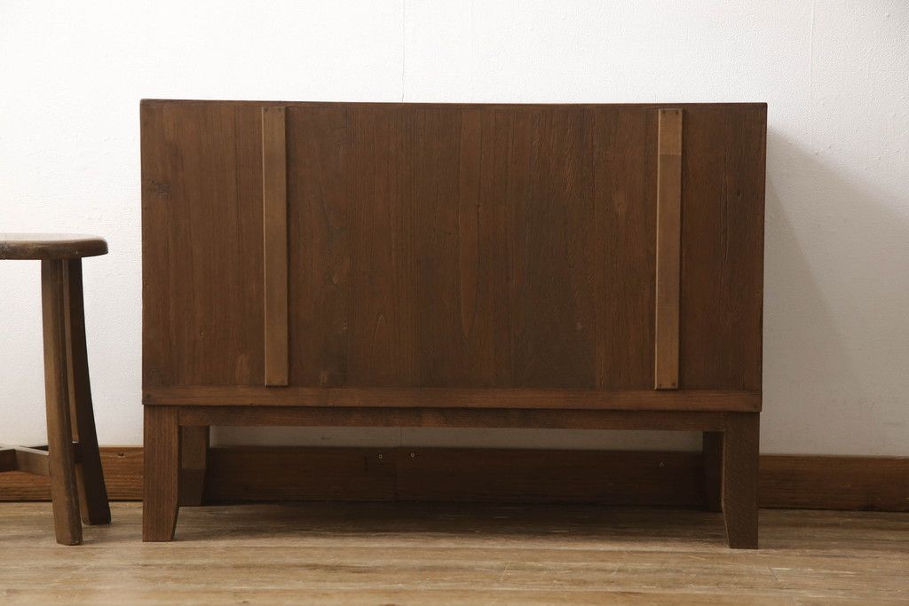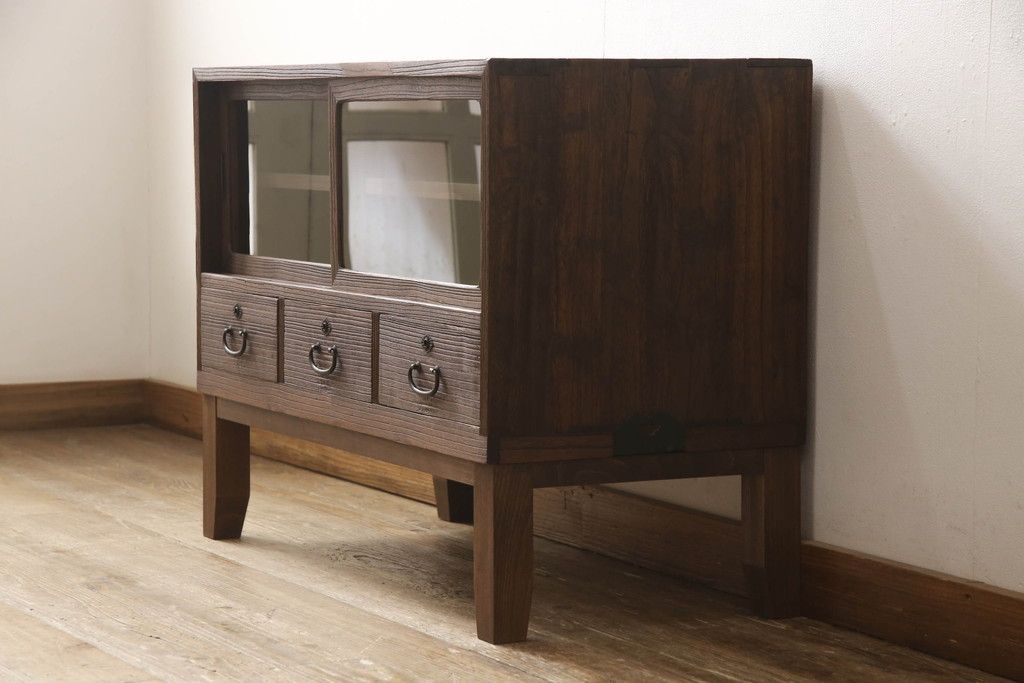 桐箪笥をローボードにリメイク!引き戸にクリアガラスをはめ込み、引手を取り付け。既存の棚板を撤去し新たな棚下を製作、脚を取り付け。オーク系に着色して仕上げ。