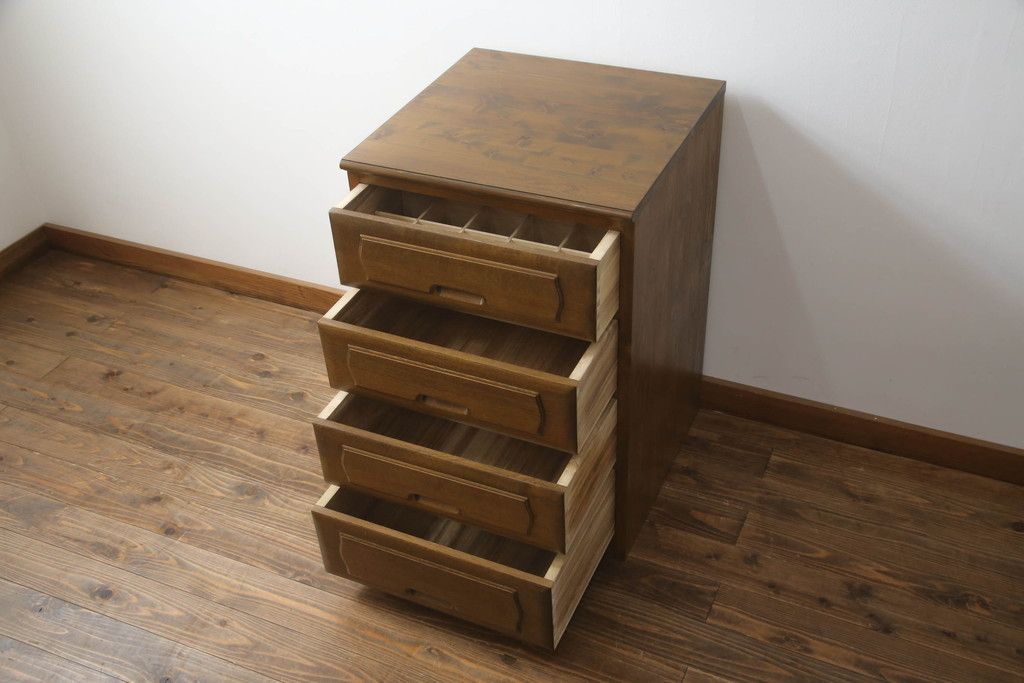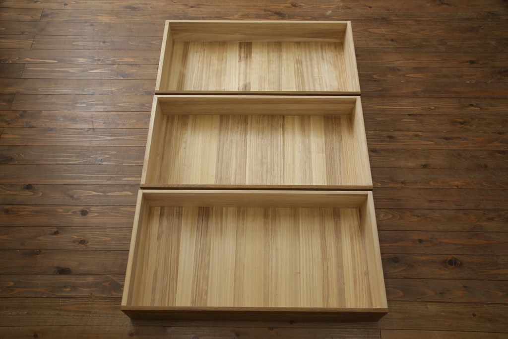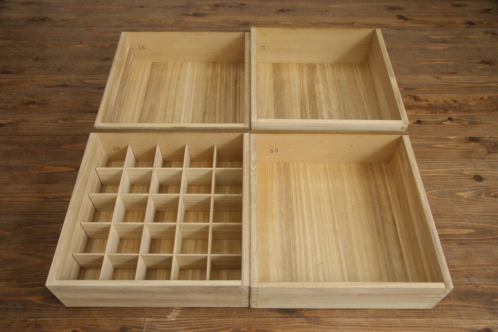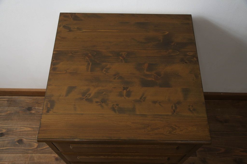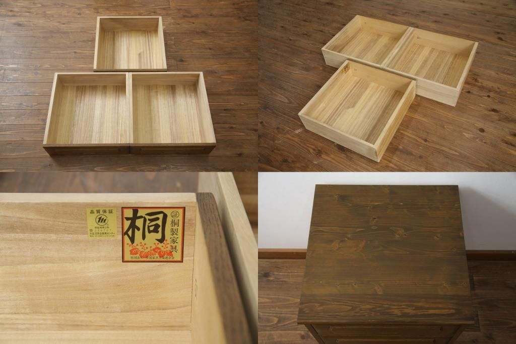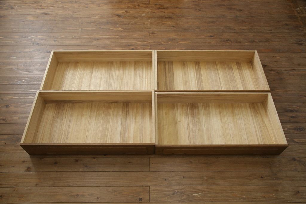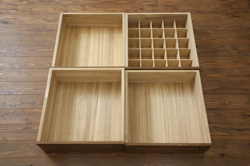 重ね箪笥を4つのチェストにリメイク!元の引き出しのセパレート部分を縦に分割。それぞれ天板、側面、台輪を付けて小さなチェストに。ワントーン落ち着いた色に着色仕上げ。