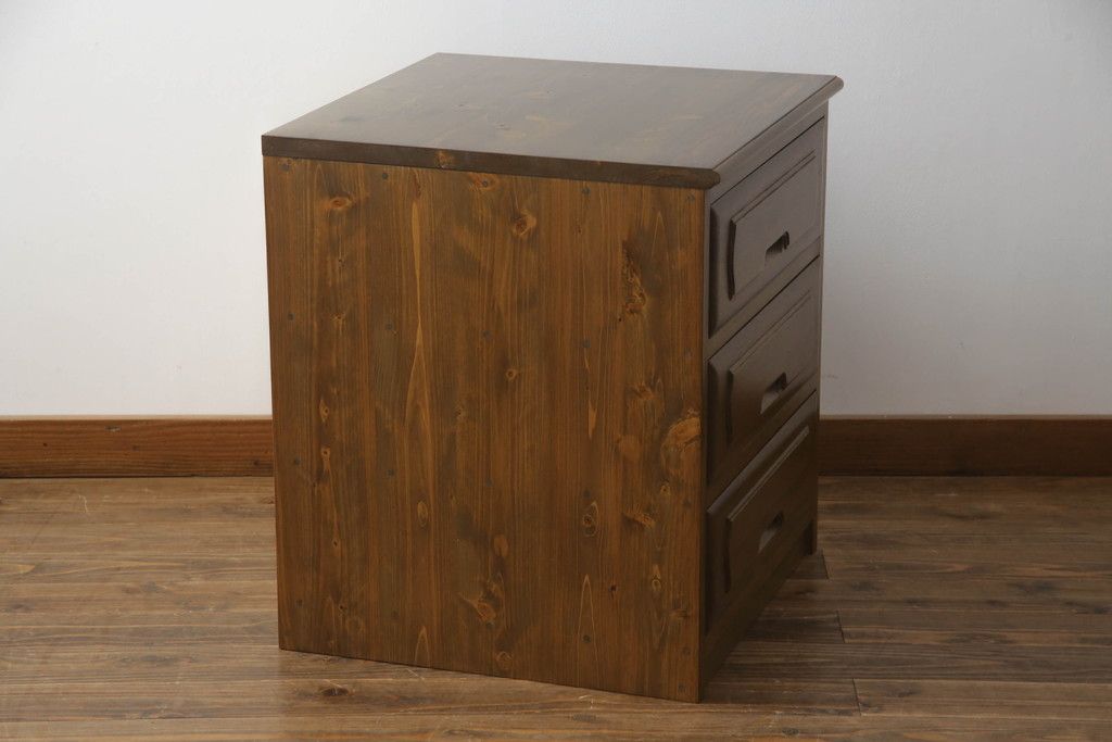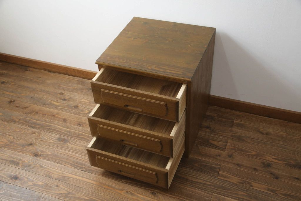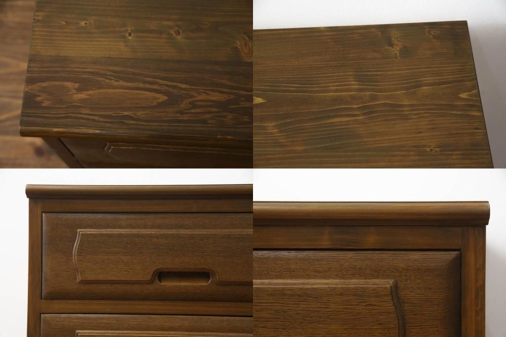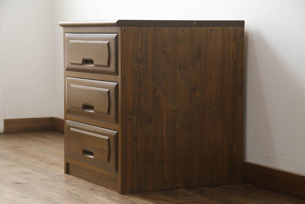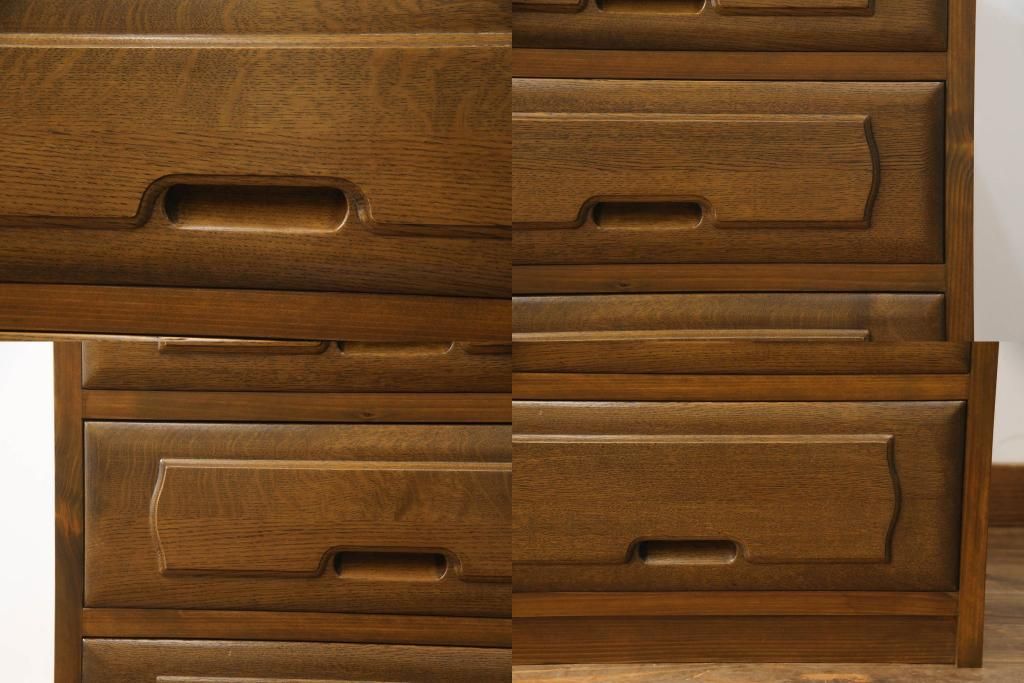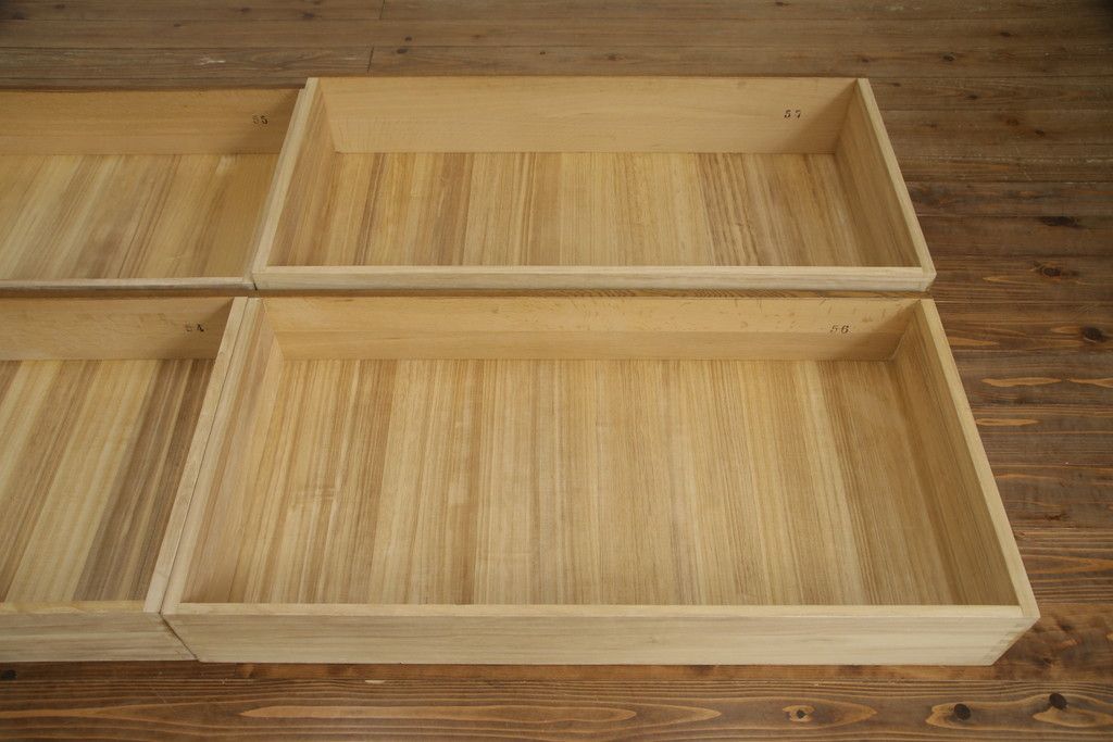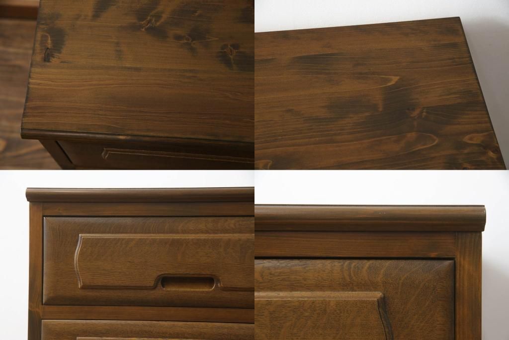 重ね箪笥を4つのチェストにリメイク!元の引き出しのセパレート部分を縦に分割。それぞれ天板、側面、台輪を付けて小さなチェストに。ワントーン落ち着いた色に着色仕上げ。