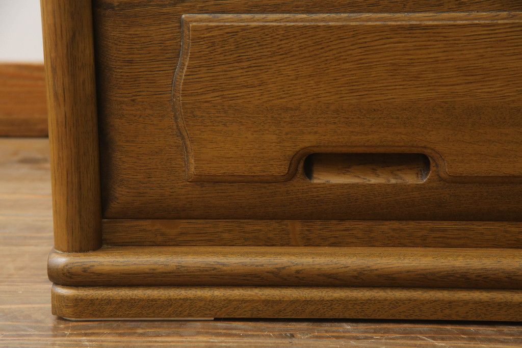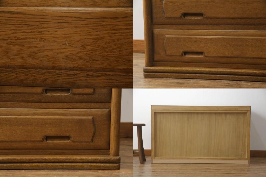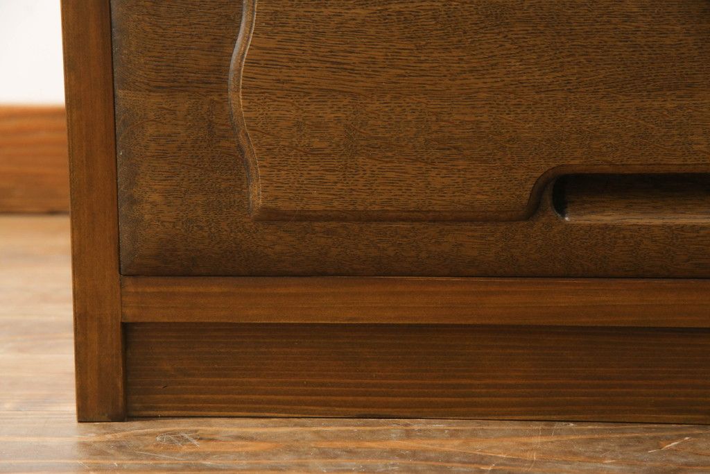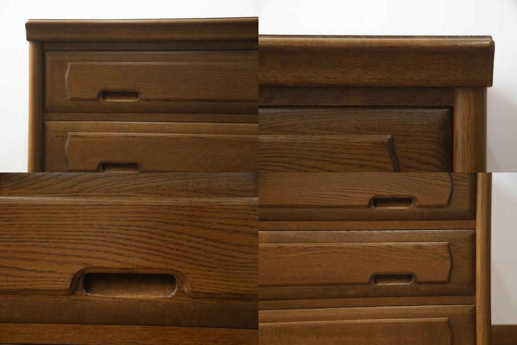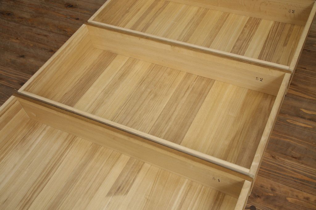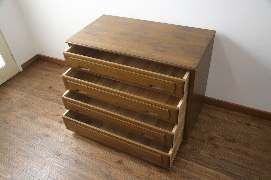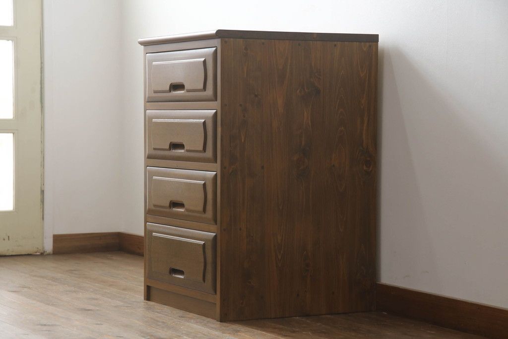 重ね箪笥を4つのチェストにリメイク!元の引き出しのセパレート部分を縦に分割。それぞれ天板、側面、台輪を付けて小さなチェストに。ワントーン落ち着いた色に着色仕上げ。