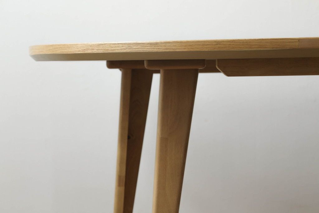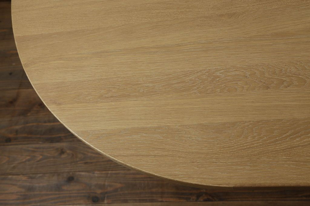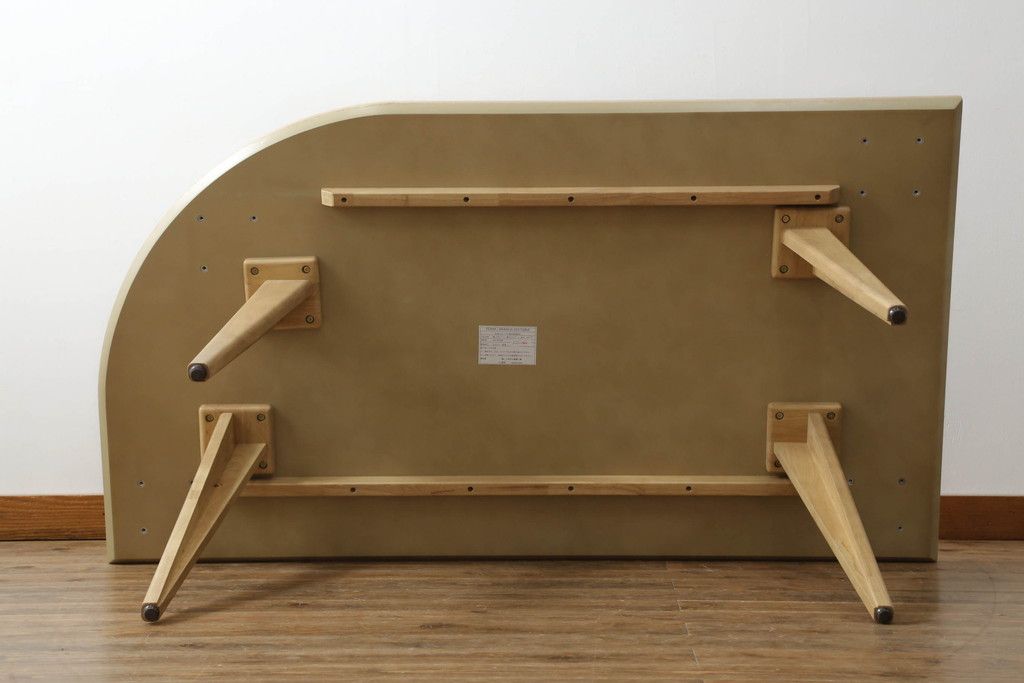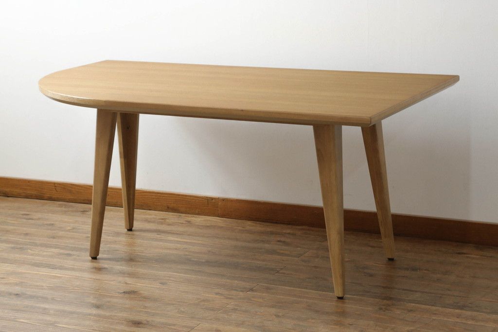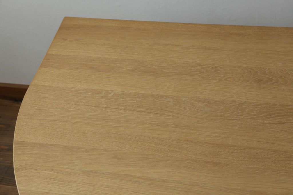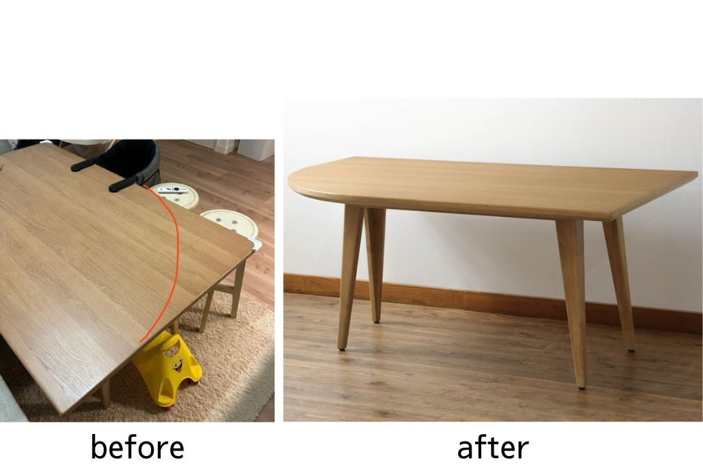 ダイニングテーブルの角1か所を丸くリメイク!指定の角を曲線にカットし、断面にオーク突板を張って仕上げ。それに合わせて脚を移設。