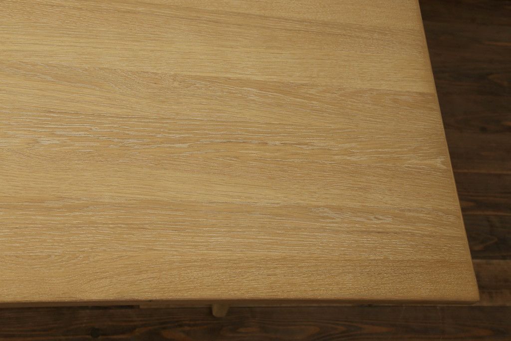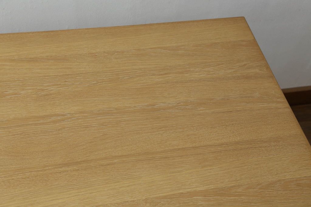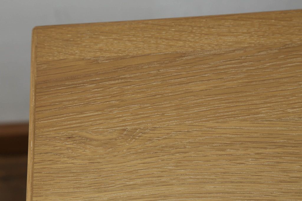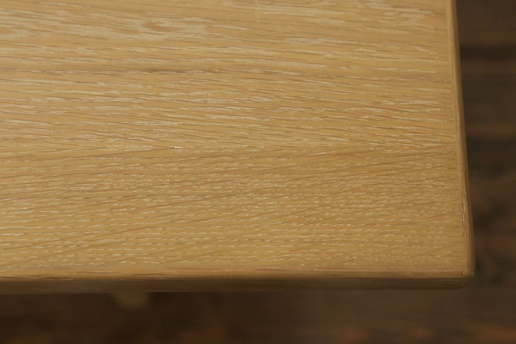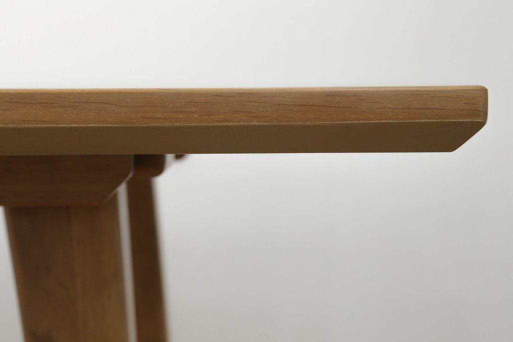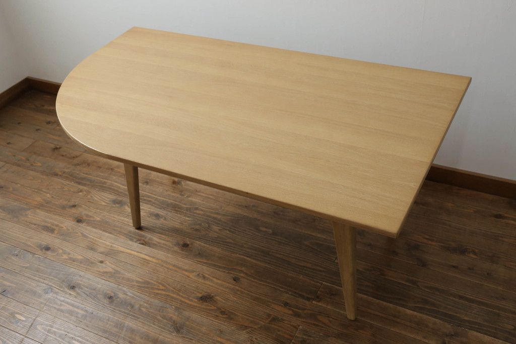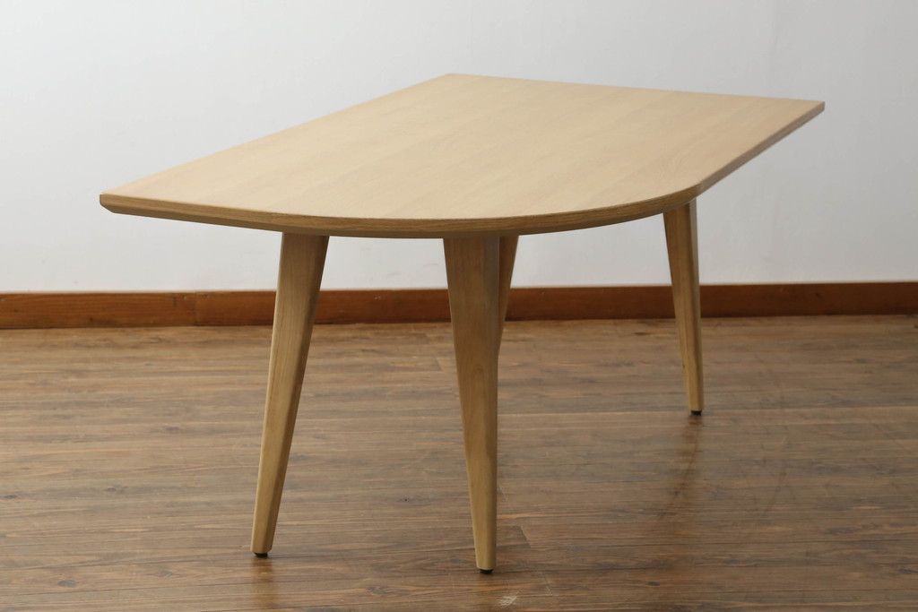 ダイニングテーブルの角1か所を丸くリメイク!指定の角を曲線にカットし、断面にオーク突板を張って仕上げ。それに合わせて脚を移設。