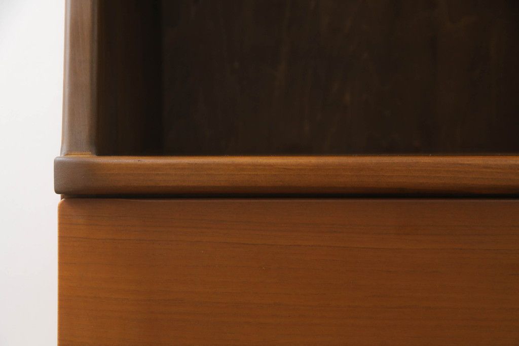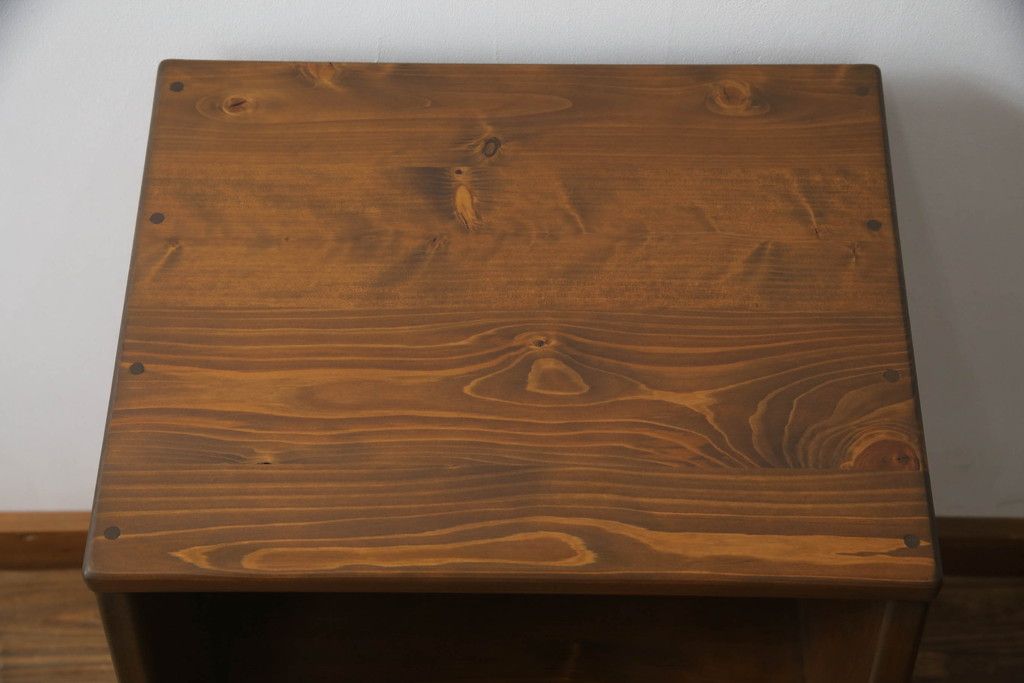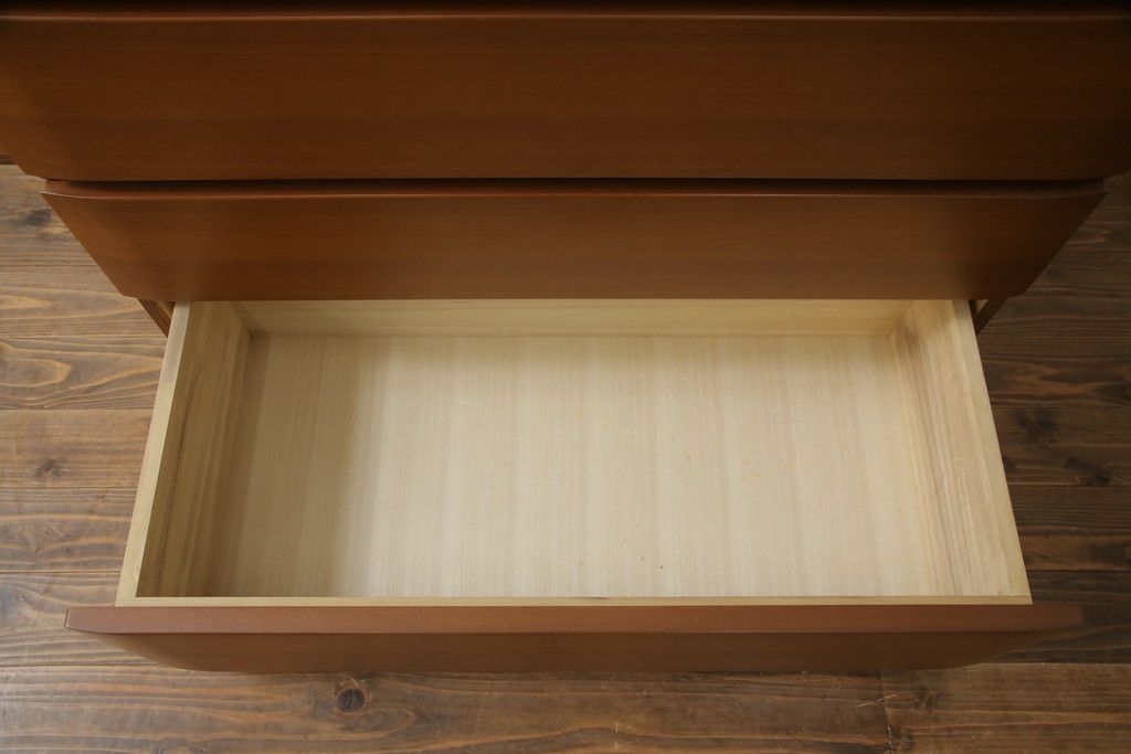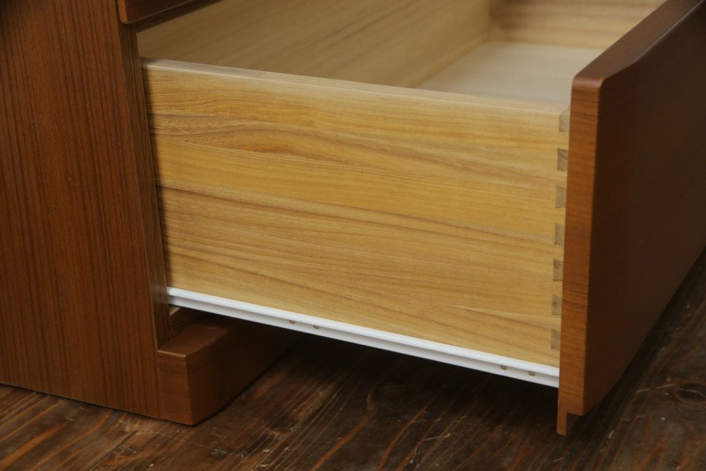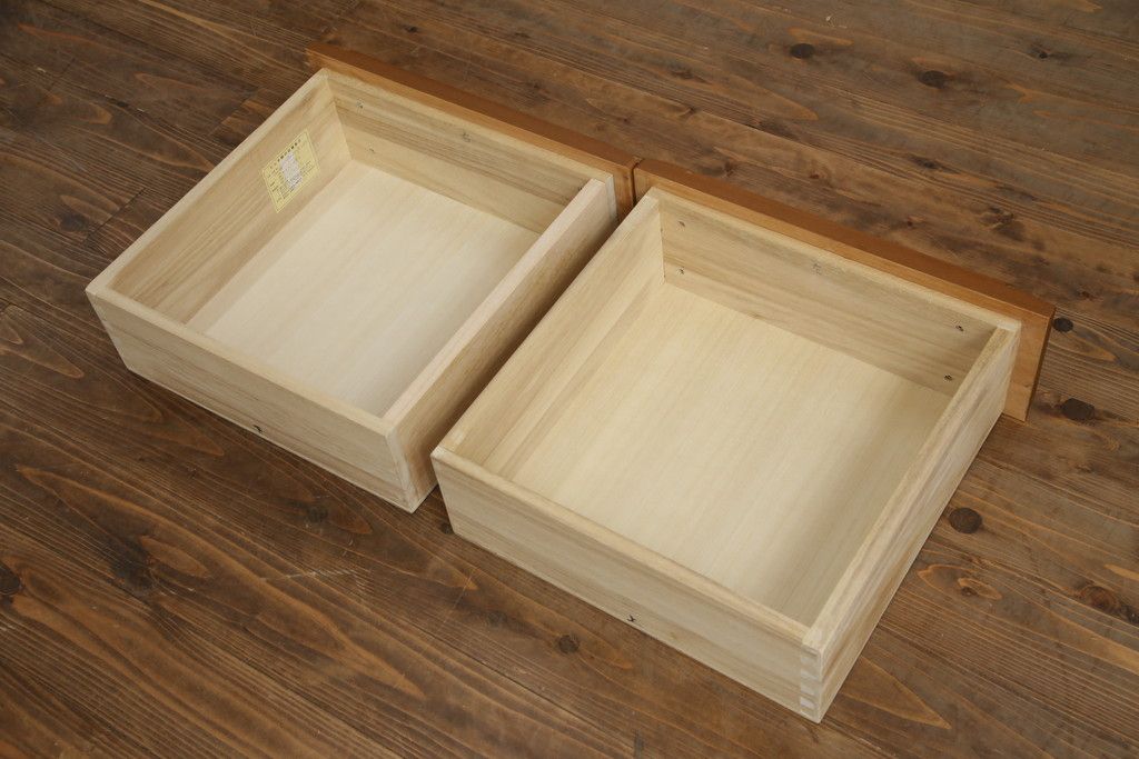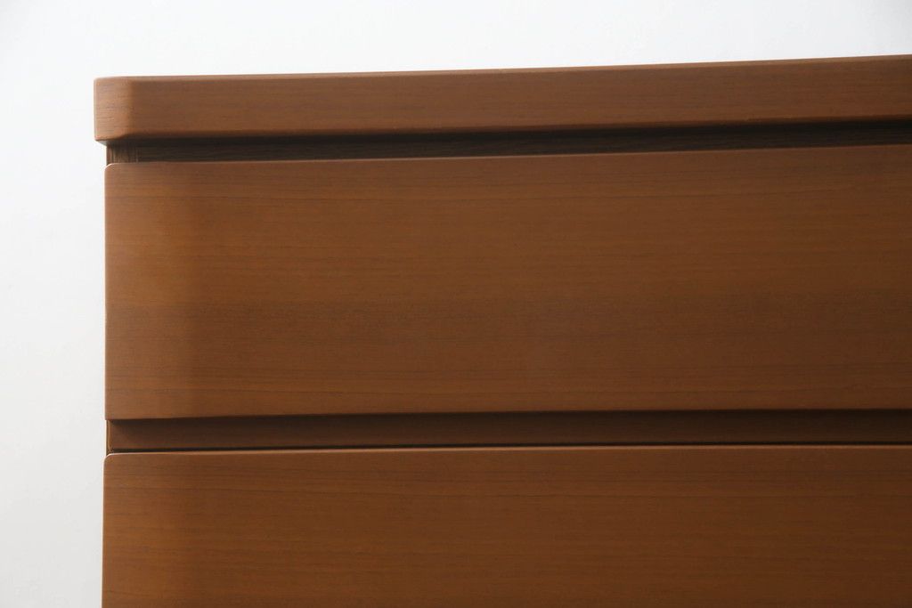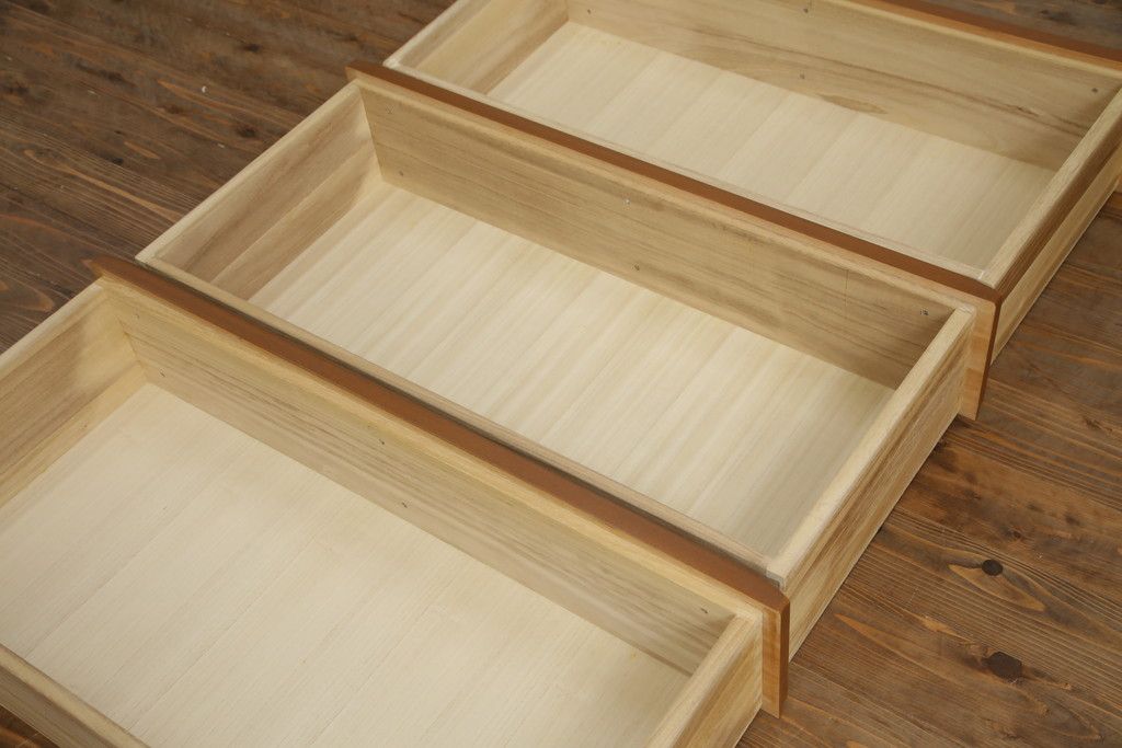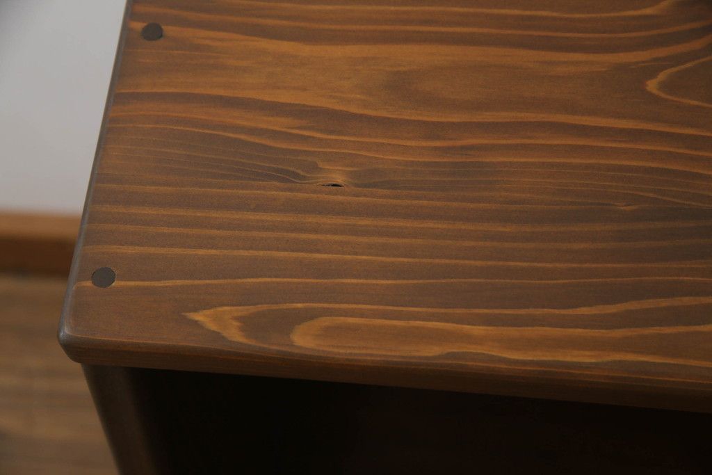箪笥をサイドキャビネットとチェストにリメイク!上部2杯は新たに制作したオープンラックの引き出しにし、サイドキャビネットに加工。下部4杯は箪笥の天板を移設し、チェストに。いずれも現状の色味をベースに着色仕上げ。