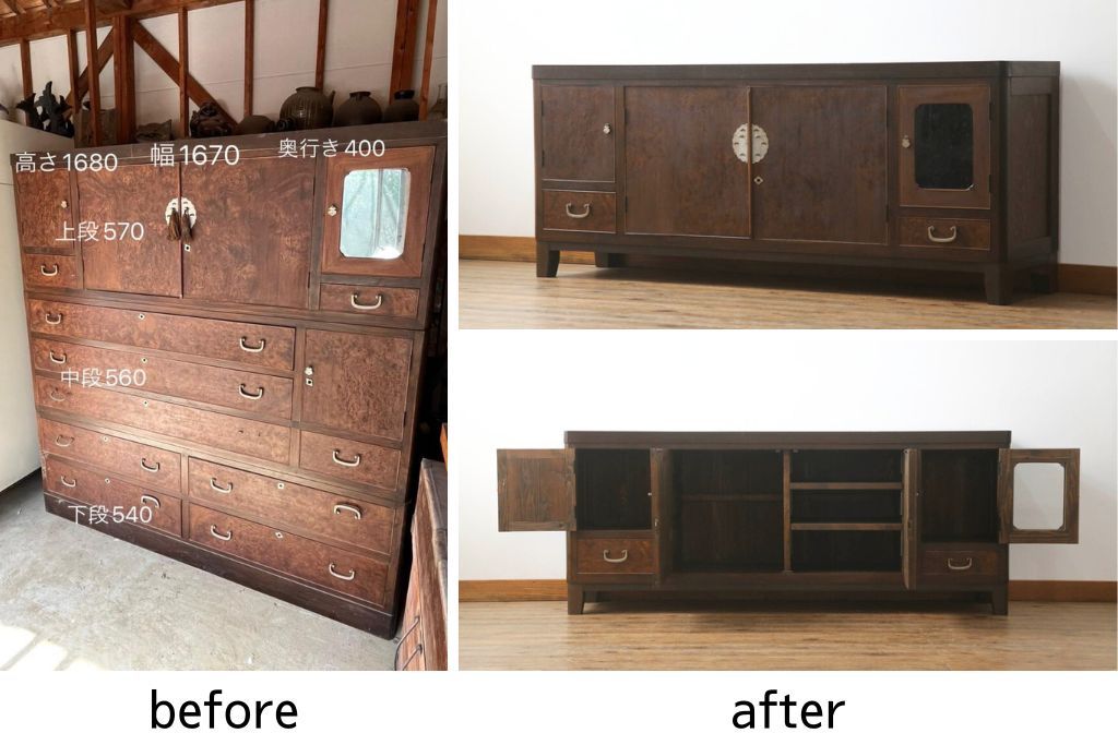 お客様持ち込みの三段重ね桐箪笥の上段をサイドボードにリメイク