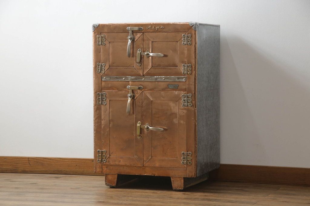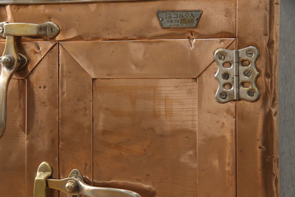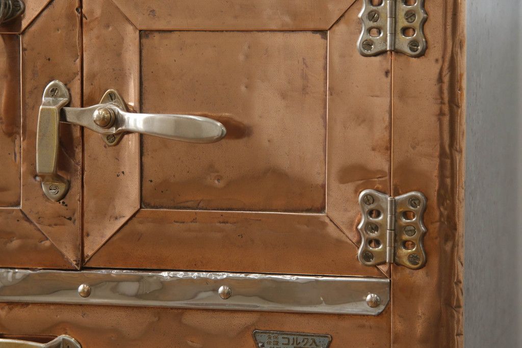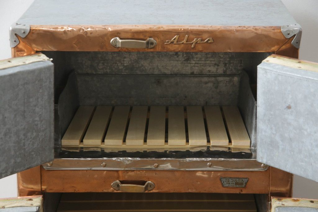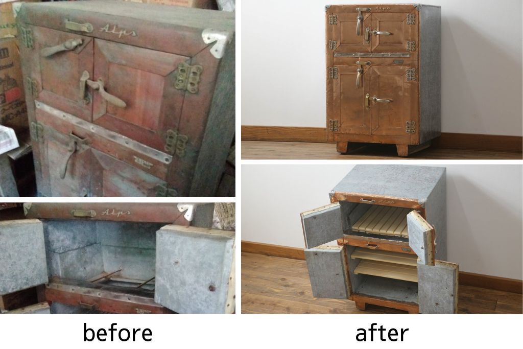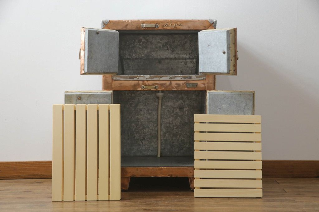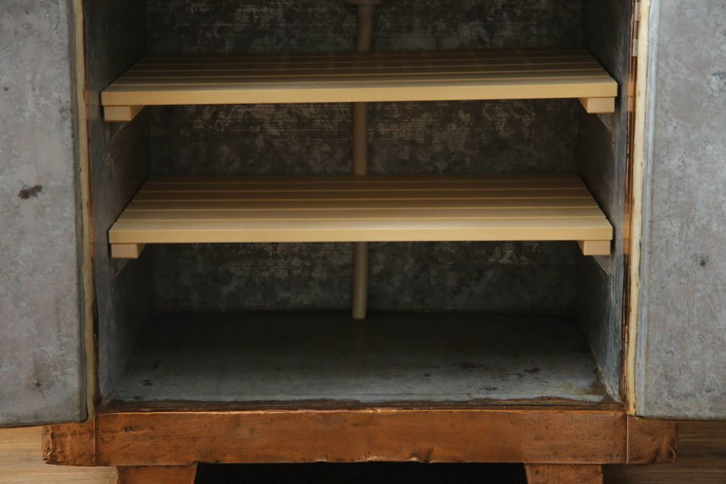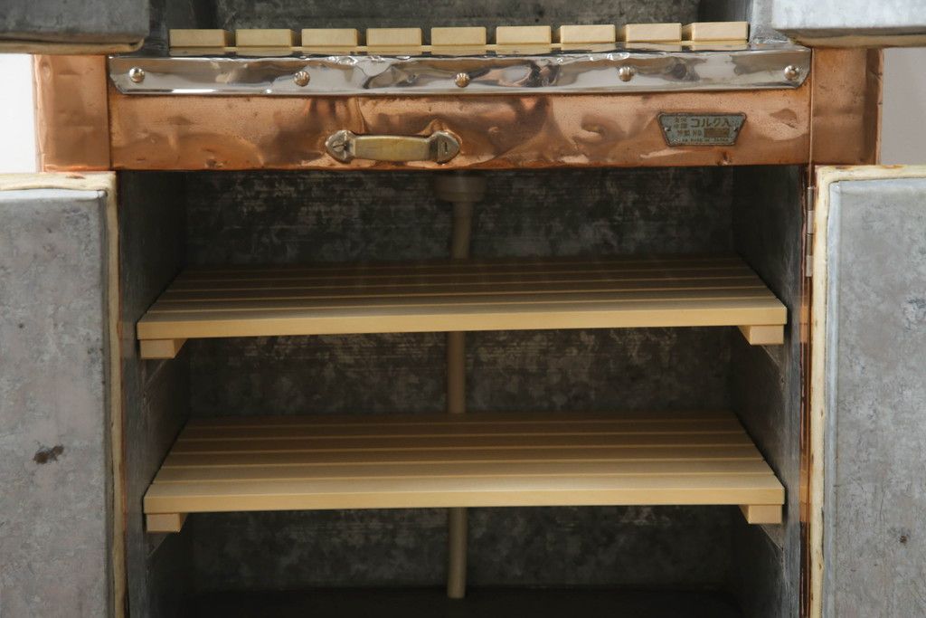 冷蔵庫を綺麗に再生!前面部分の銅を磨き、ヒバ材ですのこを製作。上段には底板・下段には棚板として設置。