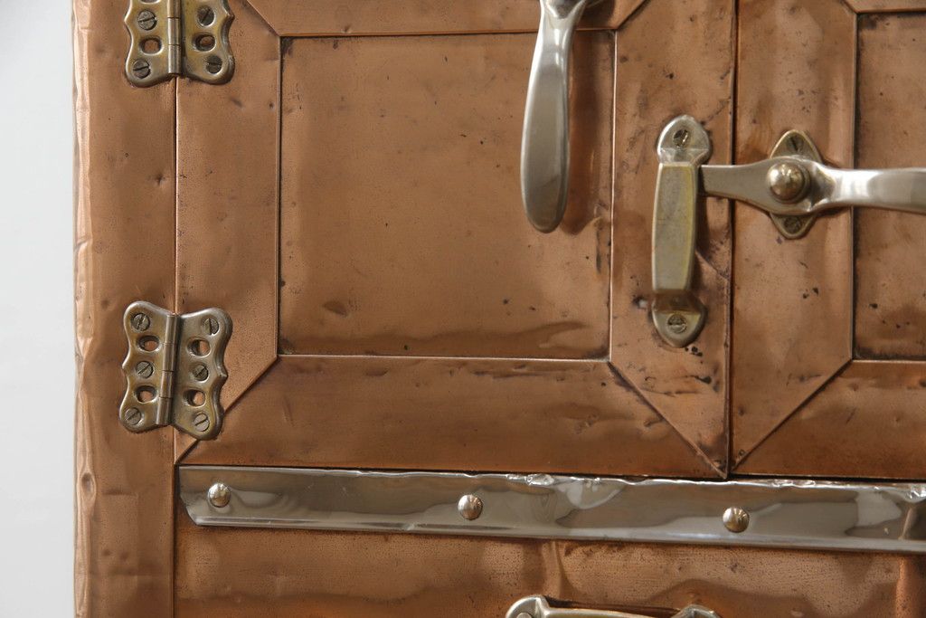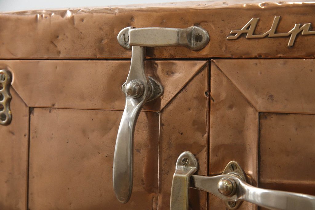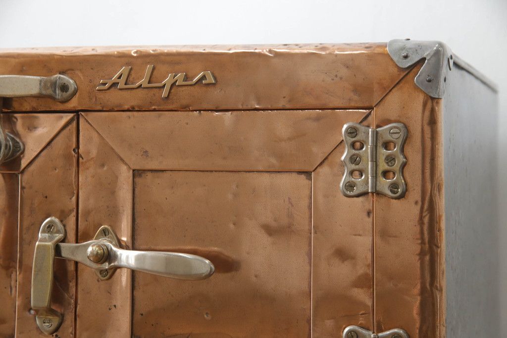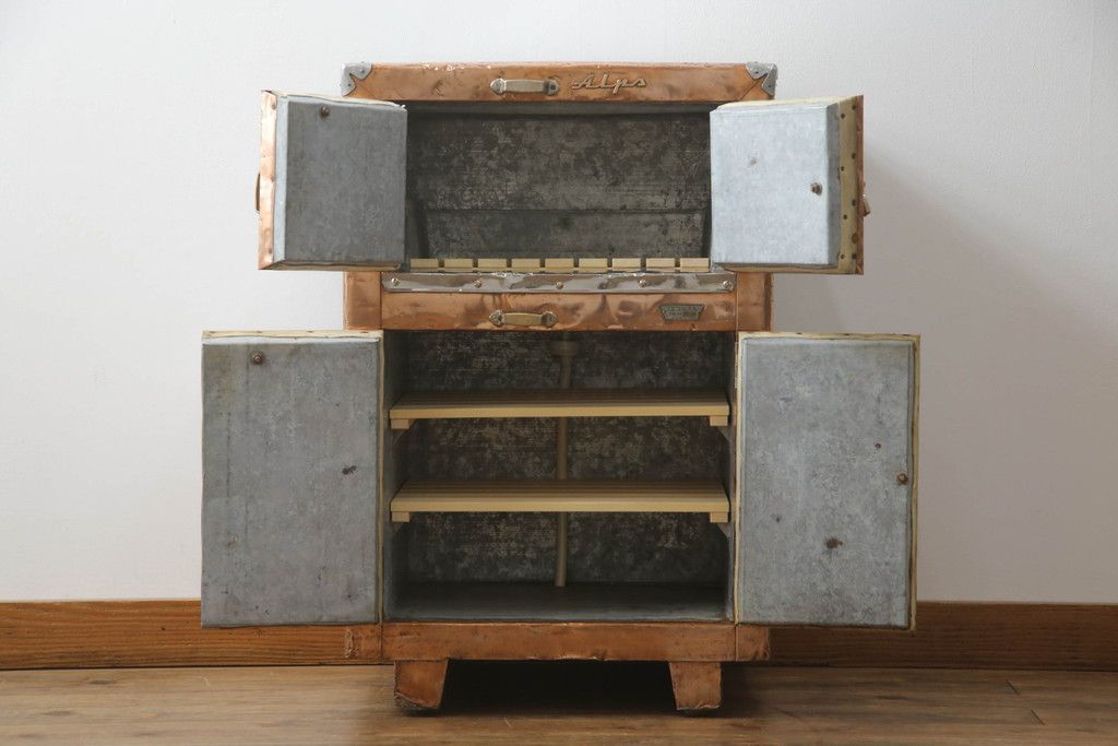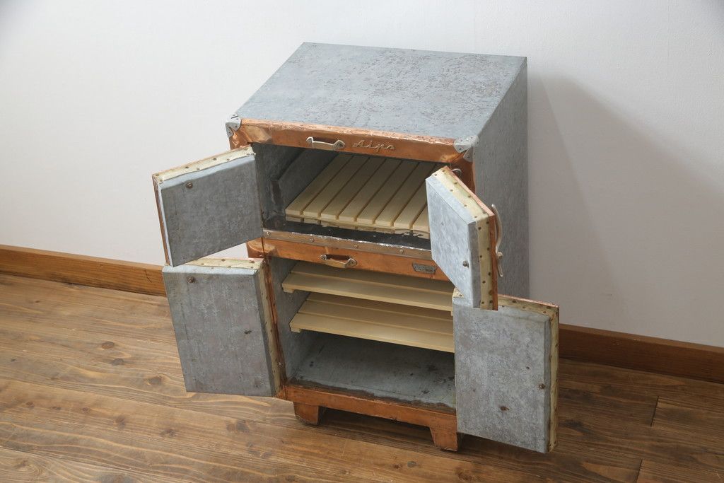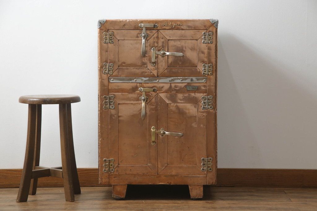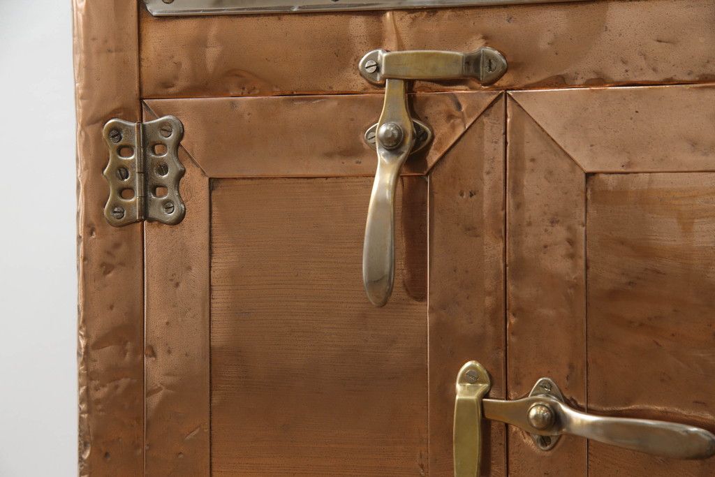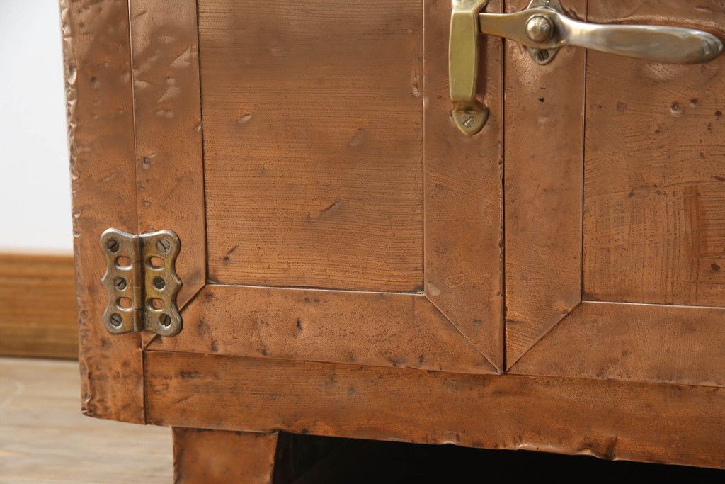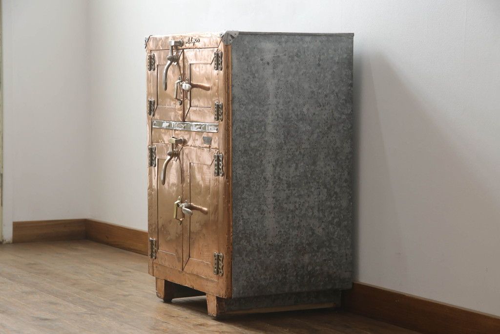 冷蔵庫を綺麗に再生!前面部分の銅を磨き、ヒバ材ですのこを製作。上段には底板・下段には棚板として設置。